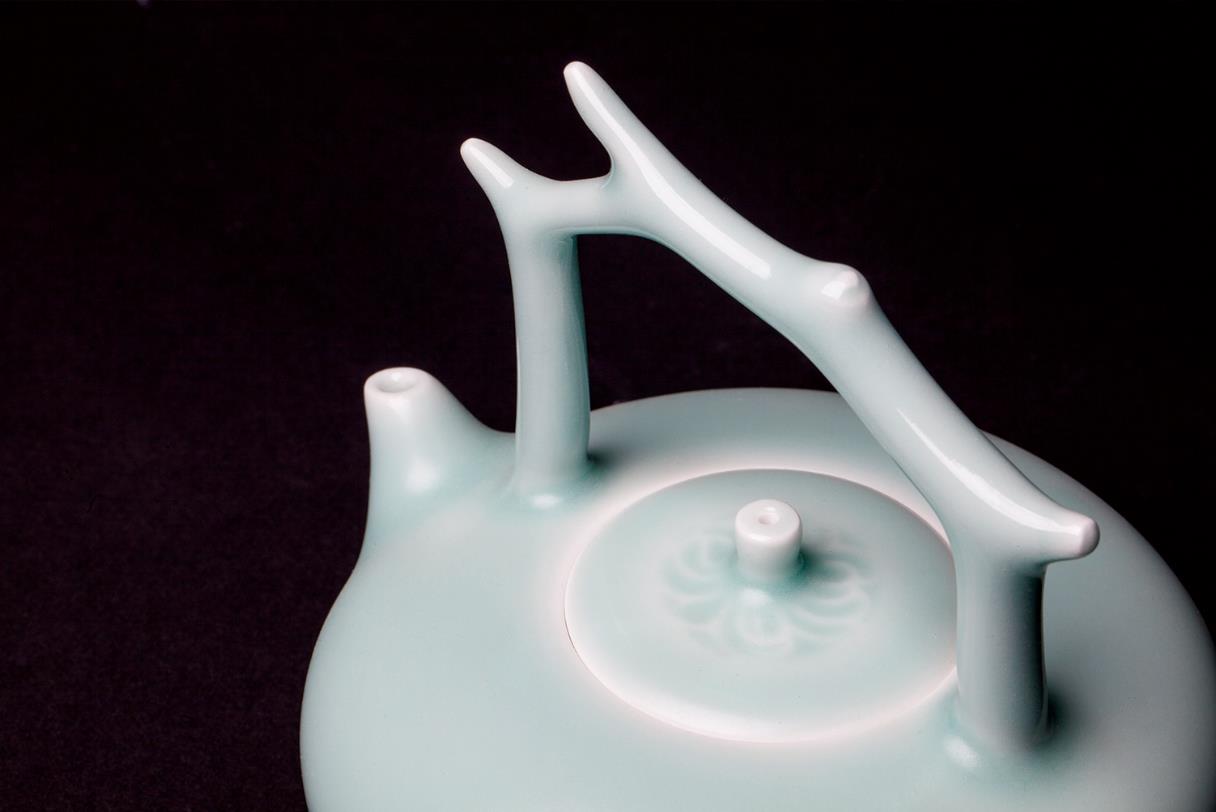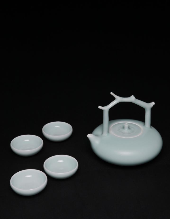 此套茶具的设计理念融入了传统紫砂提梁壶的构思,充分发挥青瓷工艺的特色和优势,立意独特,构思精巧,别具一番格调和情趣。整体施粉青釉,通体珠圆玉润,清静自然,新颖优雅。这套意境深邃的现代青瓷茶具,传达的是“一片冰心在玉壶”的千古绝唱。