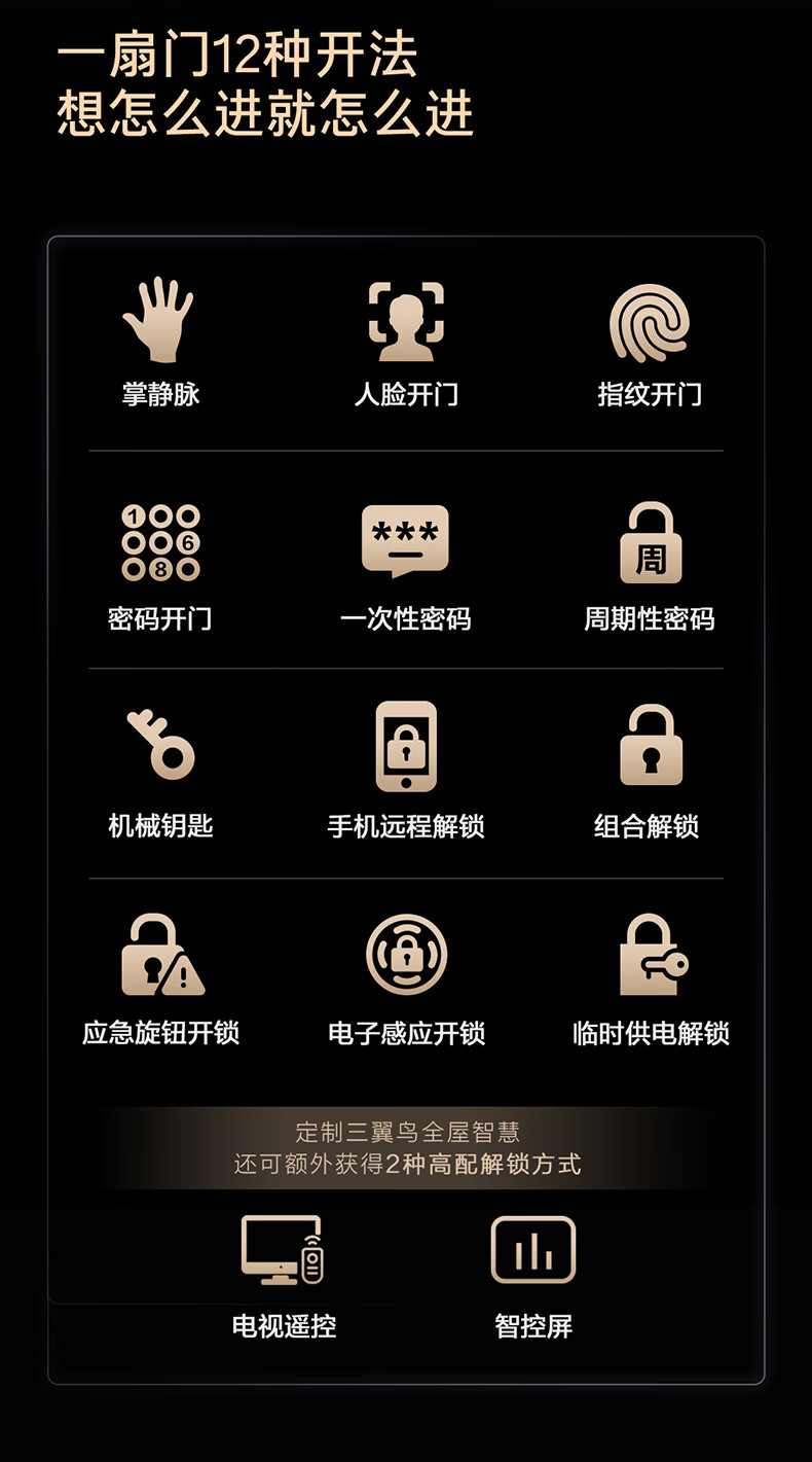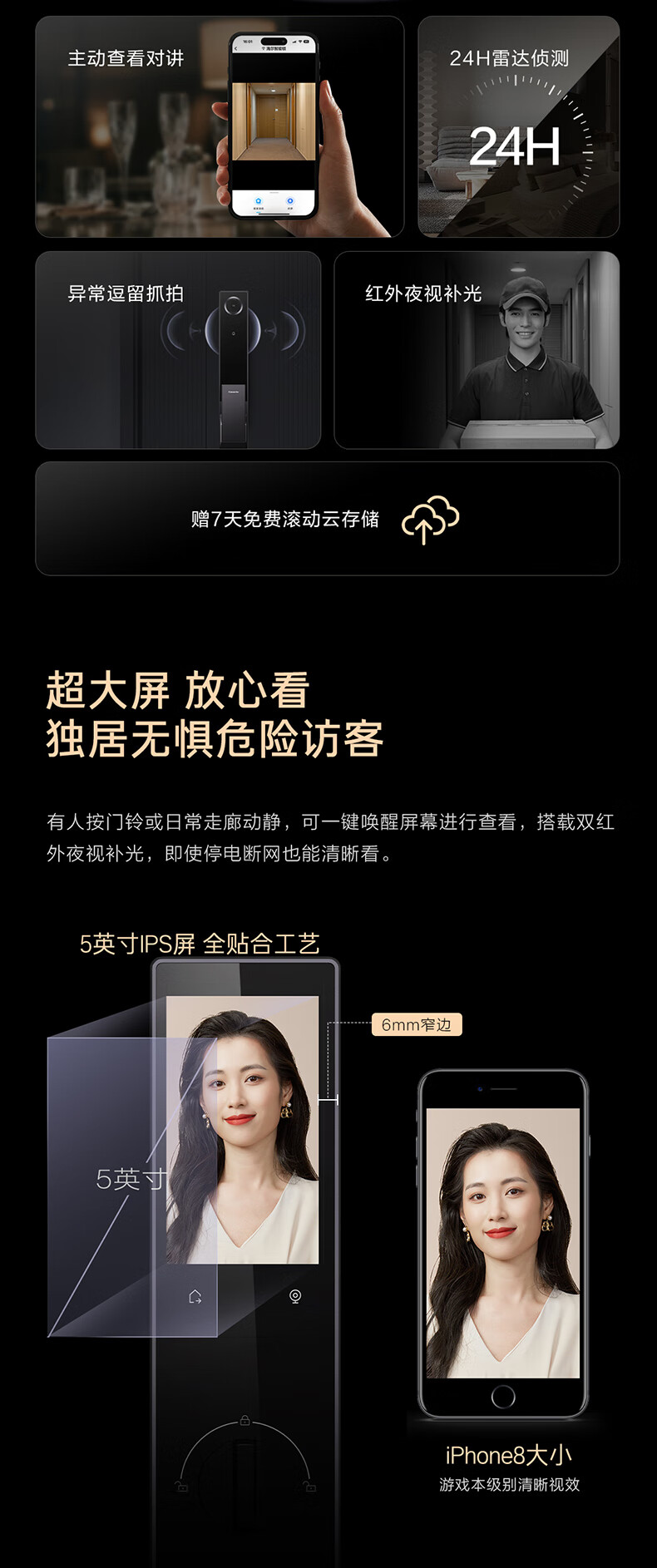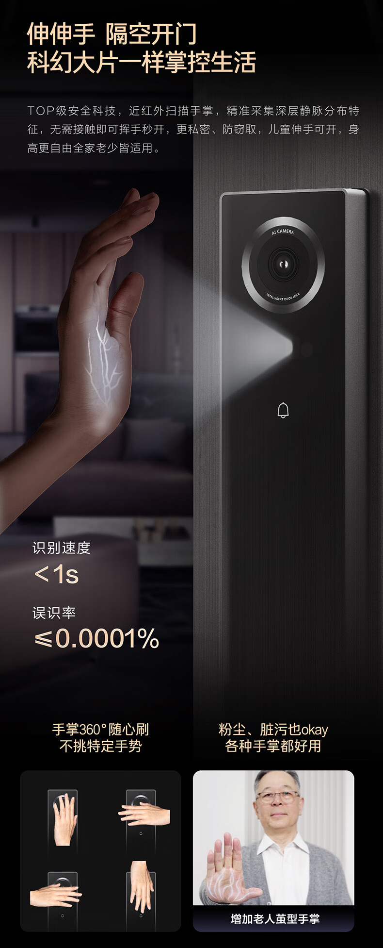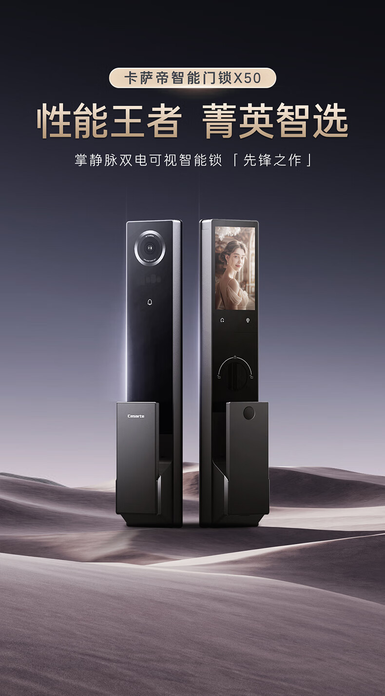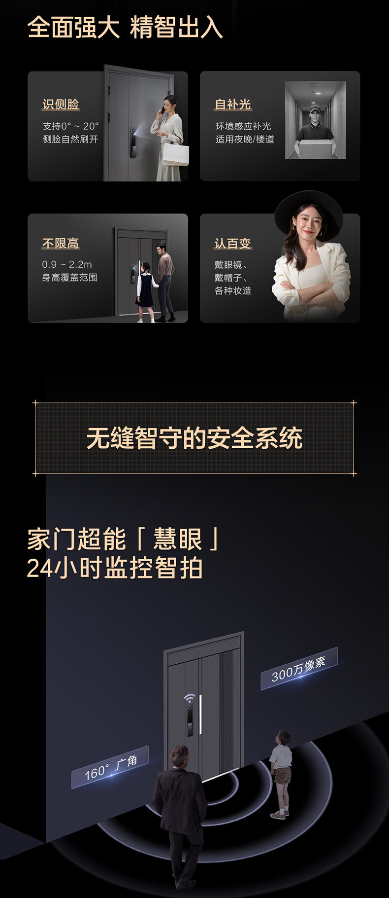 X50功能: 1.【猫眼大屏】高清猫眼摄像头300万像素,160°超大广角5英寸全贴合超大显示屏,光线透过率高达90%。 2.【全天看护】手机端可主动查看门外情况;长时间门外逗留,摄像头可抓拍视频。 3.【室外九大解锁方式】掌静脉解锁,人脸识别解锁,指纹解锁,密码解锁,APP远程解锁,临时密码解锁,远程周期密码解锁,机械钥匙解锁,组合解锁 4.【手机智控留言】用户可以通过手机向门锁发送自定义留言信息,同时设置播放给指定用户,帮助繁忙之下不能给家人带来陪伴之时,提升家庭成员幸福感。 5.【超长续航】双锂电池,超长续航。 6.【九重异常告警】1防撬报警,2试错报警,3低电压报警,4钥匙开锁告警,5虚掩报警,6门未关报警,7门外逗留报警,8离家守护报警,9胁 迫报警 7.【全屋智联】一键布防,主动布景,跟其他智能设备联动。 8.【人性化设计】远程全功能OTA升级;应急供电,贴心的夜间静音免打扰模式,铝合金一体化铸造成型+面板钢化玻璃触摸按键区。
