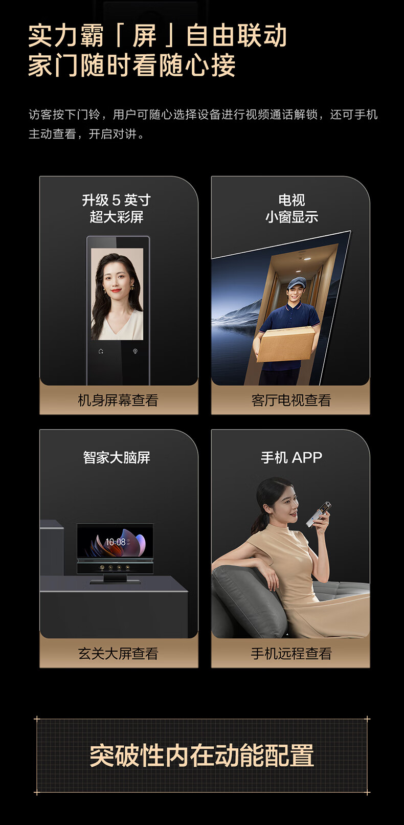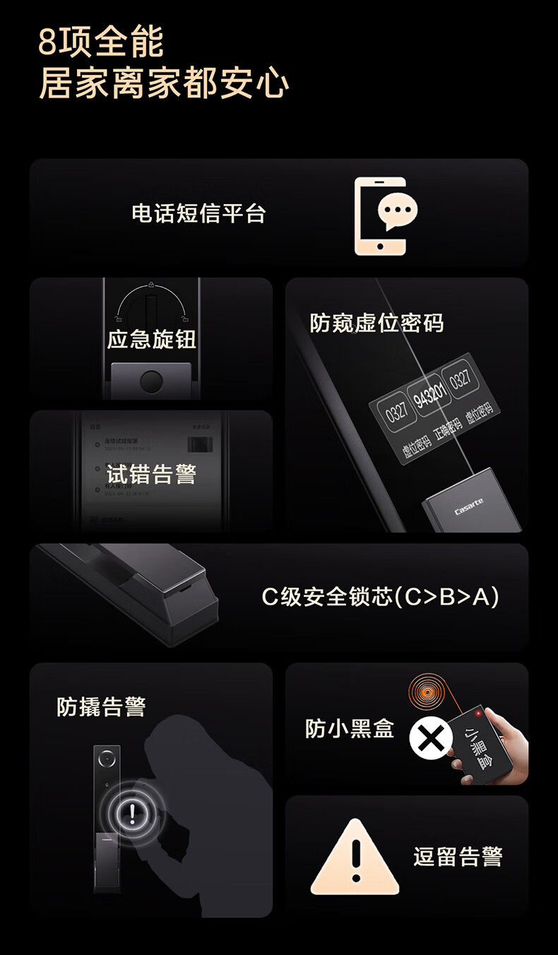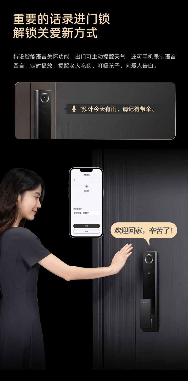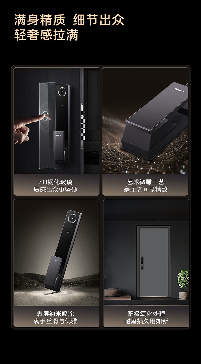 X50功能: 1.【猫眼大屏】高清猫眼摄像头300万像素,160°超大广角5英寸全贴合超大显示屏,光线透过率高达90%。 2.【全天看护】手机端可主动查看门外情况;长时间门外逗留,摄像头可抓拍视频。 3.【室外九大解锁方式】掌静脉解锁,人脸识别解锁,指纹解锁,密码解锁,APP远程解锁,临时密码解锁,远程周期密码解锁,机械钥匙解锁,组合解锁 4.【手机智控留言】用户可以通过手机向门锁发送自定义留言信息,同时设置播放给指定用户,帮助繁忙之下不能给家人带来陪伴之时,提升家庭成员幸福感。 5.【超长续航】双锂电池,超长续航。 6.【九重异常告警】1防撬报警,2试错报警,3低电压报警,4钥匙开锁告警,5虚掩报警,6门未关报警,7门外逗留报警,8离家守护报警,9胁 迫报警 7.【全屋智联】一键布防,主动布景,跟其他智能设备联动。 8.【人性化设计】远程全功能OTA升级;应急供电,贴心的夜间静音免打扰模式,铝合金一体化铸造成型+面板钢化玻璃触摸按键区。