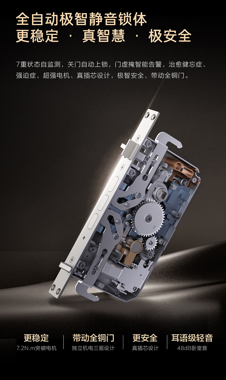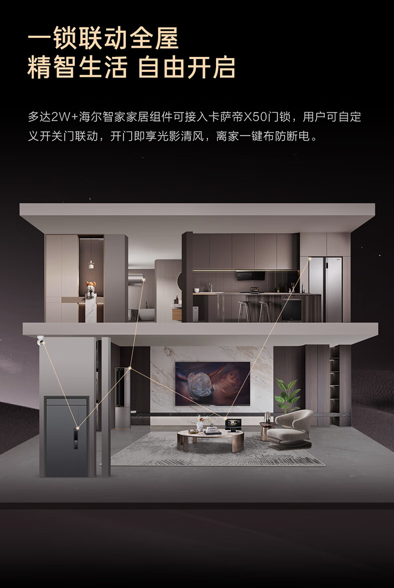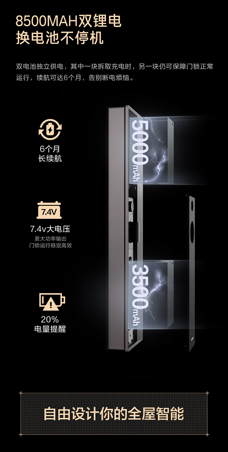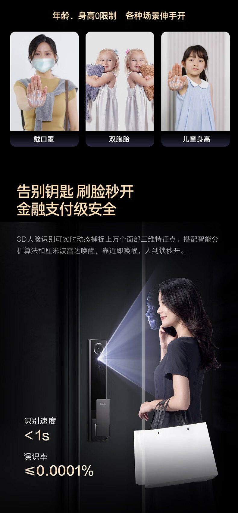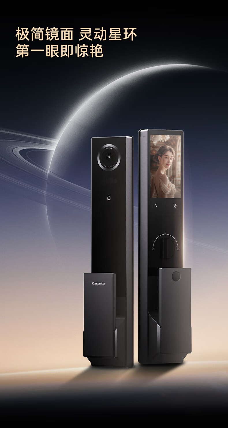 X50功能: 1.【猫眼大屏】高清猫眼摄像头300万像素,160°超大广角5英寸全贴合超大显示屏,光线透过率高达90%。 2.【全天看护】手机端可主动查看门外情况;长时间门外逗留,摄像头可抓拍视频。 3.【室外九大解锁方式】掌静脉解锁,人脸识别解锁,指纹解锁,密码解锁,APP远程解锁,临时密码解锁,远程周期密码解锁,机械钥匙解锁,组合解锁 4.【手机智控留言】用户可以通过手机向门锁发送自定义留言信息,同时设置播放给指定用户,帮助繁忙之下不能给家人带来陪伴之时,提升家庭成员幸福感。 5.【超长续航】双锂电池,超长续航。 6.【九重异常告警】1防撬报警,2试错报警,3低电压报警,4钥匙开锁告警,5虚掩报警,6门未关报警,7门外逗留报警,8离家守护报警,9胁 迫报警 7.【全屋智联】一键布防,主动布景,跟其他智能设备联动。 8.【人性化设计】远程全功能OTA升级;应急供电,贴心的夜间静音免打扰模式,铝合金一体化铸造成型+面板钢化玻璃触摸按键区。