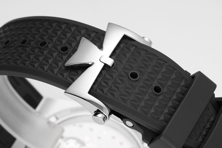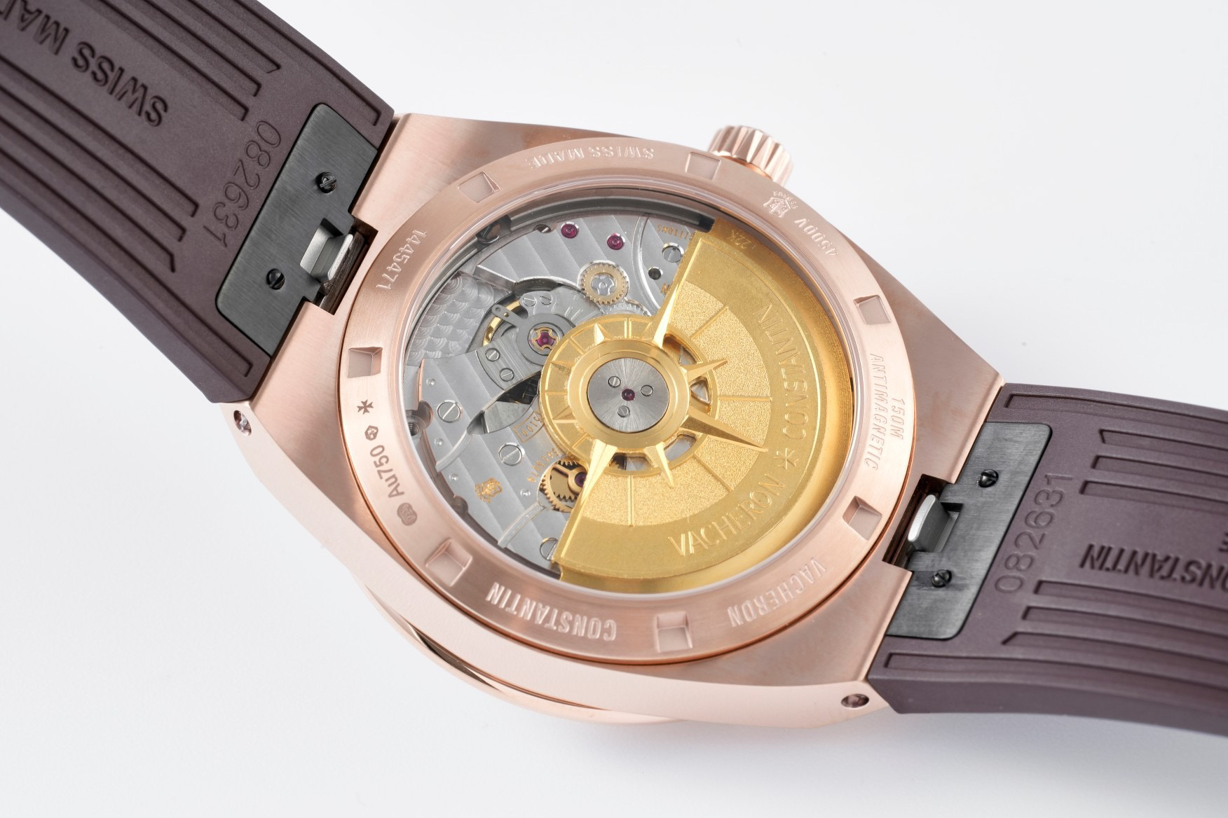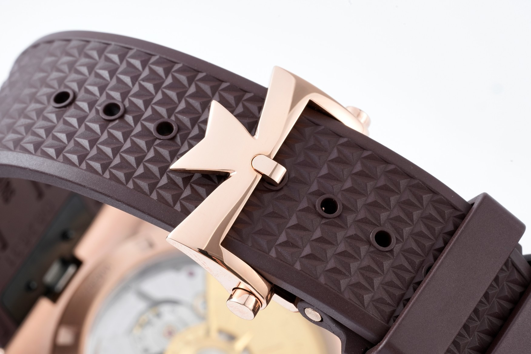 【机芯】采用背透工艺设计,可直接观察机芯的运作。搭载由ZF自行研发并制造对标江诗丹顿的5100自动上链机械机芯,包含172个零件,宝石数37颗,振频28,800次/小时(4赫兹),配备22K金质摆陀(饰有风向玫瑰罗盘图案)