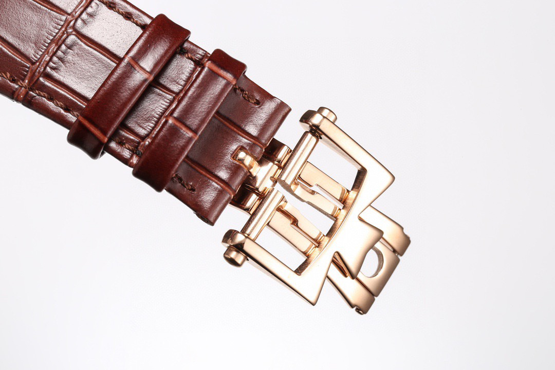 【表盘】简约的经旭日纹缎面拉丝处理水晶表盘,带有天鹅绒般光滑边缘,透过表盘可以看到指针在表盘上的倒影,宛如一潭清澈的湖水一般,十分美观。18K金时标、时针、分针均带有白色夜光涂层,近视在较暗的环境下也可以阅读时间,保证了佳可读性。