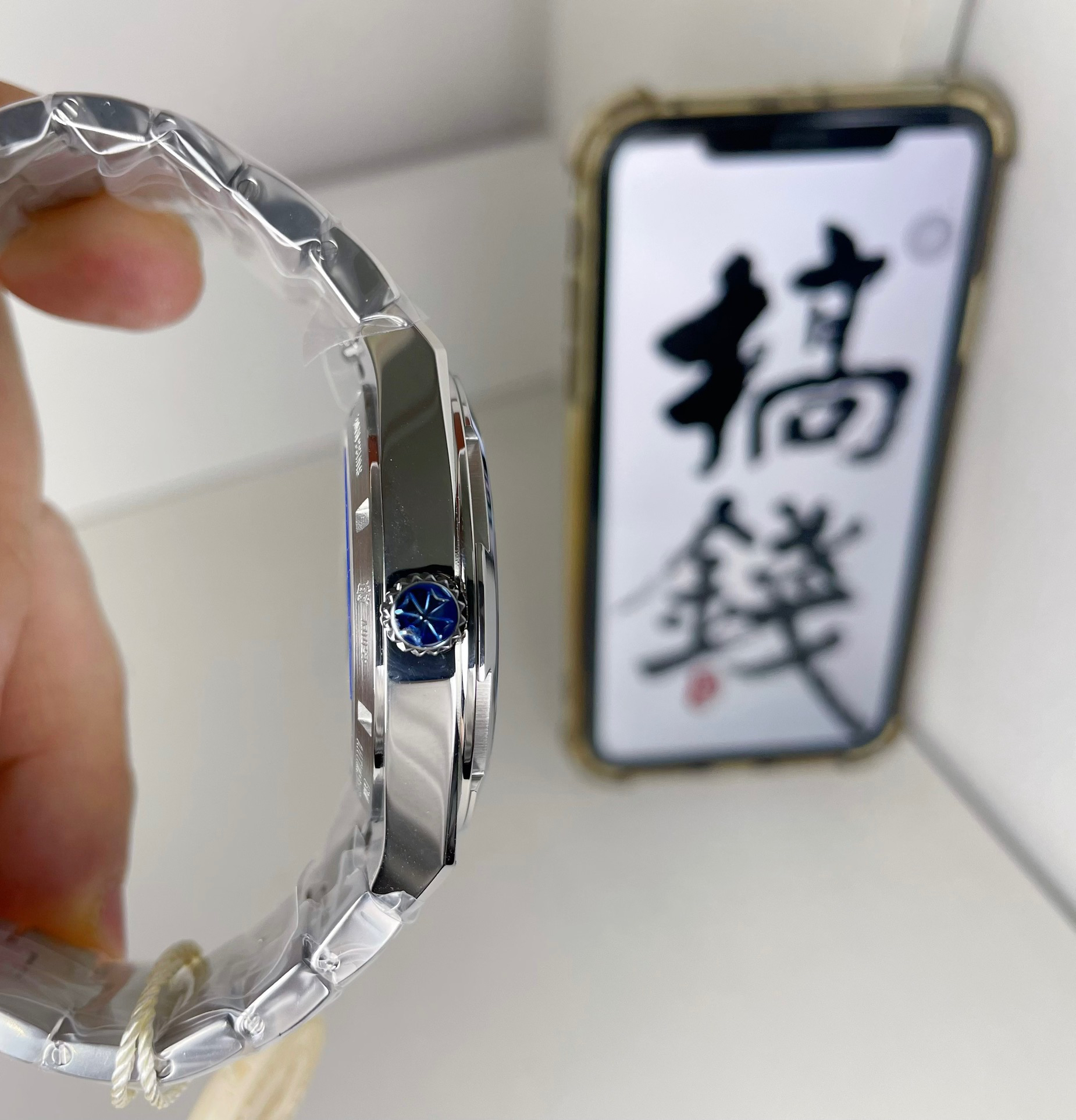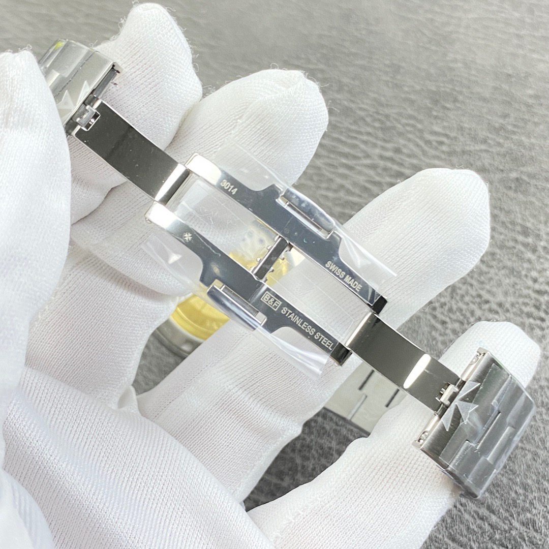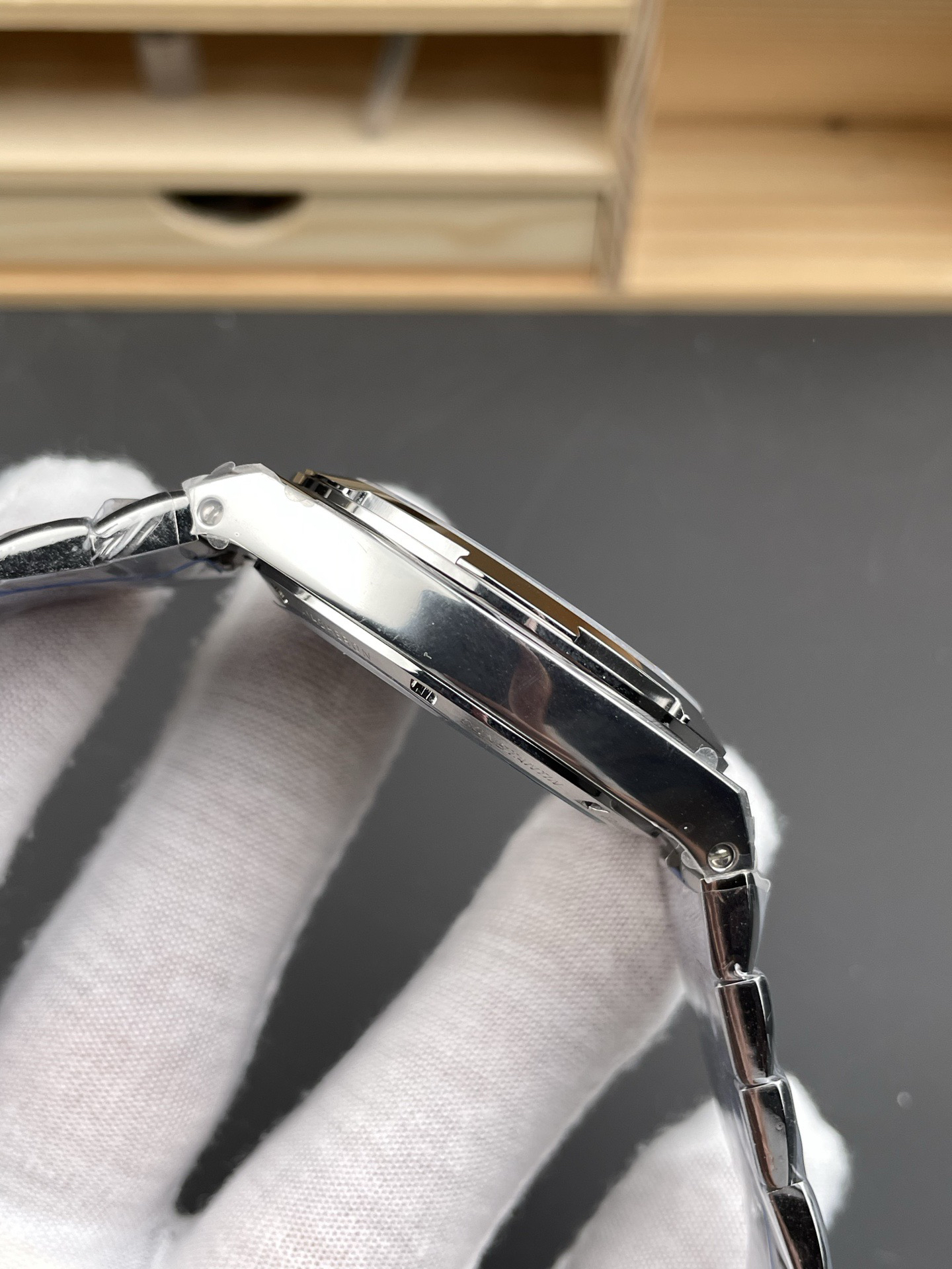 【表壳】41毫米不锈钢表壳,厚度11毫米。配有防磁软铁装置和旋入式表冠,能够保护腕表不受磁力的干扰,为走时的精准保驾护航。经过打磨的精钢表壳线条流畅,造型美观,可与表链/表带连接在一起,为腕表的观赏性加分。