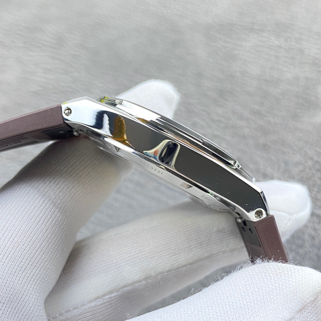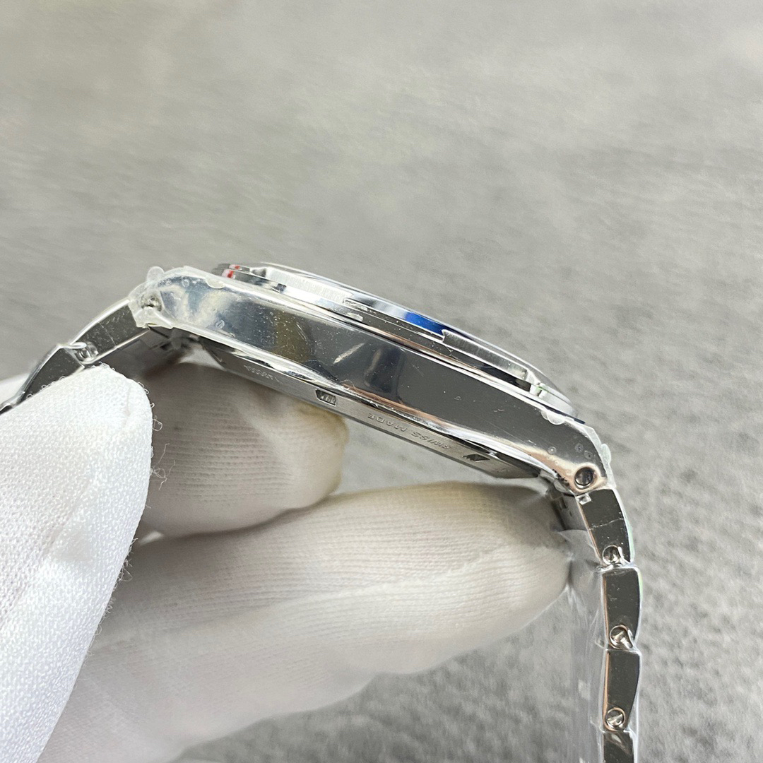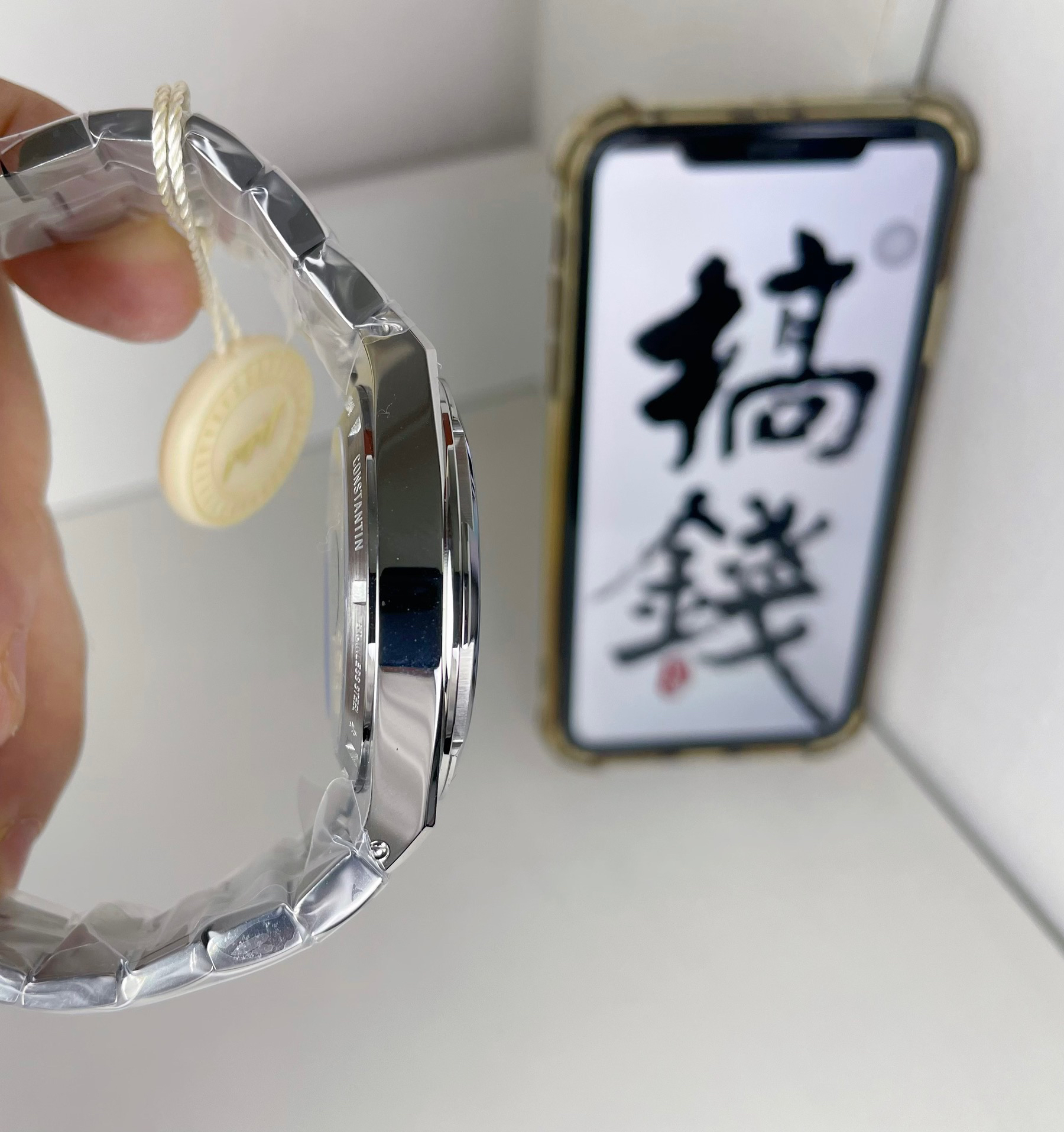 【表壳】41毫米不锈钢表壳,厚度11毫米。配有防磁软铁装置和旋入式表冠,能够保护腕表不受磁力的干扰,为走时的精准保驾护航。经过打磨的精钢表壳线条流畅,造型美观,可与表链/表带连接在一起,为腕表的观赏性加分。