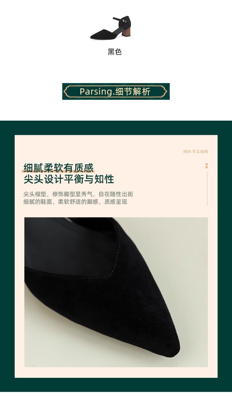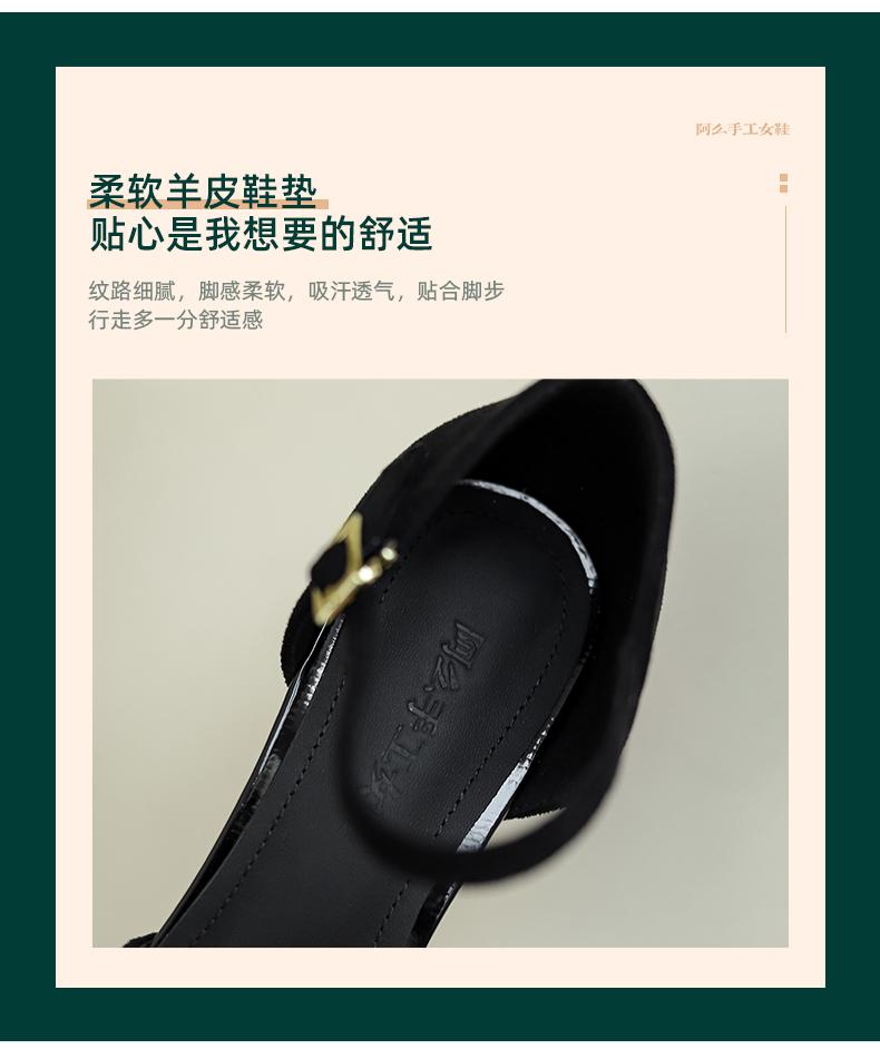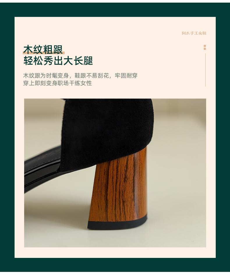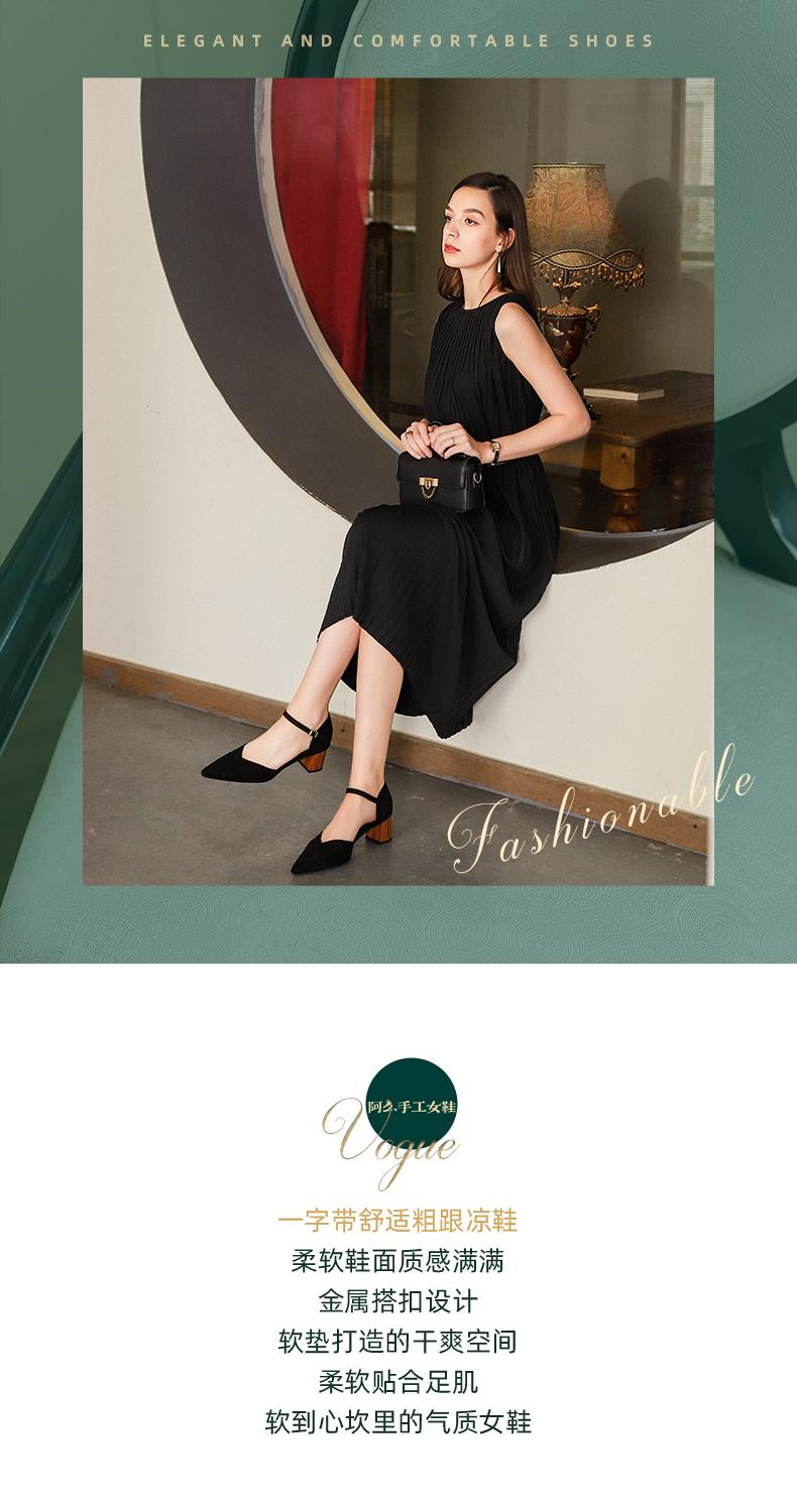 阿么手工女鞋2025新款气质黑色一字带包头凉鞋外穿复古木纹跟6CM