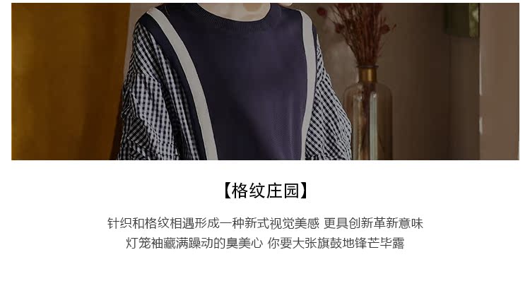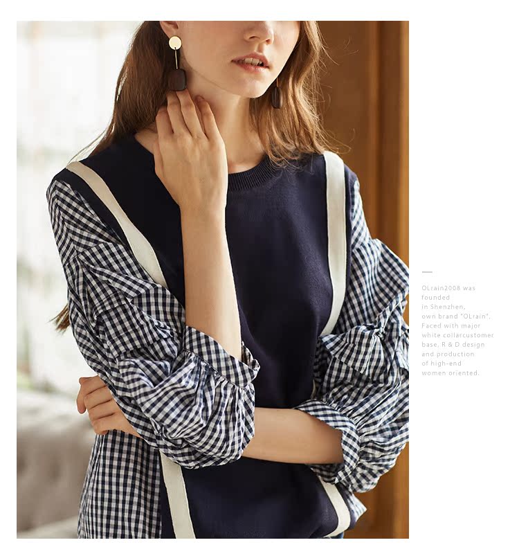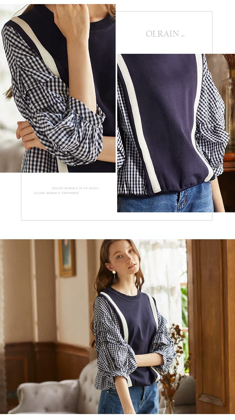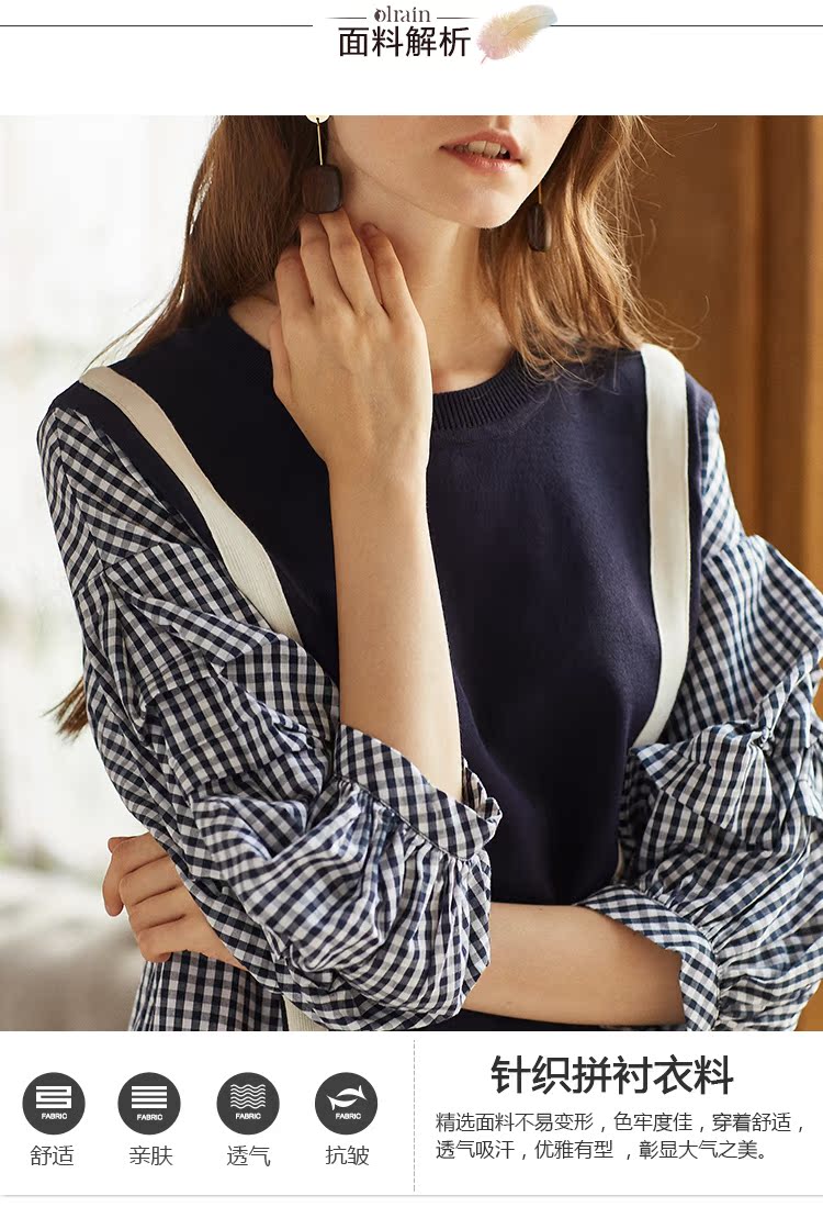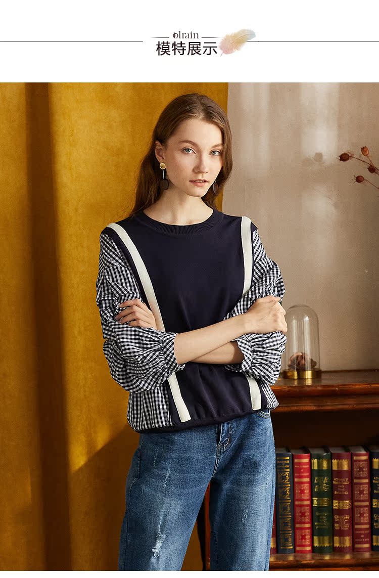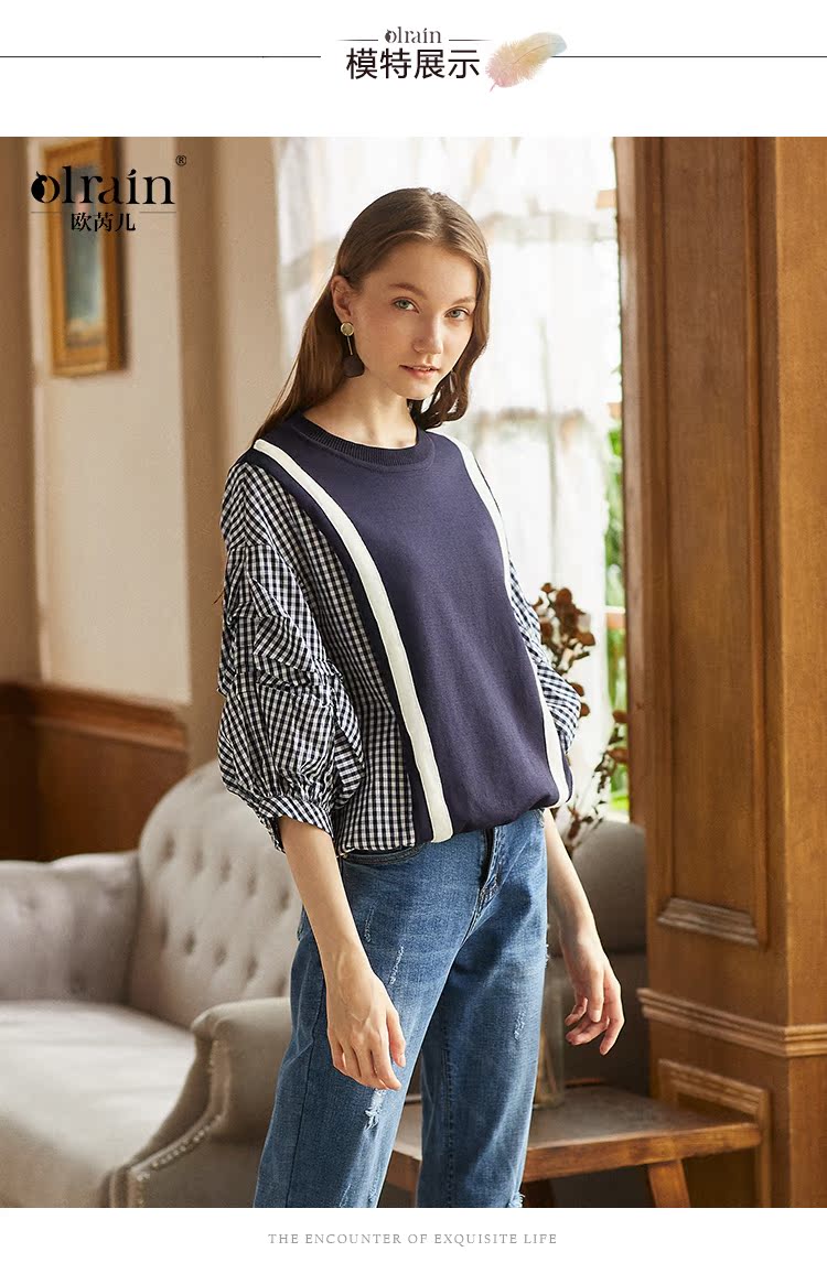 欧芮儿2018秋装新款女装预售宽松显瘦灯笼袖拼接毛针织衫女上衣