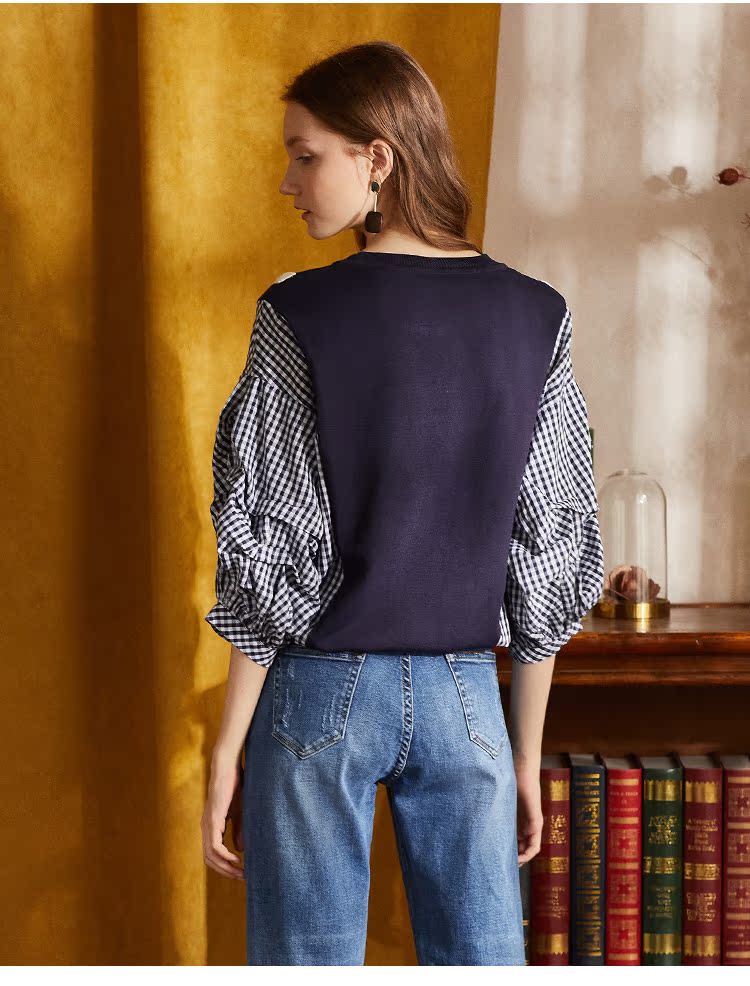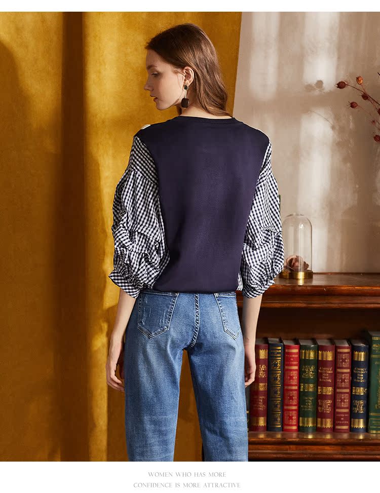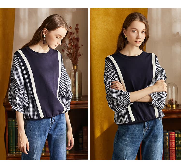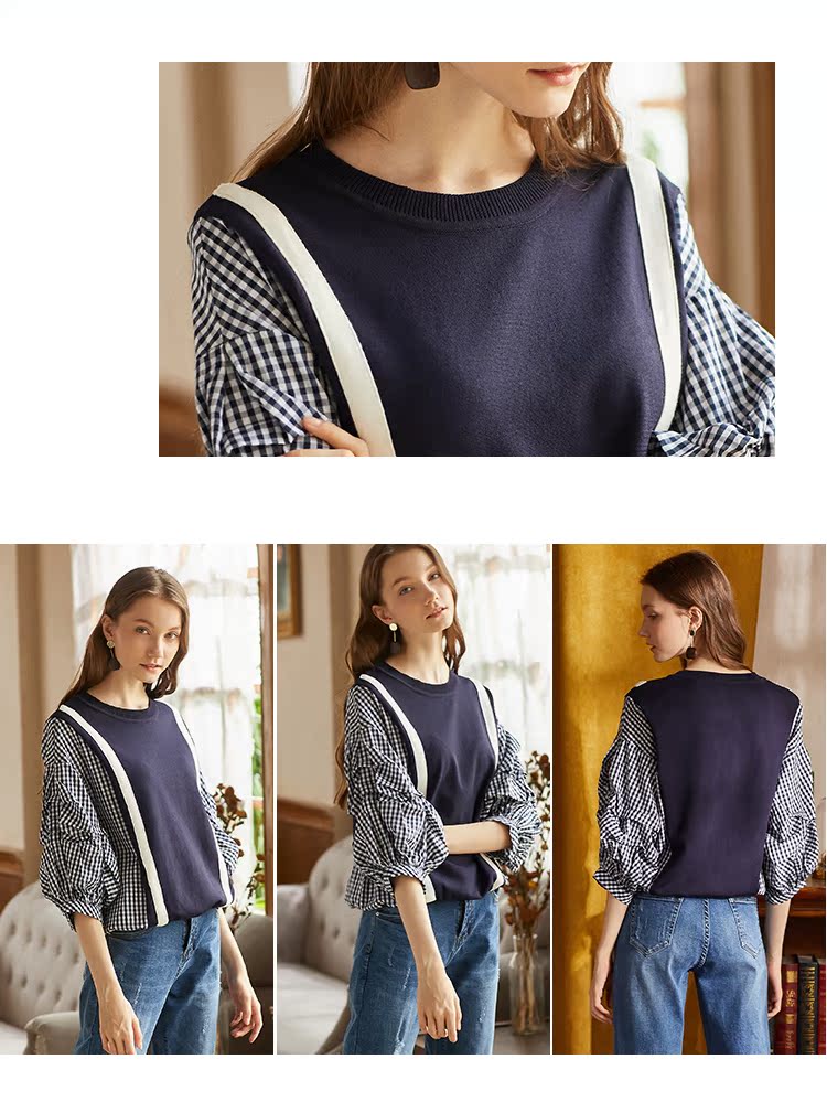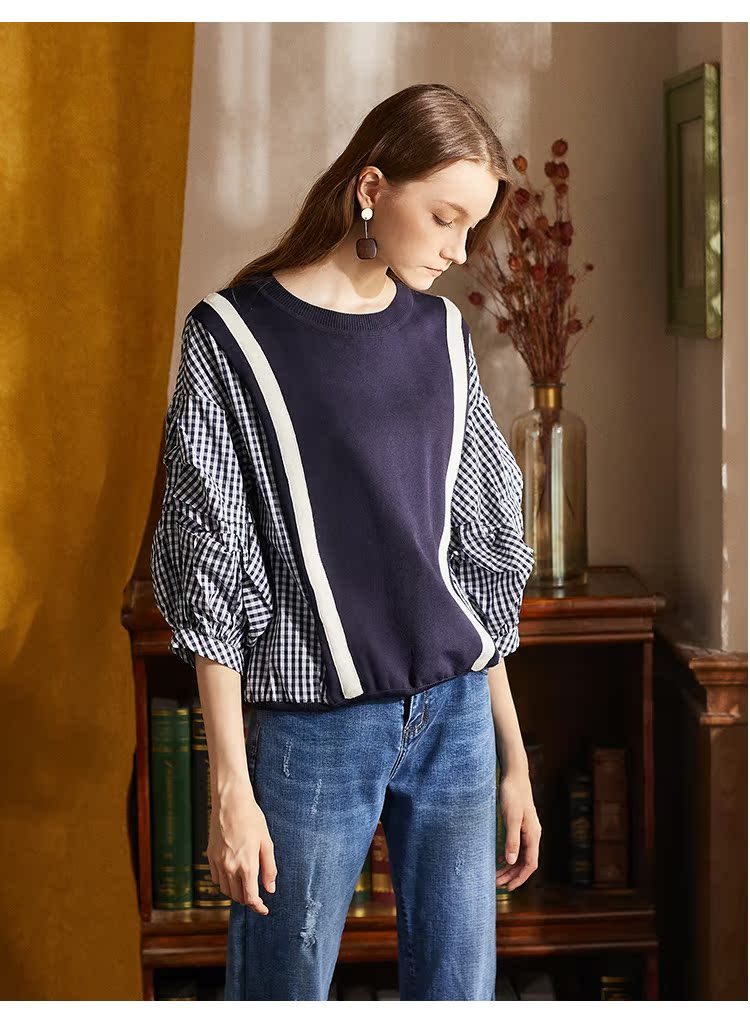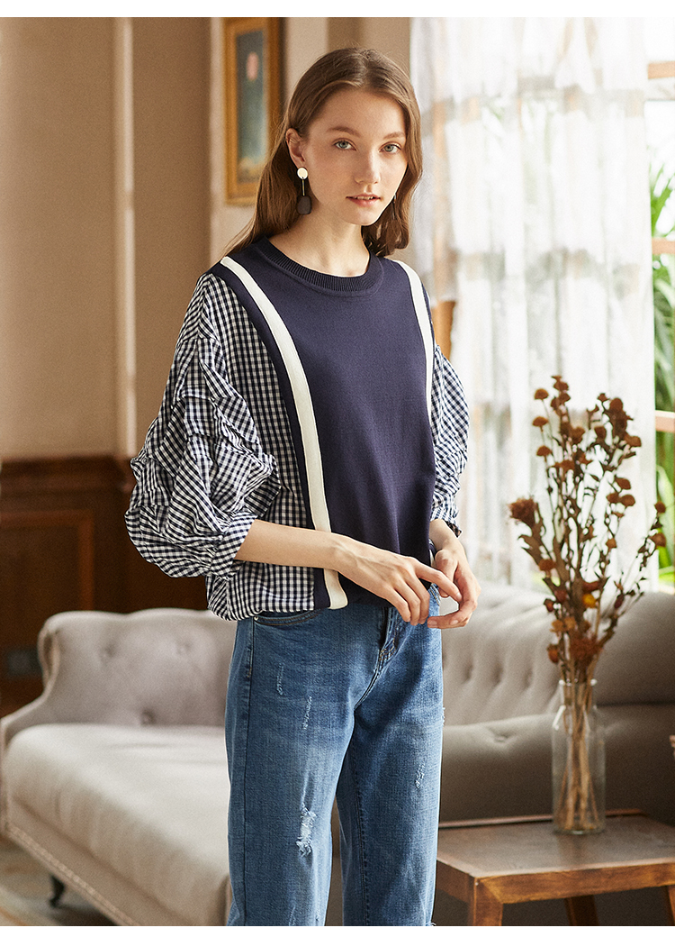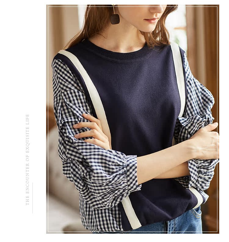 欧芮儿2018秋装新款女装预售宽松显瘦灯笼袖拼接毛针织衫女上衣