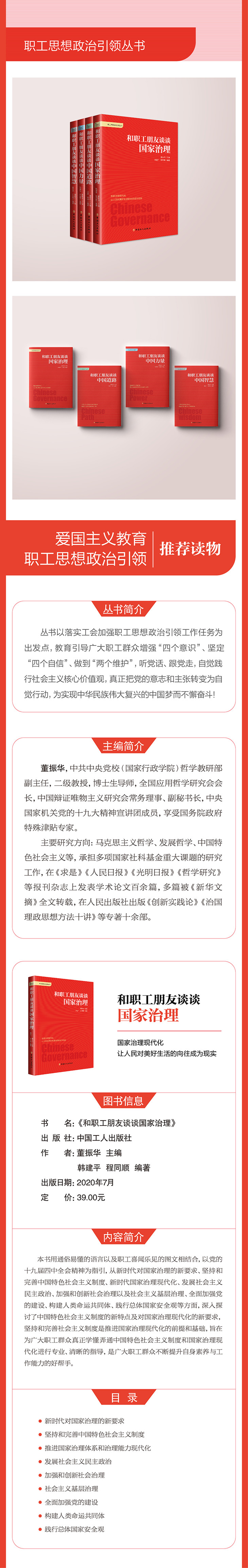 本书用通俗易懂的语言以及职工喜闻乐见的图文相结合体例,以党的十九届四中全会精神为指引,从新时代对国家治理的新要求、坚持和完善中国特色社会主义制度、新时代国家治理现代化、发展社会主义民主政治、加强和创新社会治理以及社会主义基层治理、全面加强党的建设、构建人类命运共同体、践行总体国家安全观等方面,深入探讨了中国特色社会主义制度的新特点及对国家治理现代化的新要求,坚持和完善社会主义制度是推进国家治理现代化的前提和基础,并从六个方面系统阐述了党中央推进国家治理现代化的重大举措,阐明“中国之治”的制度“密码”,旨在为广大职工群众真正学懂弄通中国特色社会主义制度和国家治理现代化进行专业、清晰的指导,是广大职工群众不断提升自身素养与工作能力的好帮手。