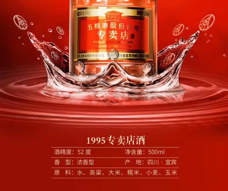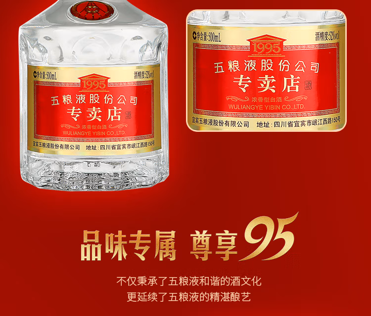 五粮液股份1995专卖店版浓香型白酒52度500ml*1瓶/2瓶