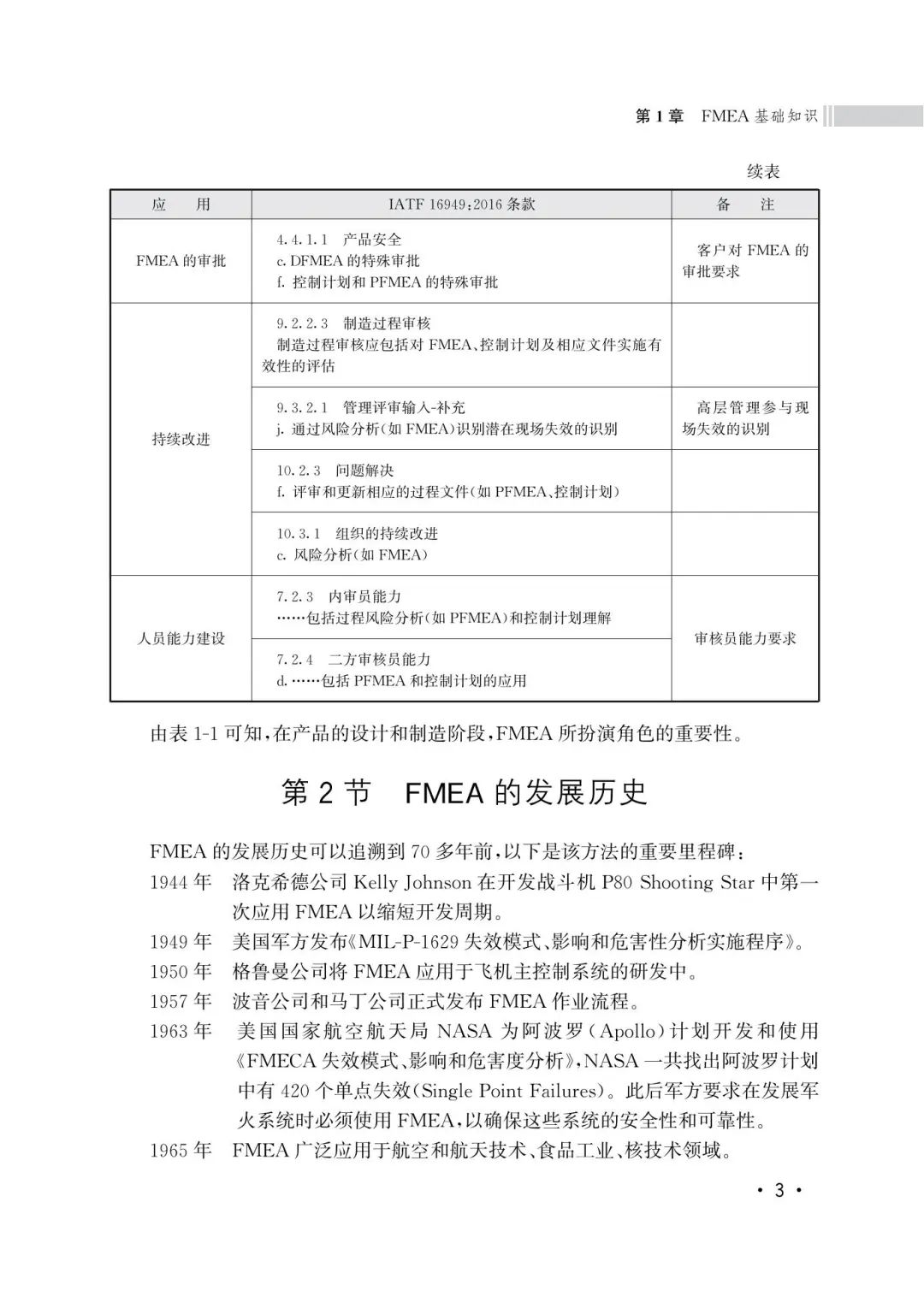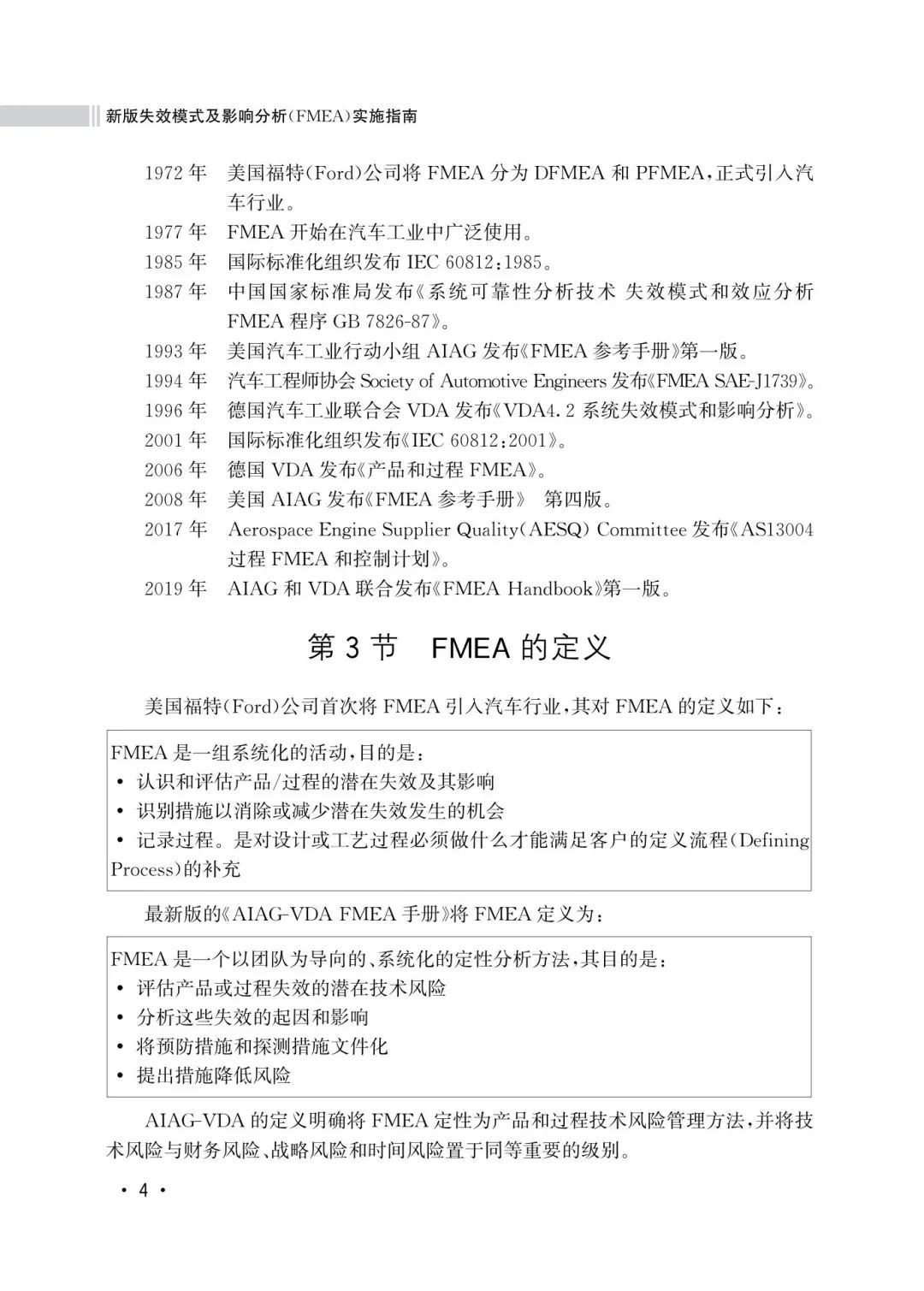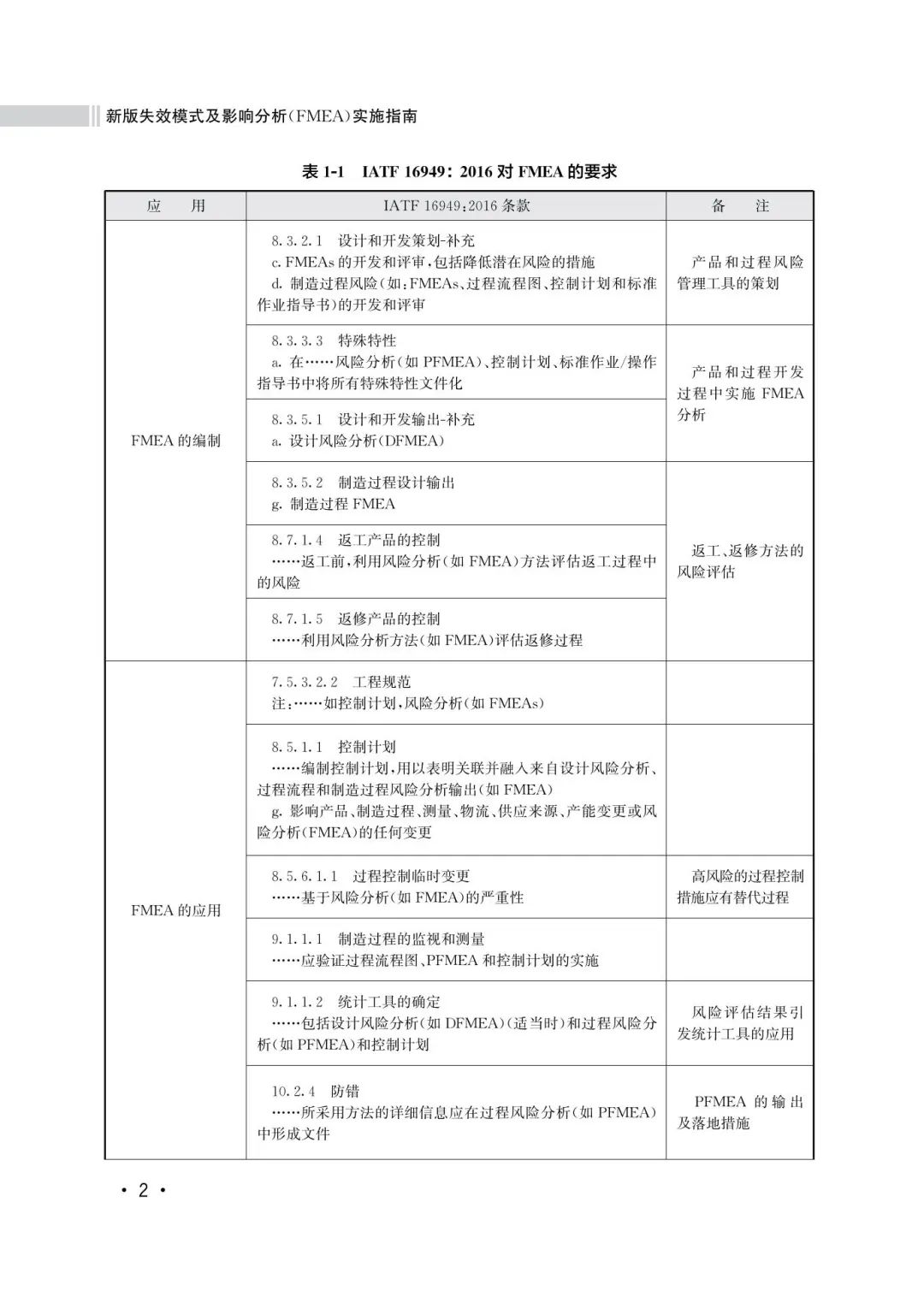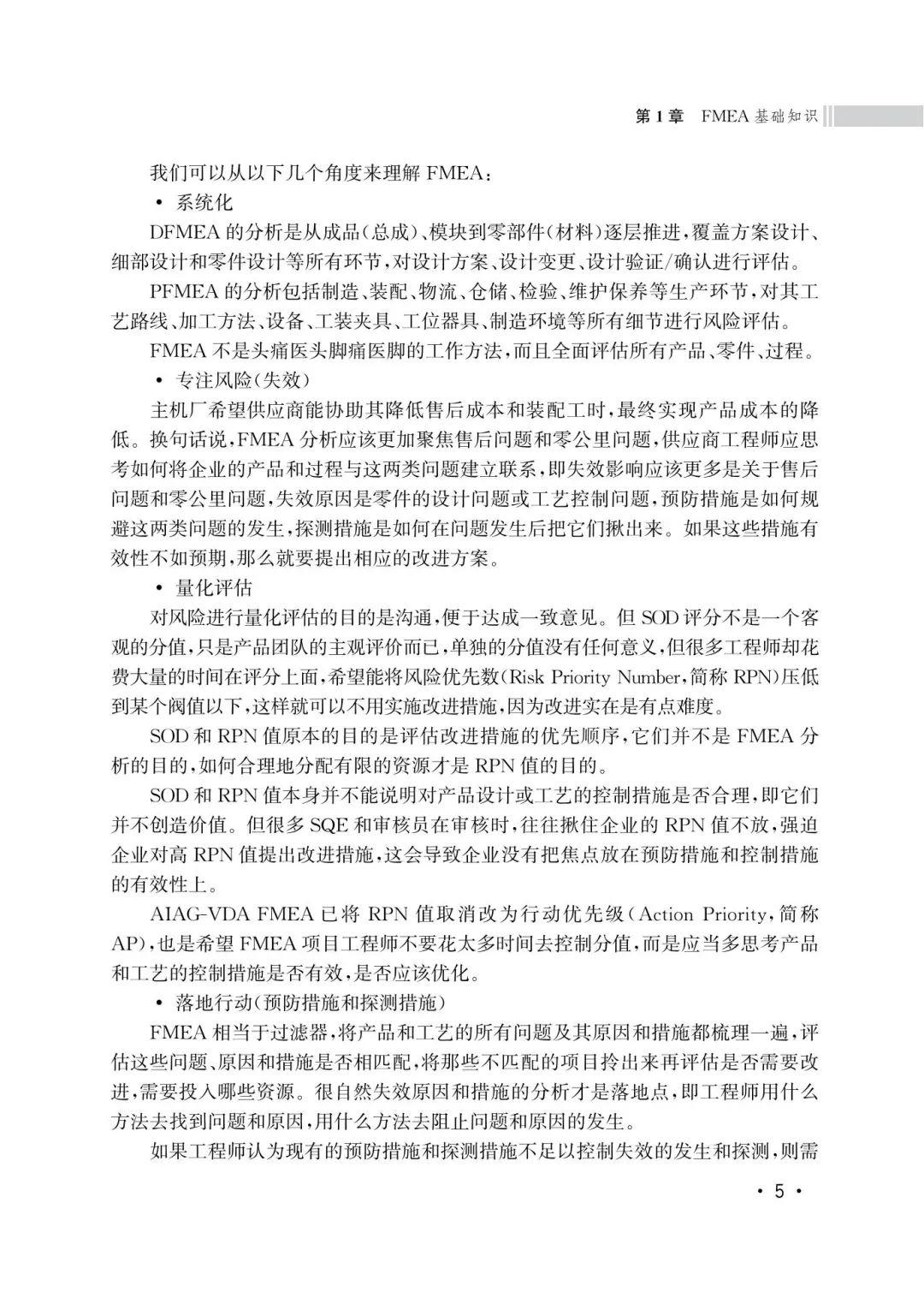 本书分为四章:第一章FMEA概述。简要介绍FMEA的发展历程、实施利益、成功要素,以及我对FMEA应用的见解和实际中存在的一些误解。第二至三章详细讲解了PFMEA的实施。根据DFMEA和PFMEA实施的七大步骤,详细描述每个步骤的原理、实施要点、案例等,以及我在长期的培训和咨询过程中所积累的独特经验和见解。第四章介绍了控制计划的编制。控制计划是产品质量管理的核心工具之一,是DFMEA和PFMEA分析结果的集成与落地措施,其中详细介绍了针对不同类型的工艺过程如何编制控制计划。