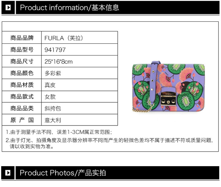 【香港直邮】Furla 芙拉 女士多彩紫色纯皮单肩包斜挎包 941797