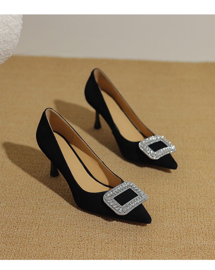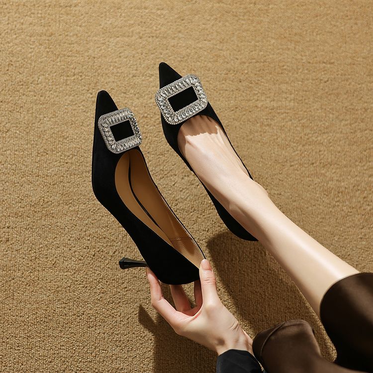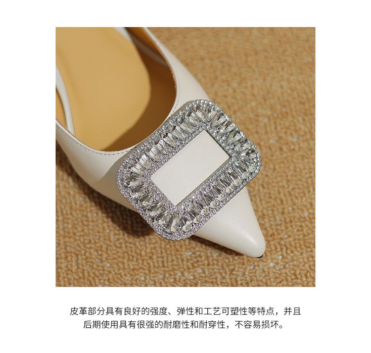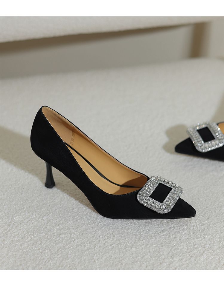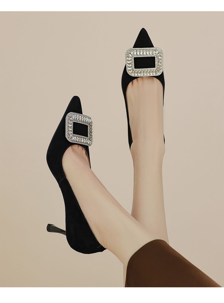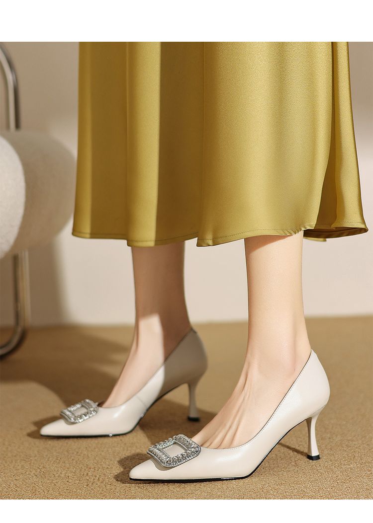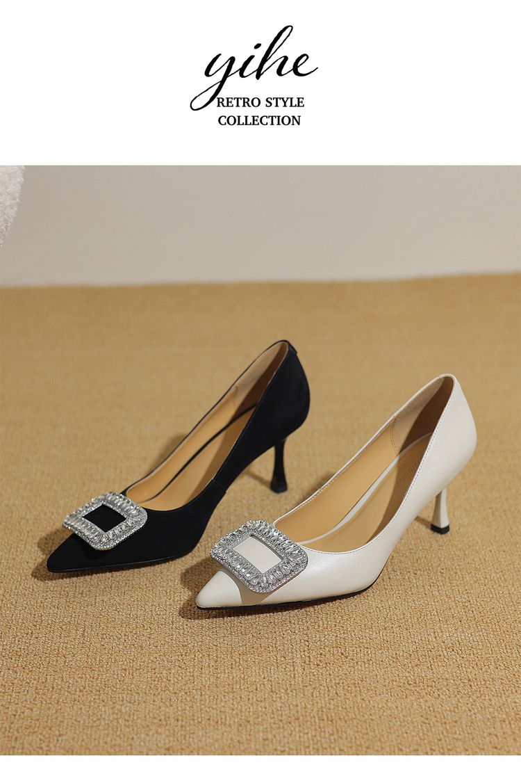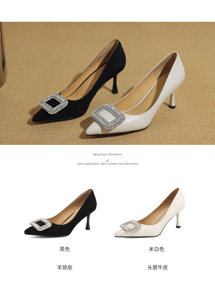 【预售5天】真皮浅口女鞋春秋新款水钻方扣高跟鞋女舒适细跟尖头气质名媛单鞋ZF&25002