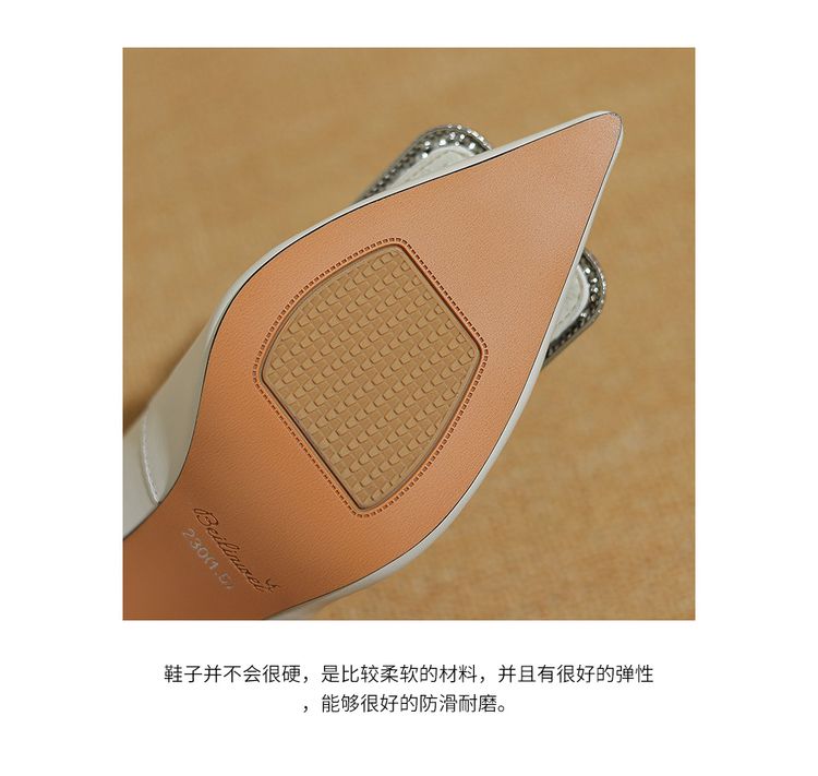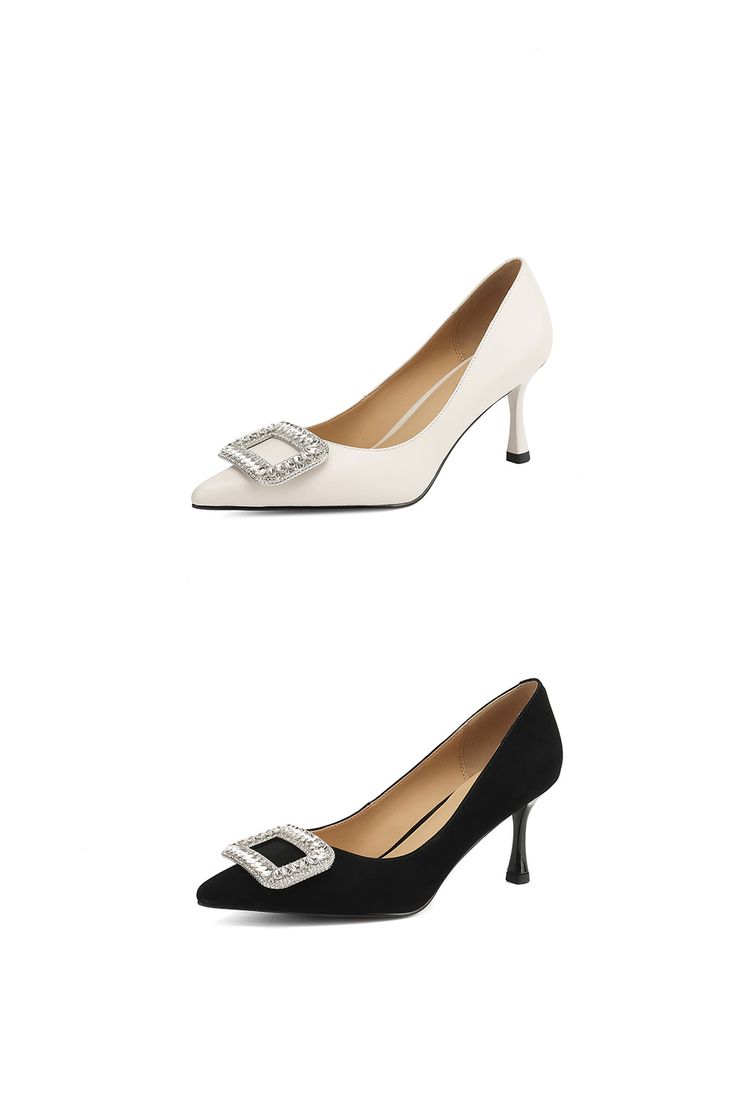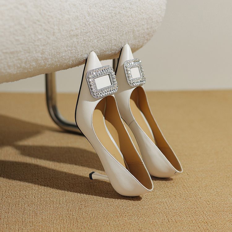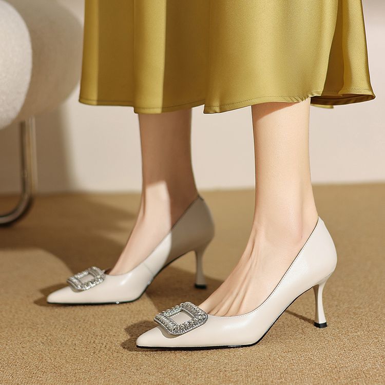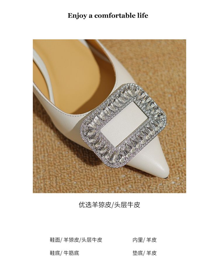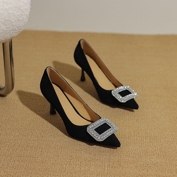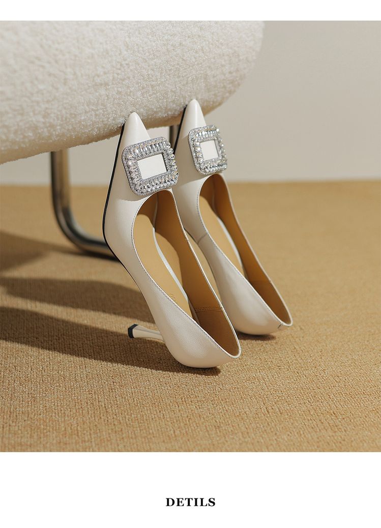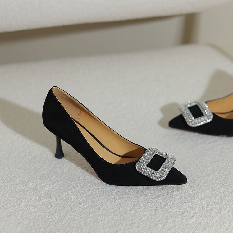 【预售5天】真皮浅口女鞋春秋新款水钻方扣高跟鞋女舒适细跟尖头气质名媛单鞋ZF&25002