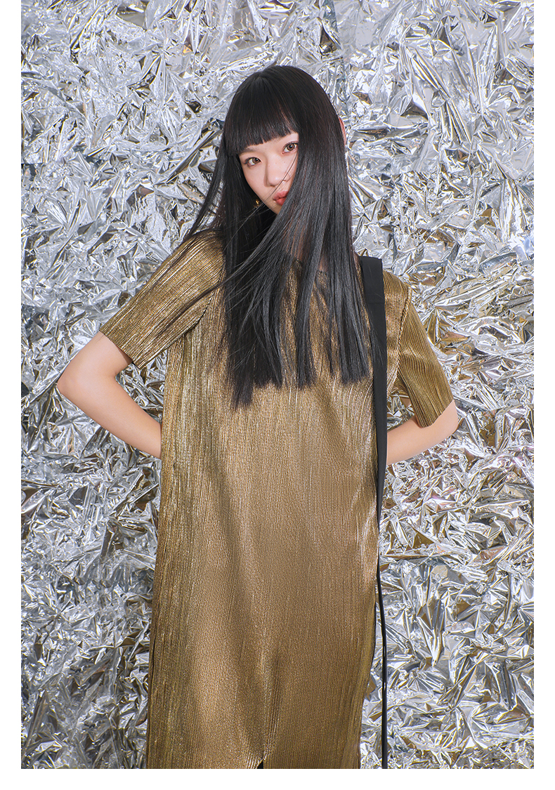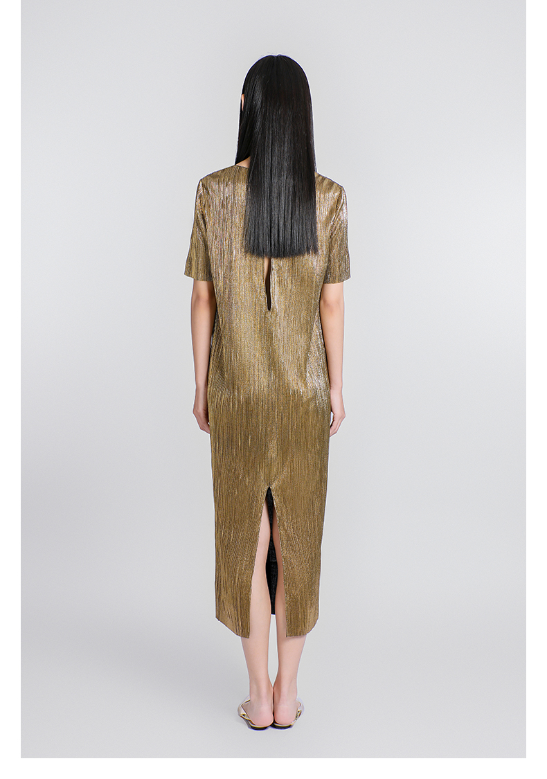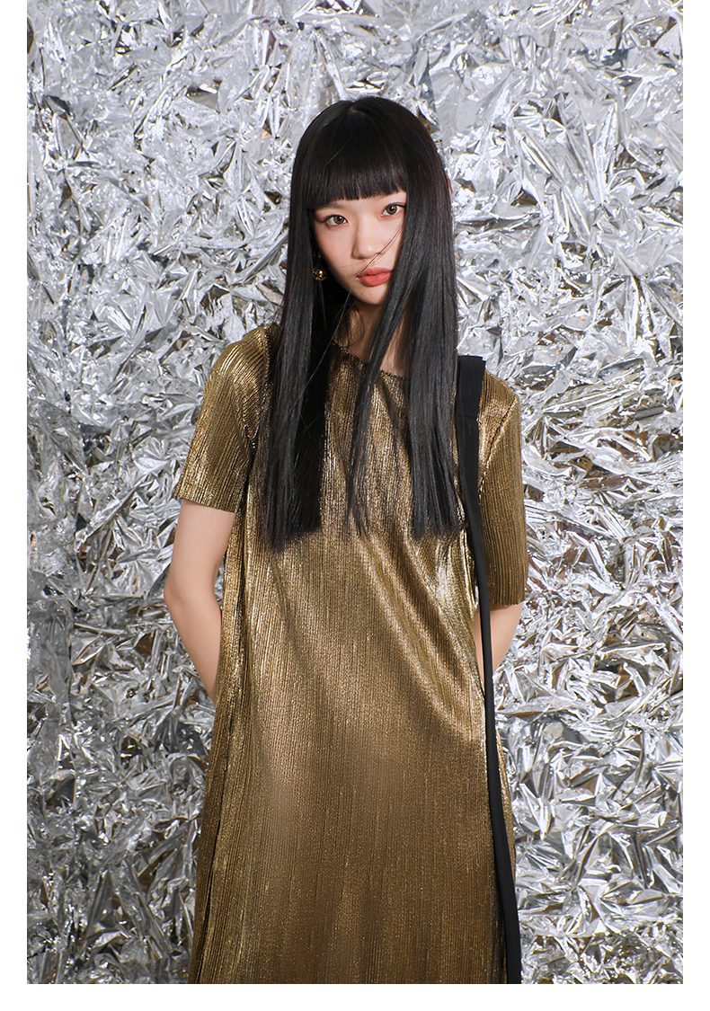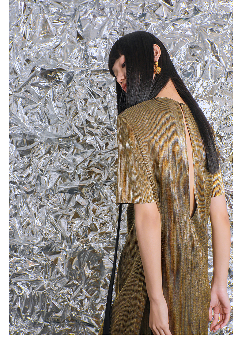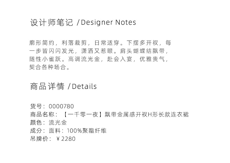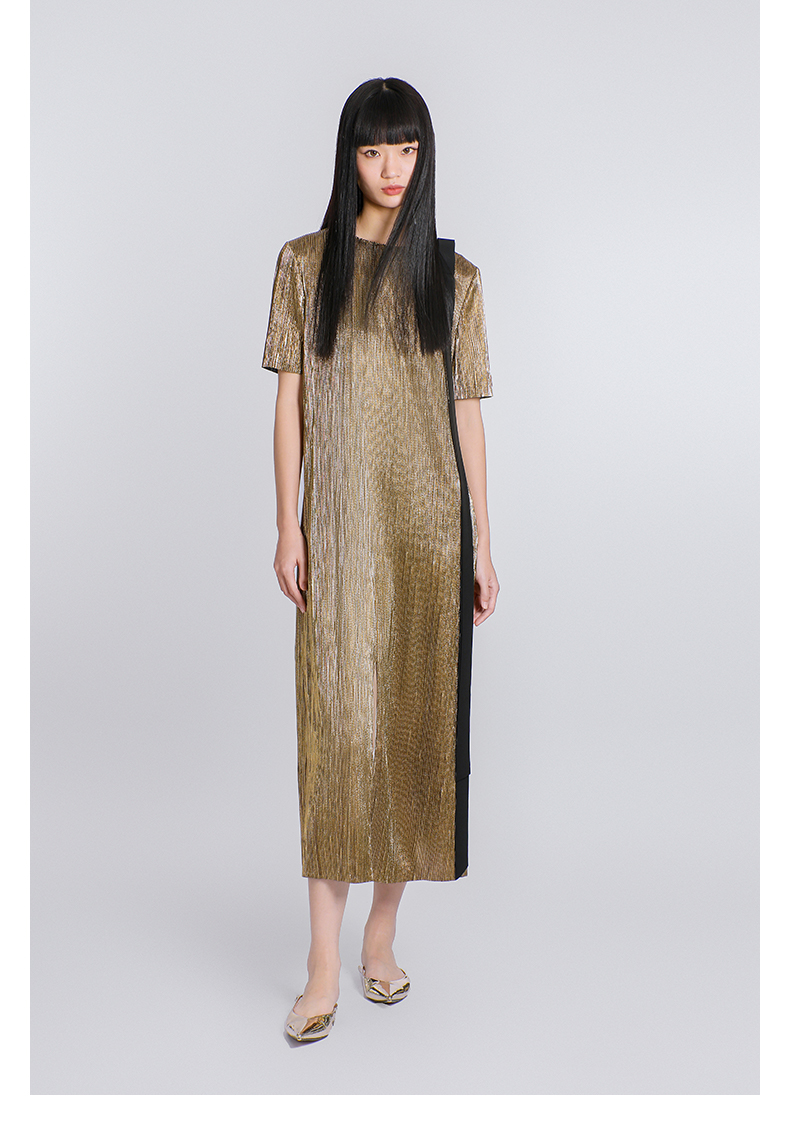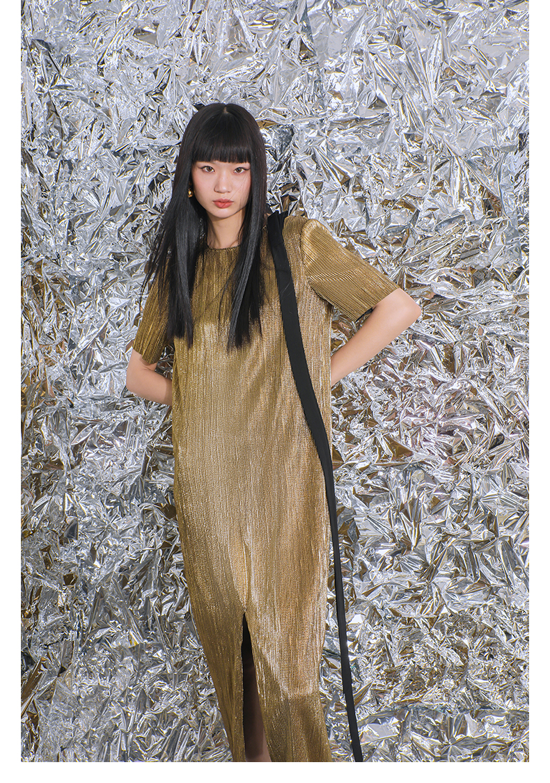【一千零一夜】蝴蝶结飘带设计金属感开衩H形长款连衣裙/0000780