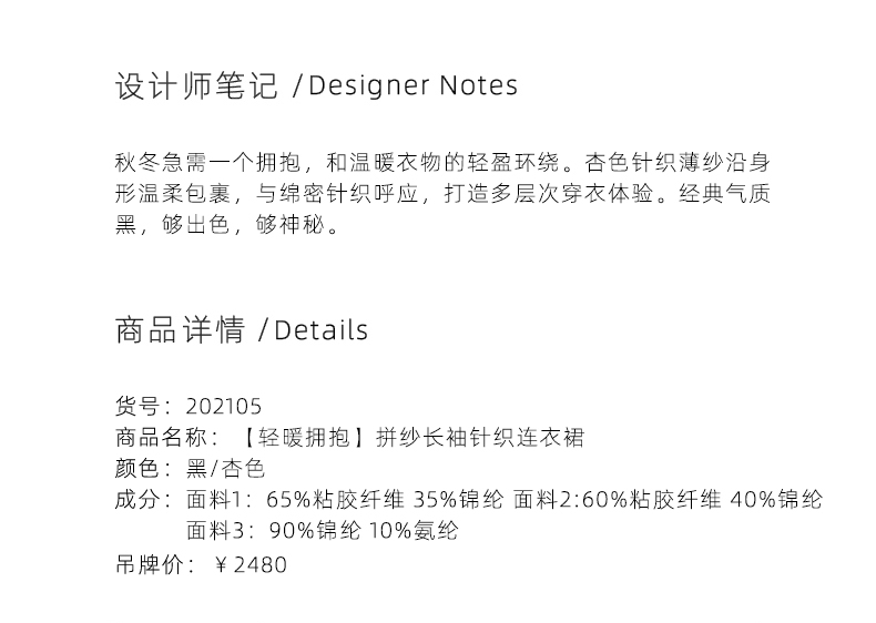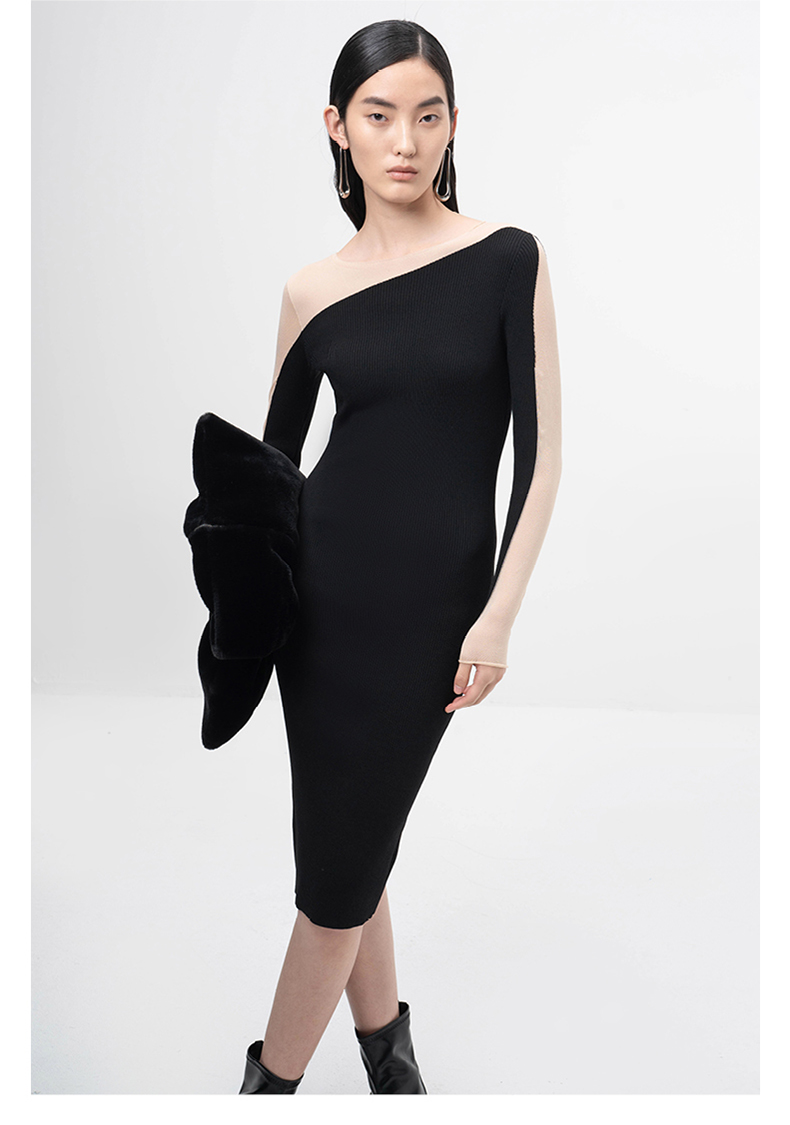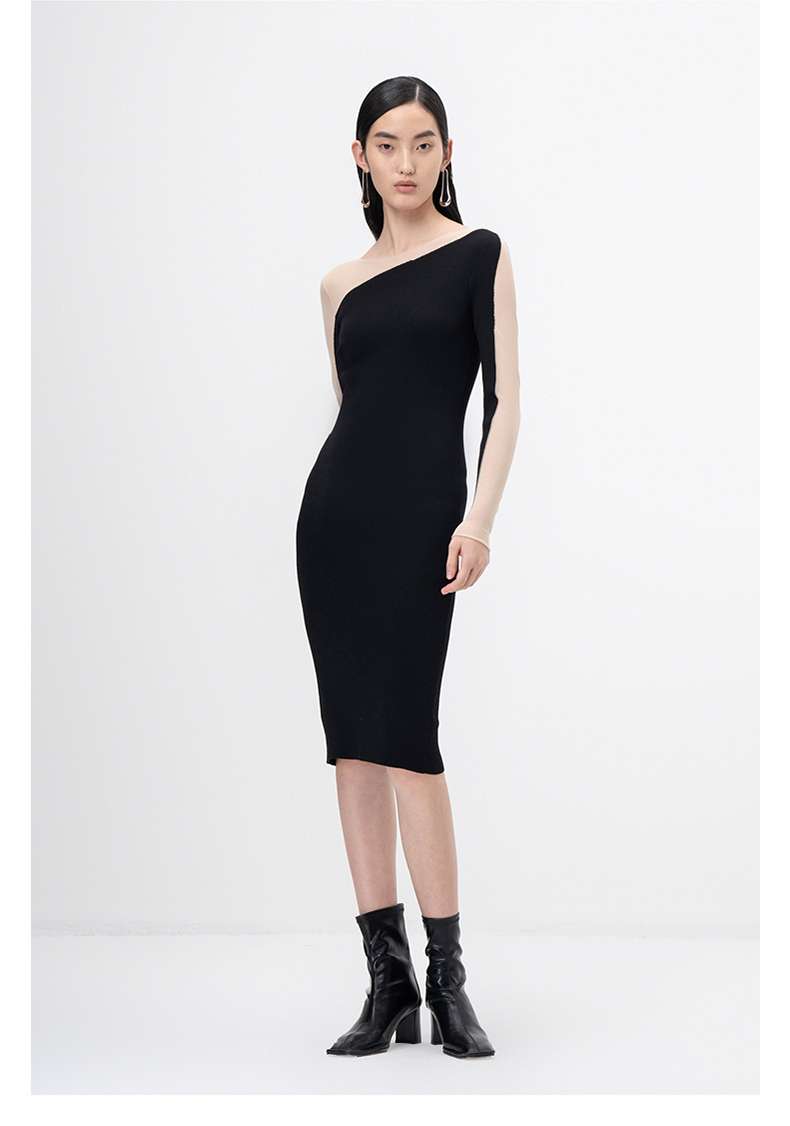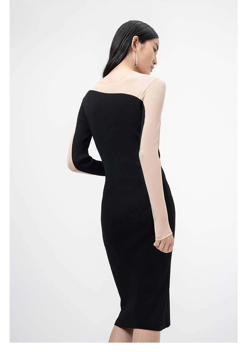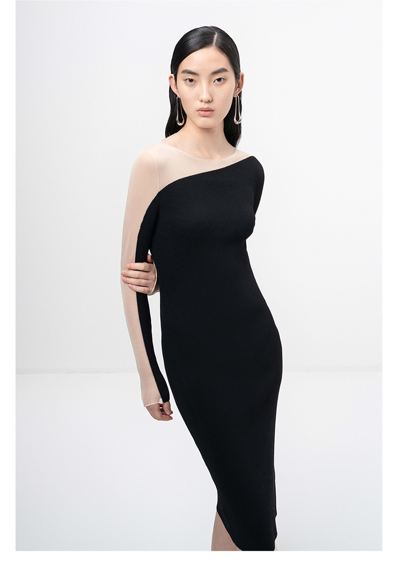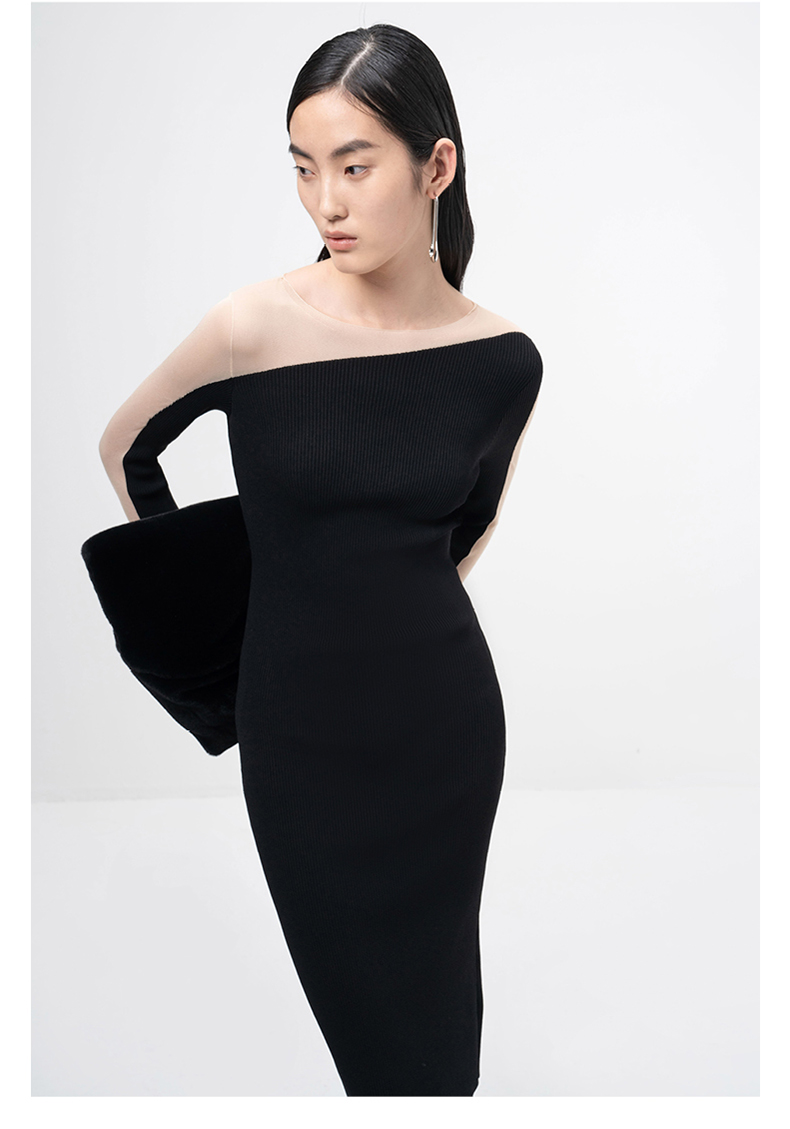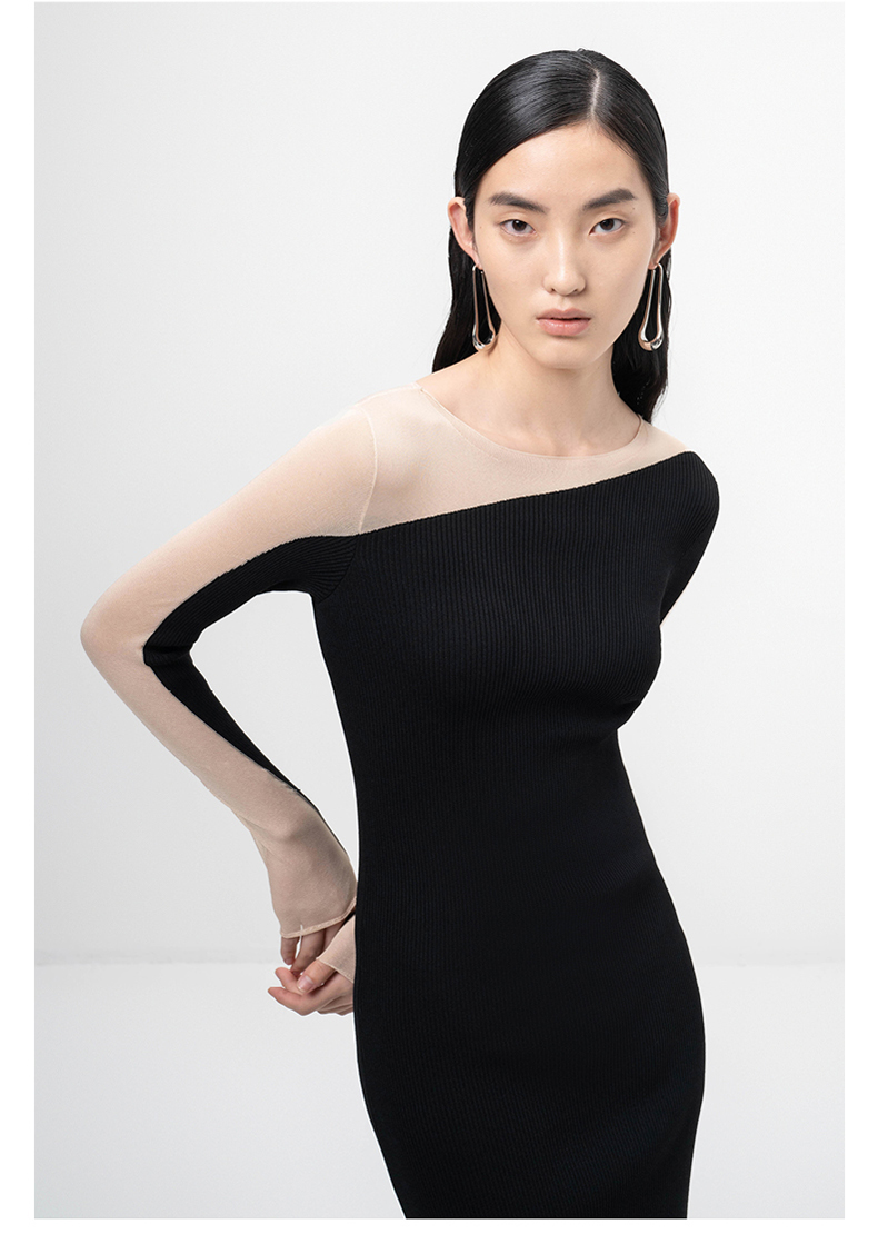 【轻暖拥抱】流畅曲线黑色拼纱长袖针织连衣裙/202105