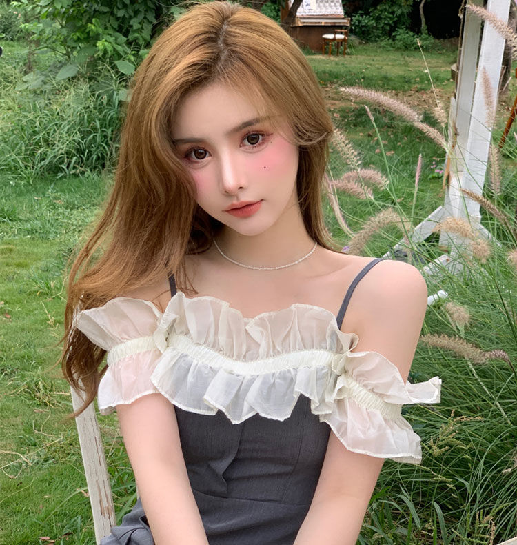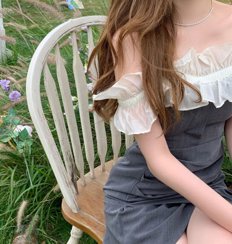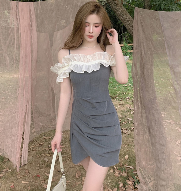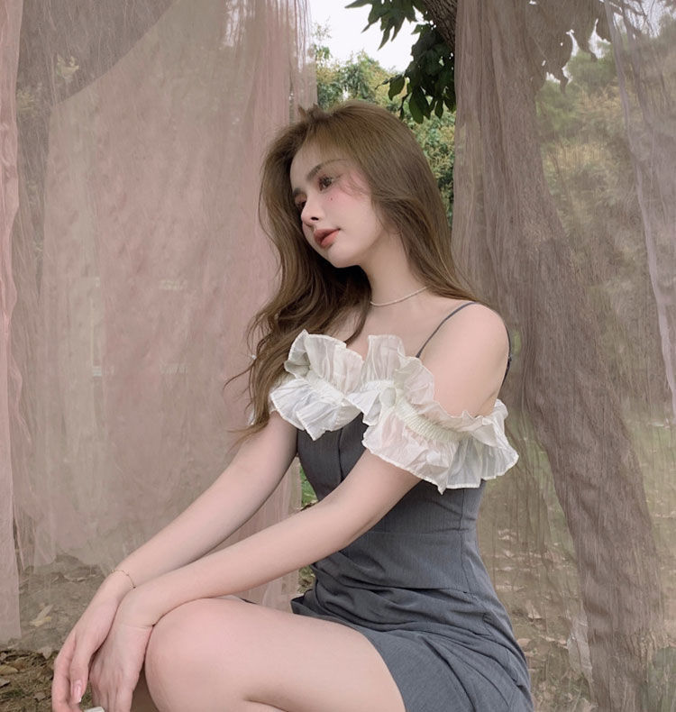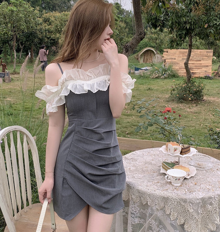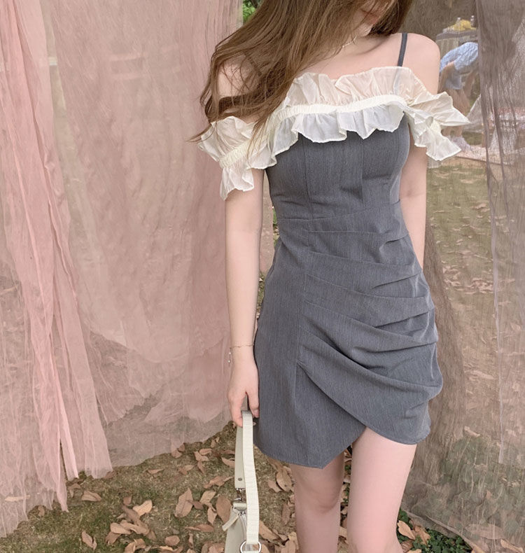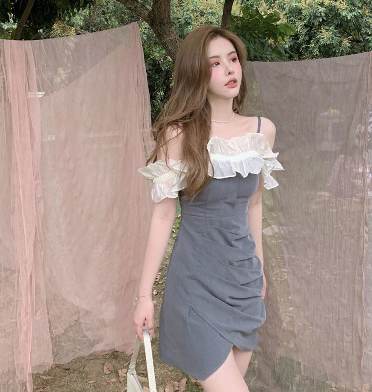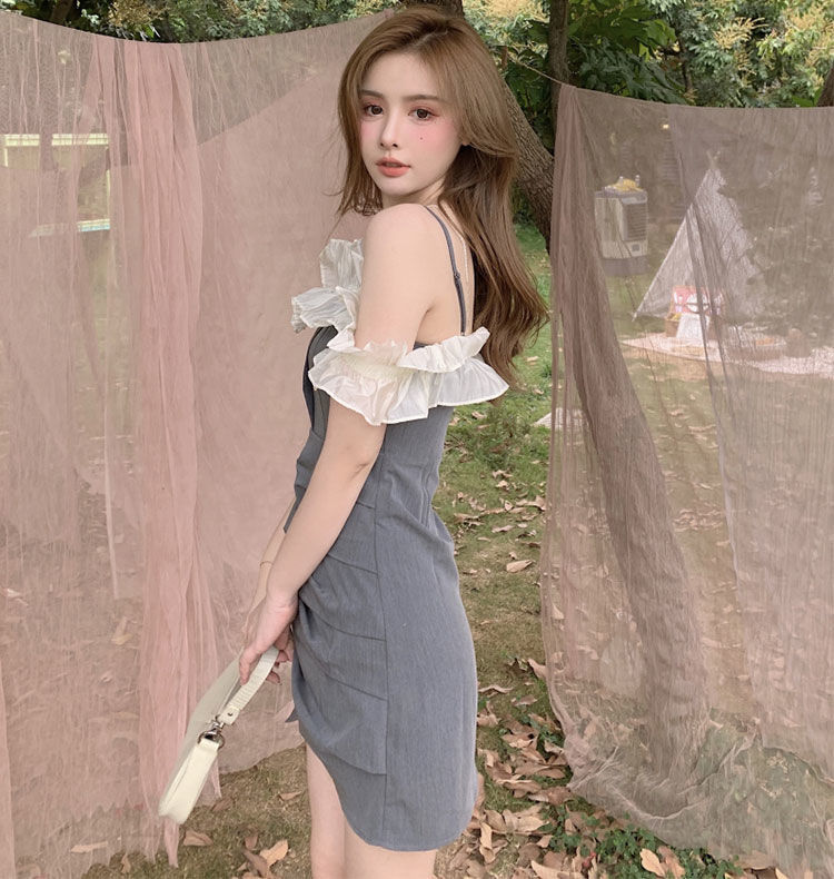 黛唯梵女装夏季2022年新款法式荷叶边裙子一字肩吊带连衣裙修身包臀短裙国庆清明出游