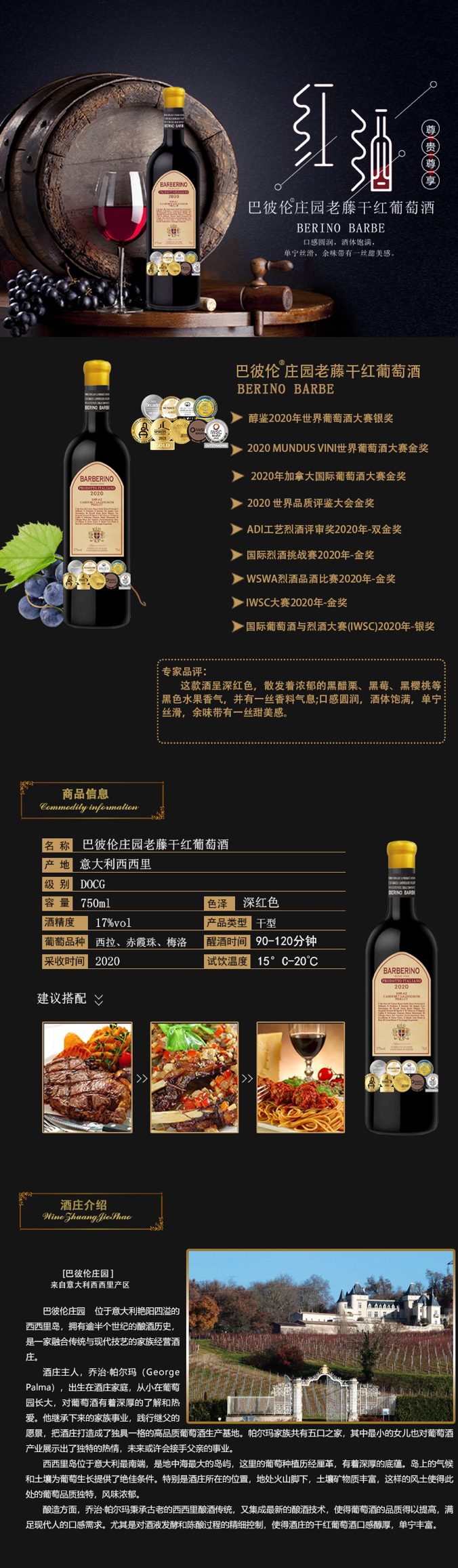 意大利巴比伦老藤干红葡萄酒17度750ml/瓶
