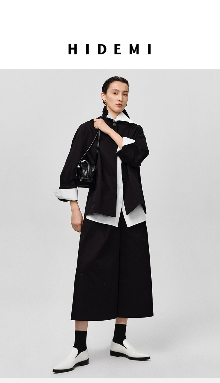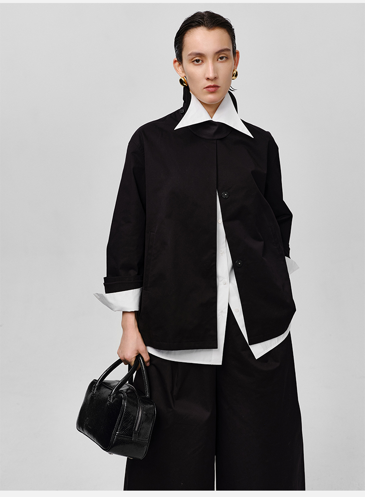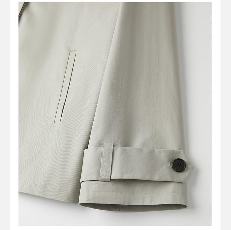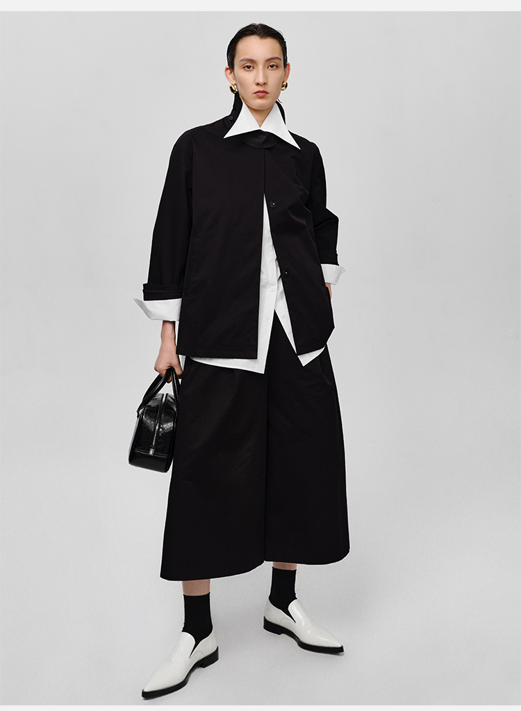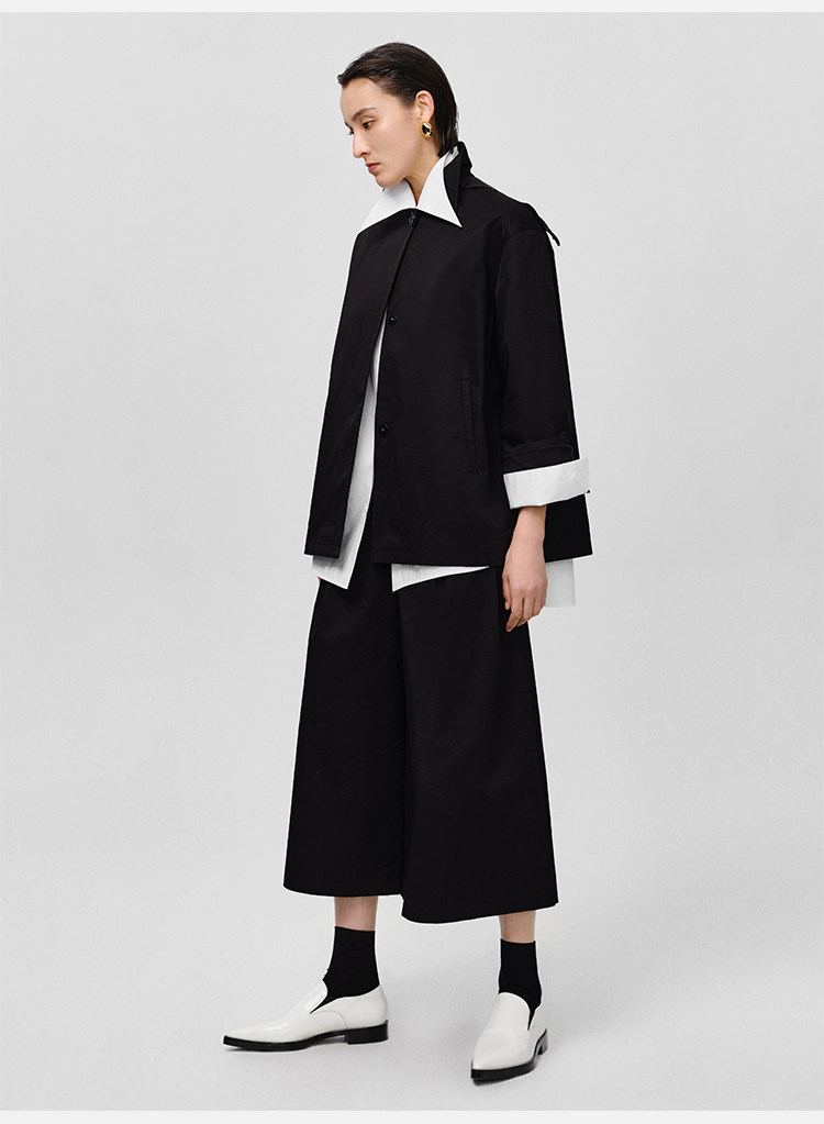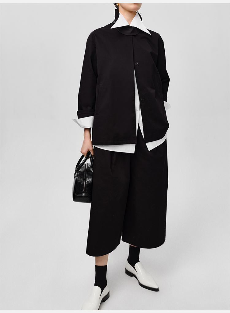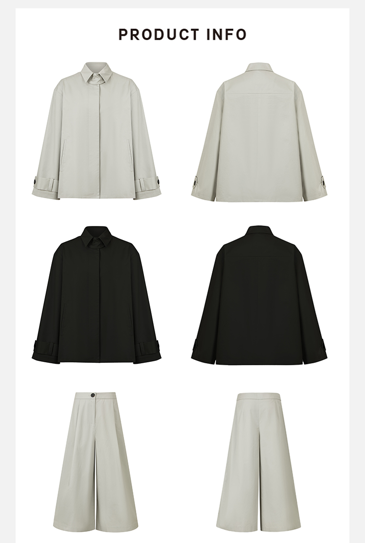 HIDEMI高密自然棉翻领短款风衣套装 外套/阔腿裤 黑色 海鸥灰绿