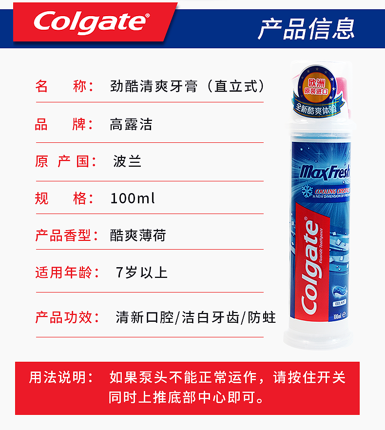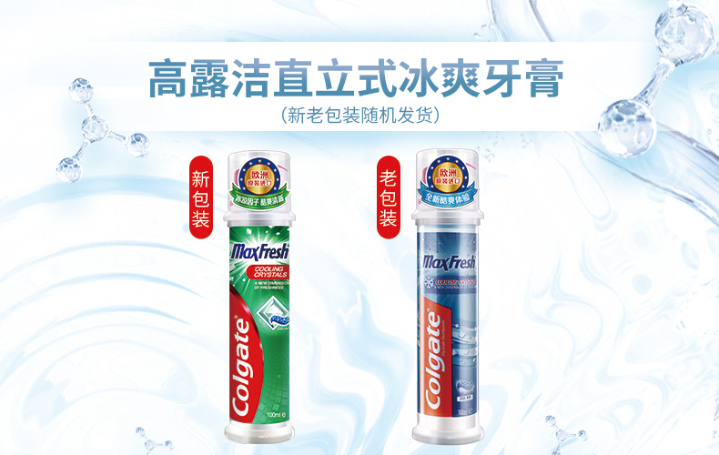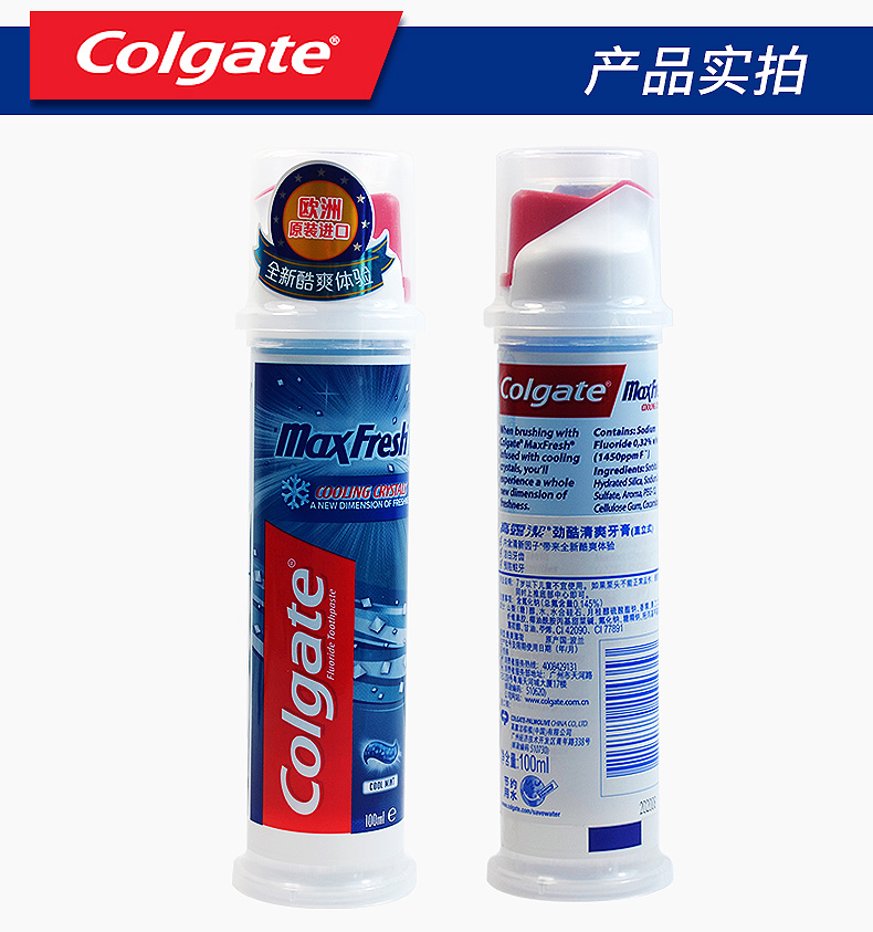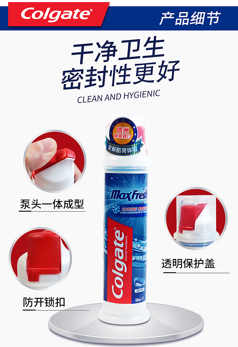 进口高露洁劲酷清爽直立式按压式牙膏100ml
