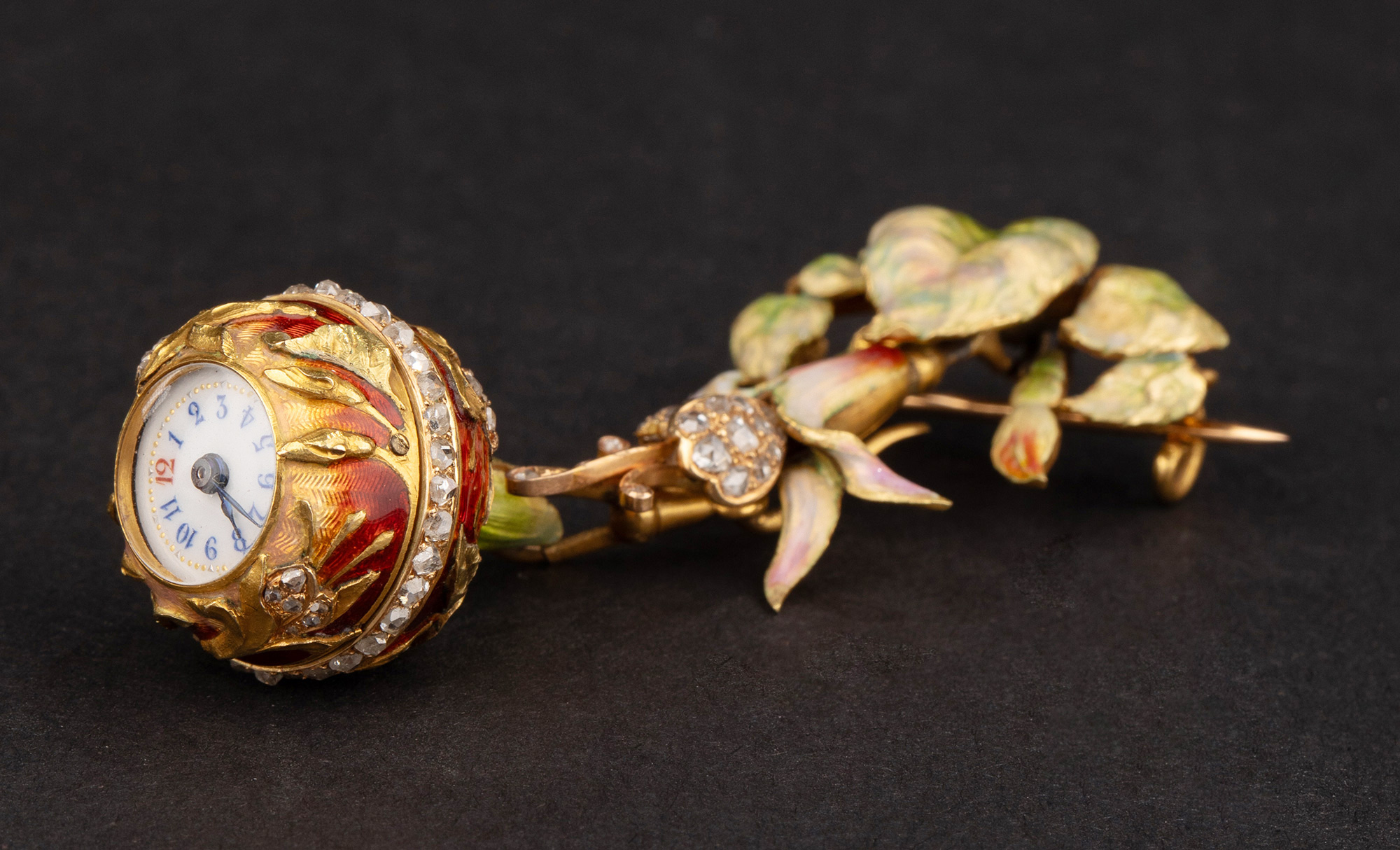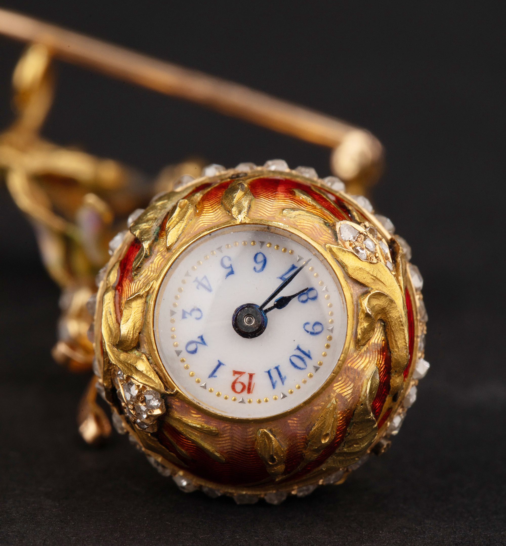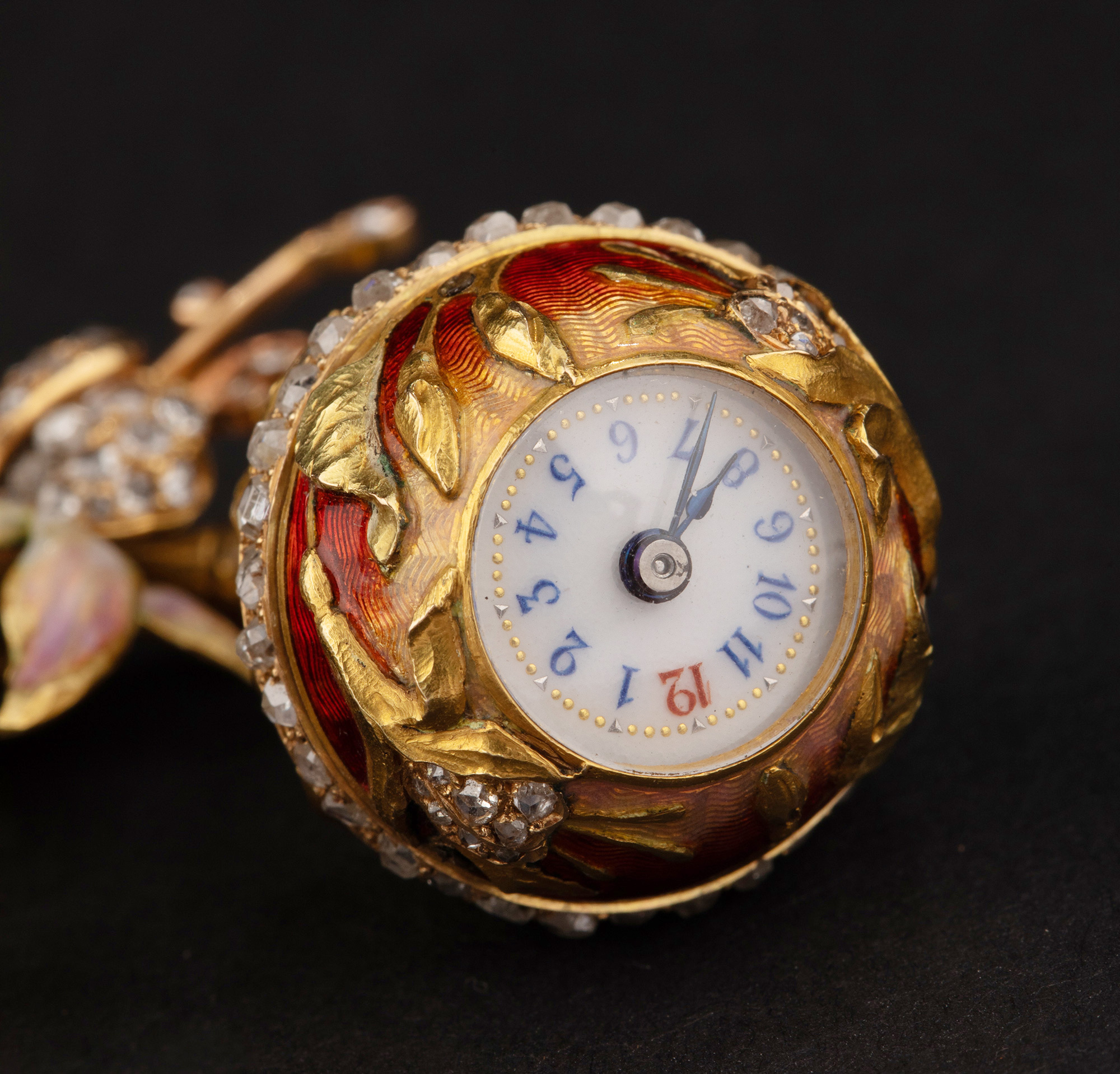 19世纪晚期瑞士出品黄金镶嵌钻石苹果主题珐琅表盘怀表及胸针