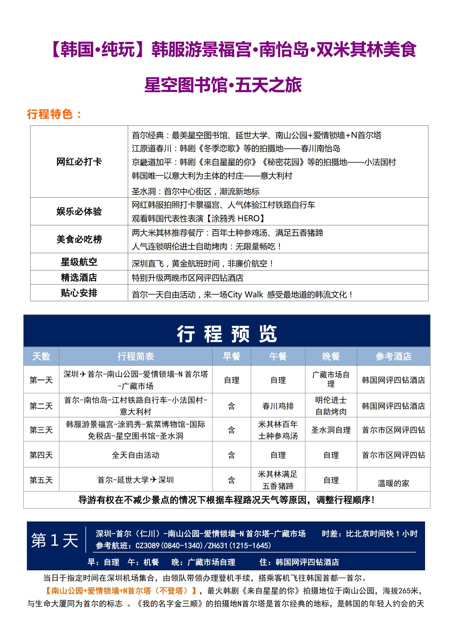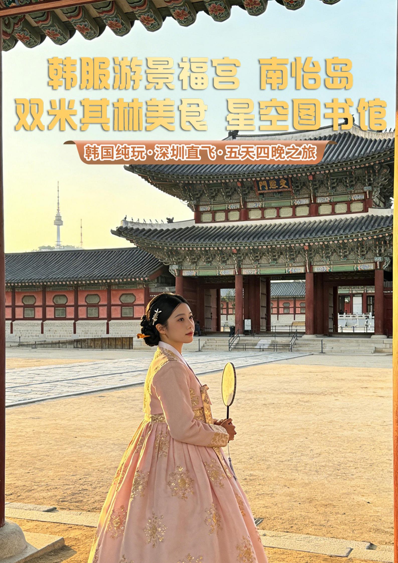 【五一】<韩国首尔+南怡岛5天-深圳直飞往返>韩服游景福宫、星空图书馆、延世大学、南山公园+爱情锁墙+N首尔塔、小法国村、意大利村、涂鸦秀HERO、首尔1天自由活动