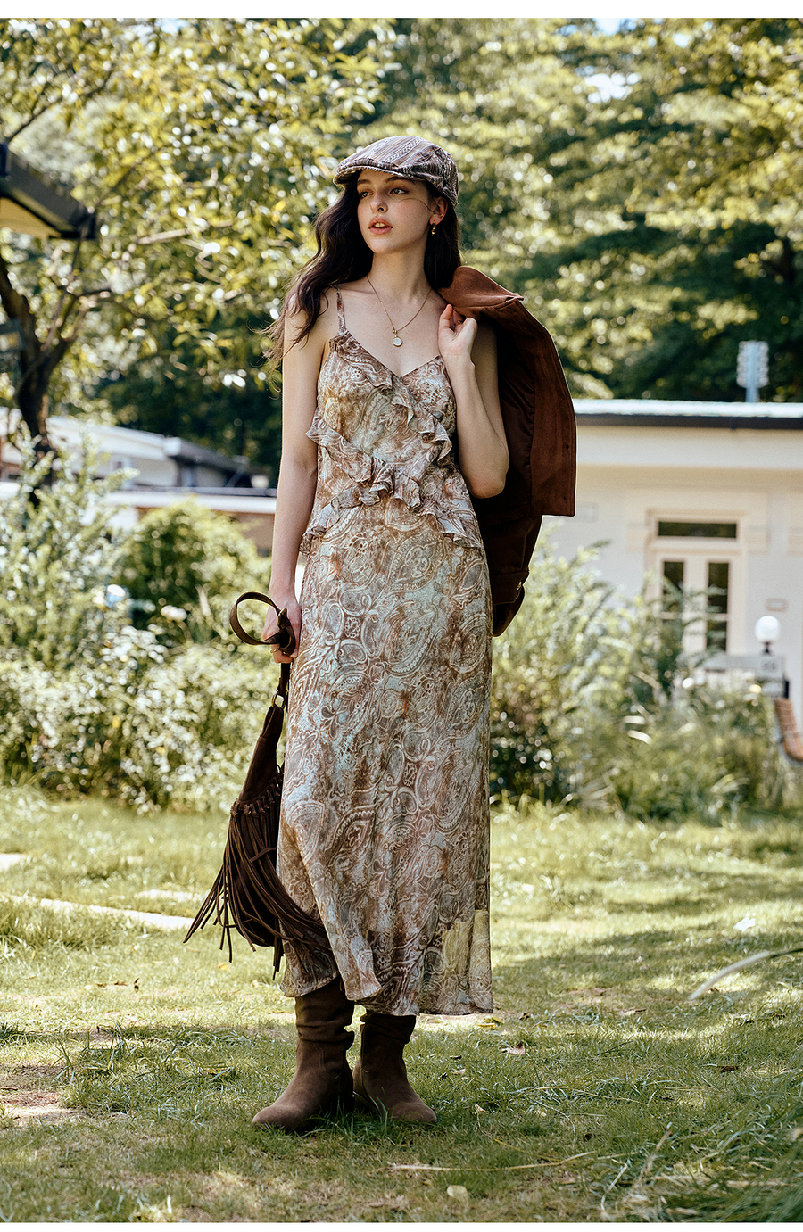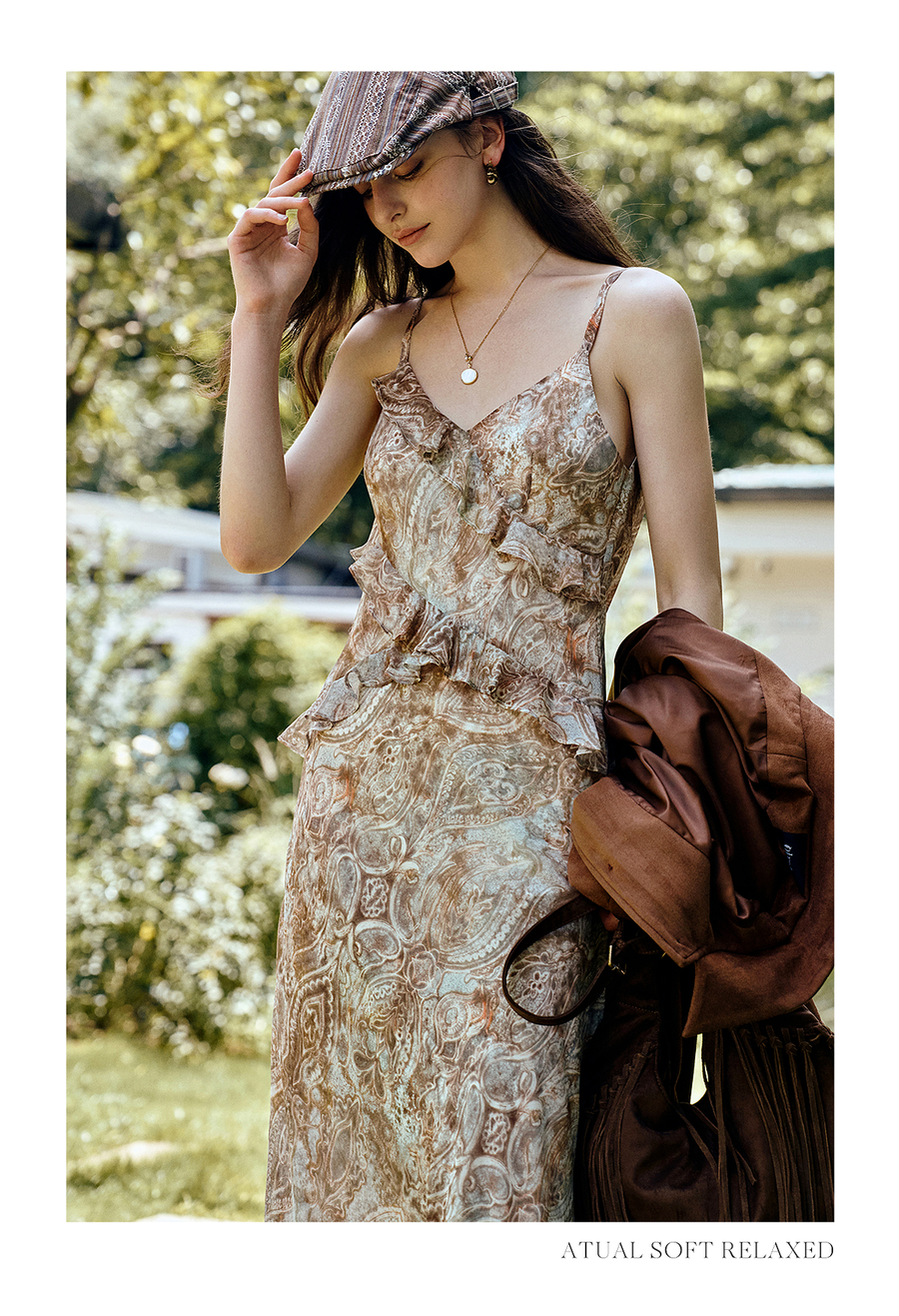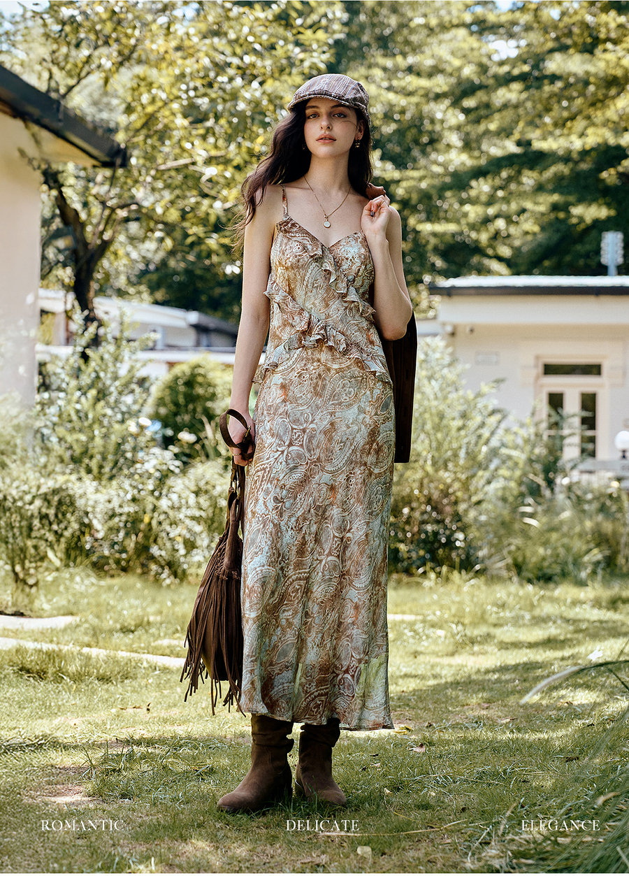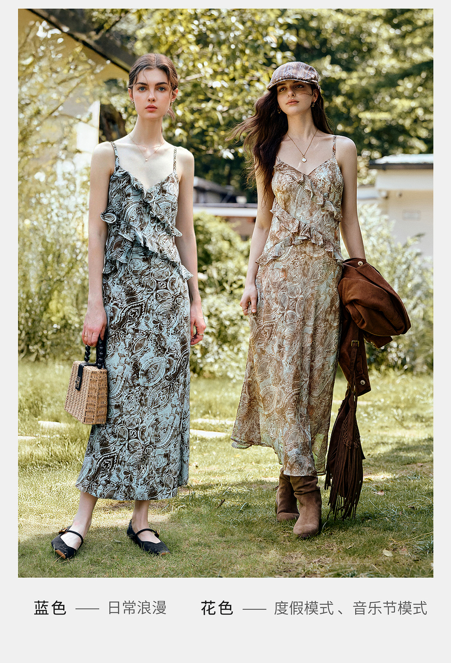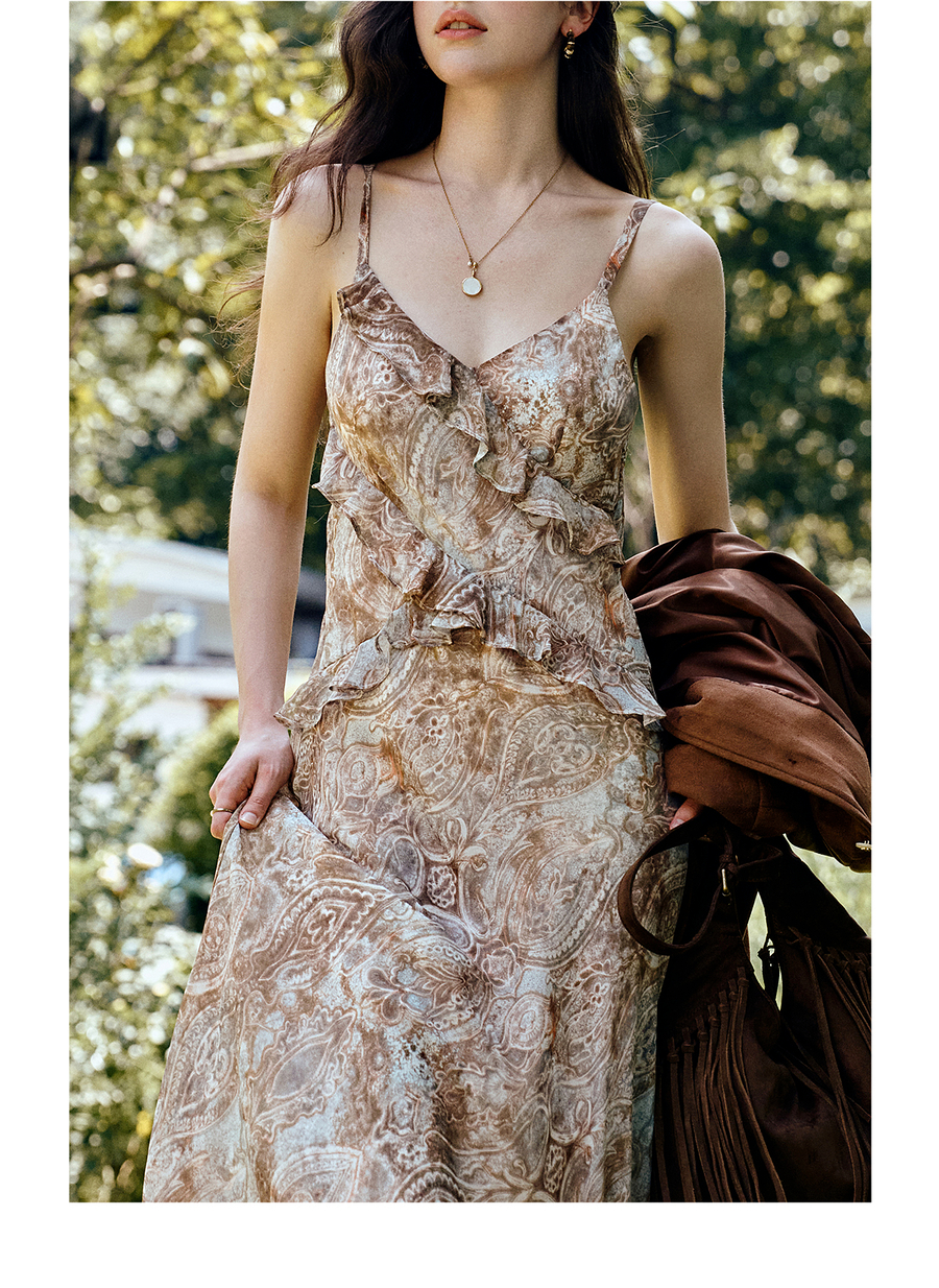OLrain欧芮儿波西米亚风荷叶吊带连衣裙女秋2025年美拉德无袖长裙