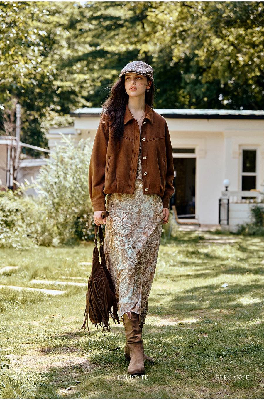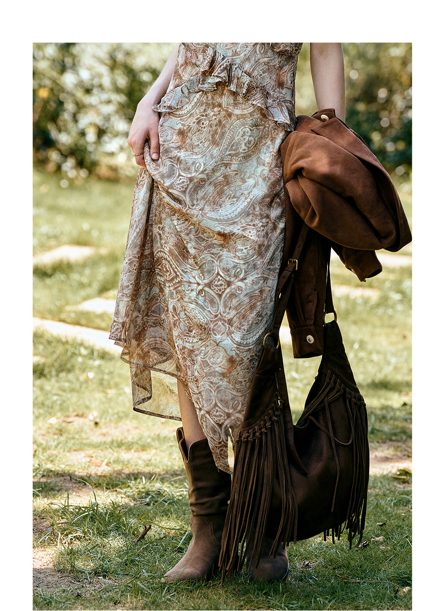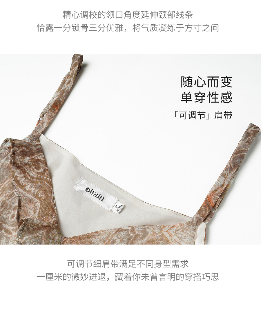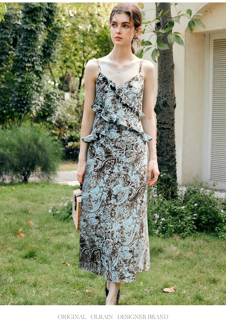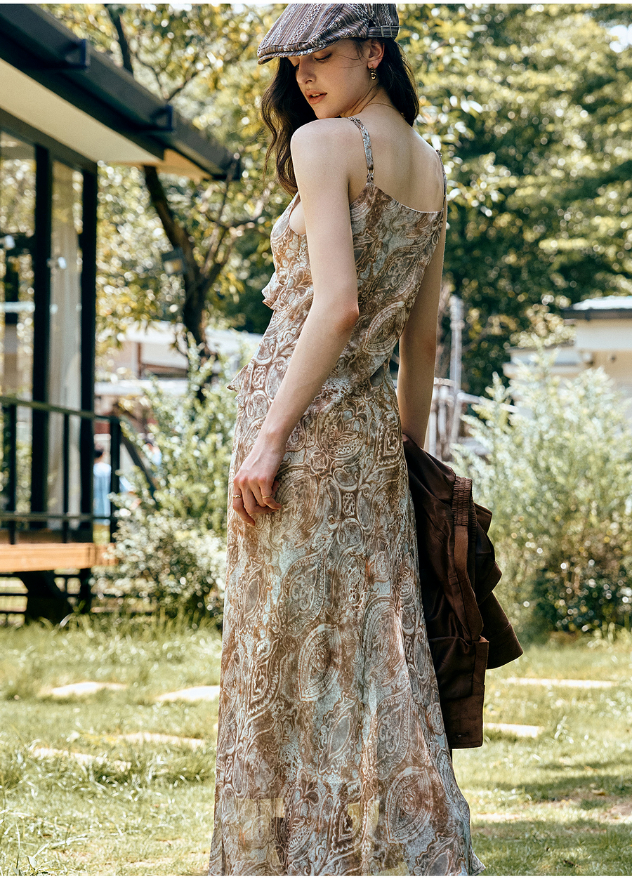 OLrain欧芮儿波西米亚风荷叶吊带连衣裙女秋2025年美拉德无袖长裙