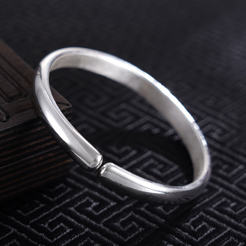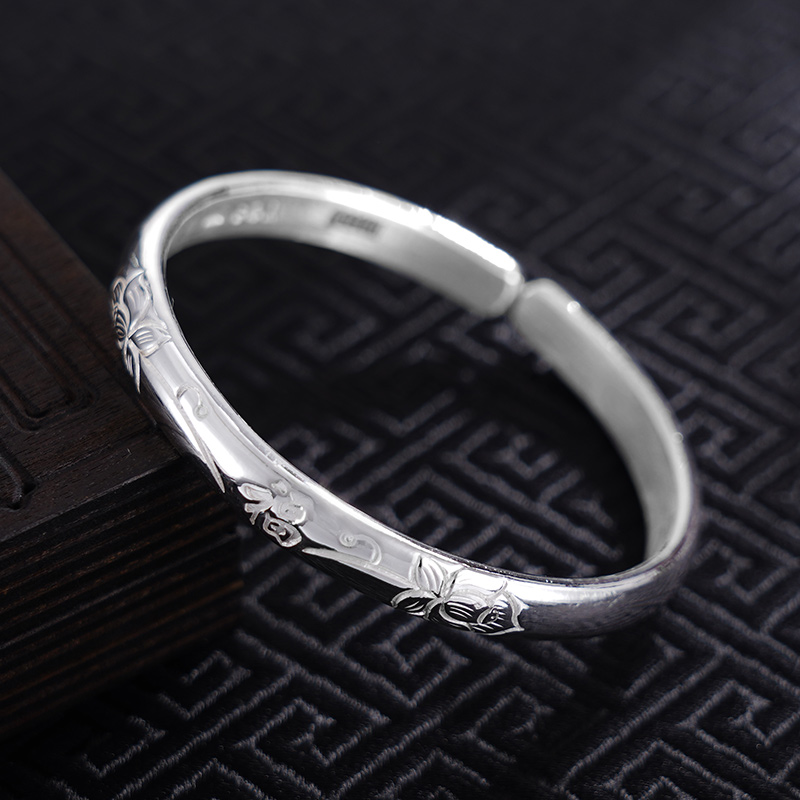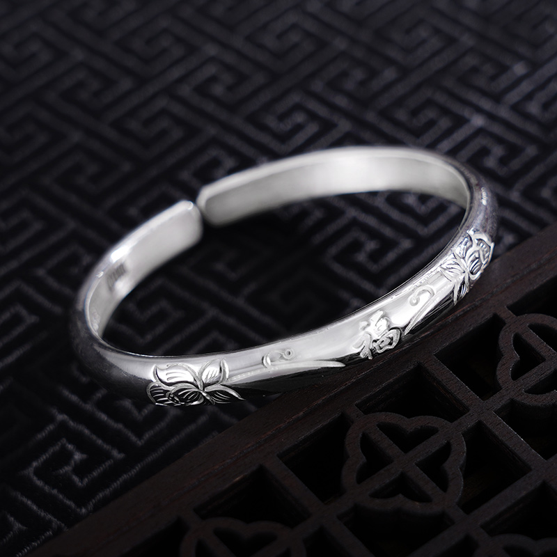 【寓意】:纯银开口手镯,镯面錾刻莲花图案。花瓣纹理细腻,灵动之感扑面而来,搭配福字点缀,寓意福气一生,静享美好流年。