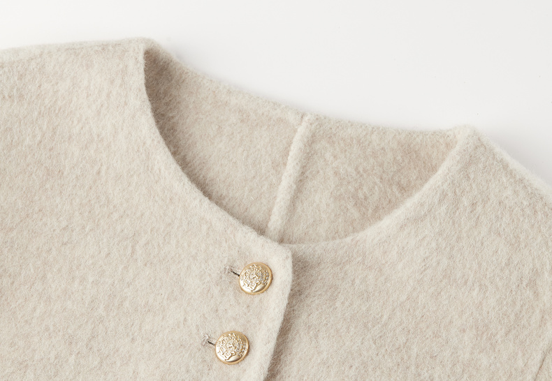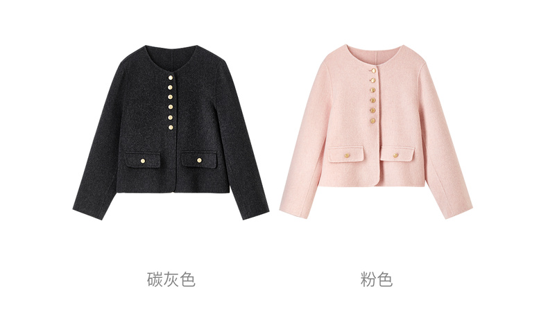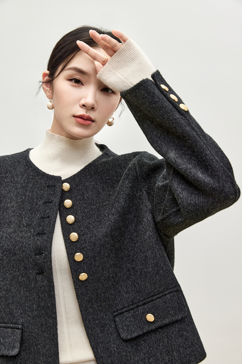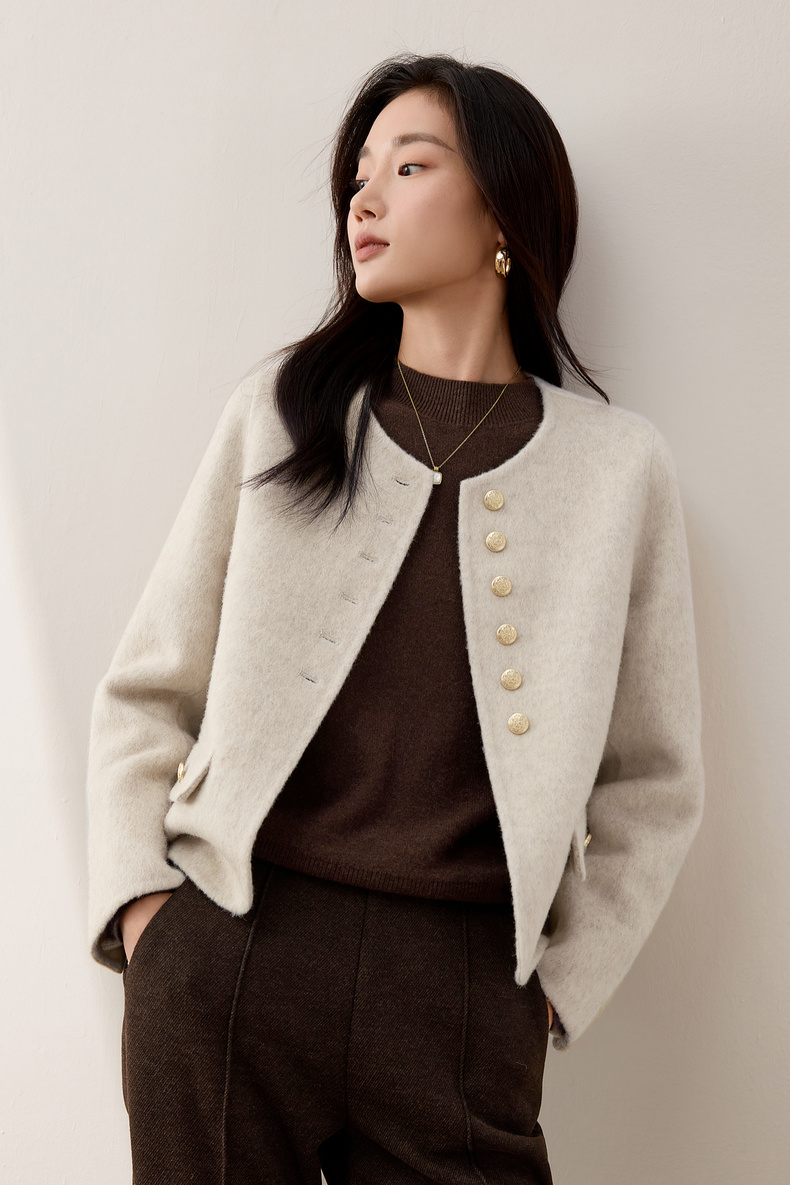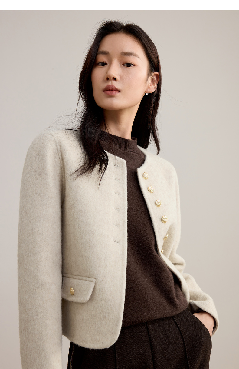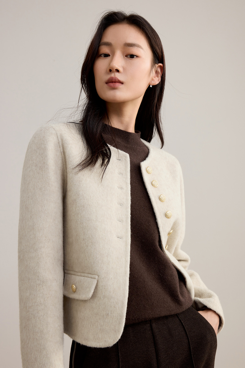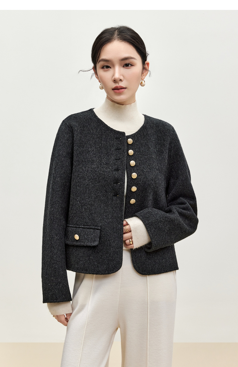【内购】【含绵羊毛】优雅气质通勤圆领浮雕金属扣长袖短款厚保暖毛呢外套-W44O56591