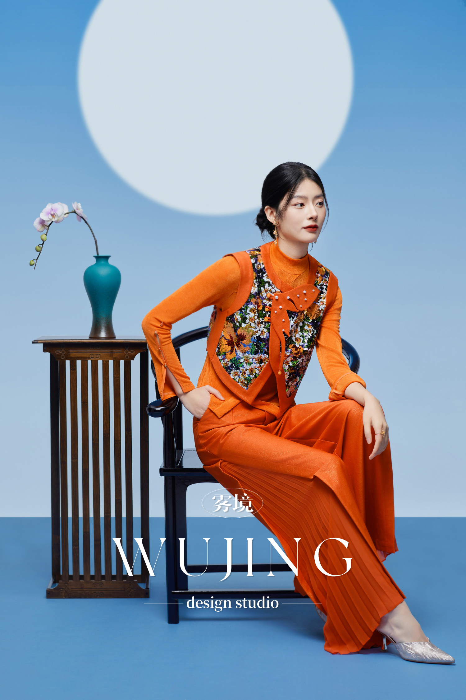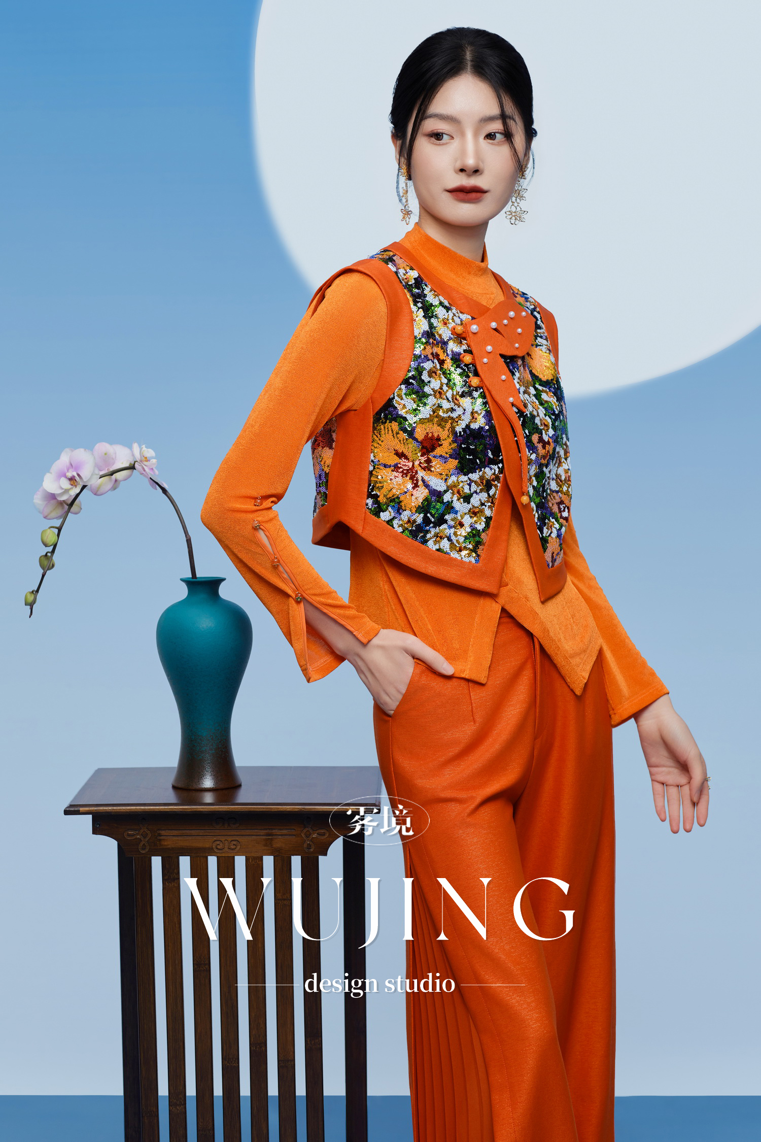 3205225 醉日焦橙 重磅花色亮片/韩国进口醋酸缎马甲 雾境