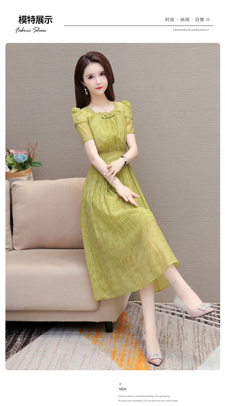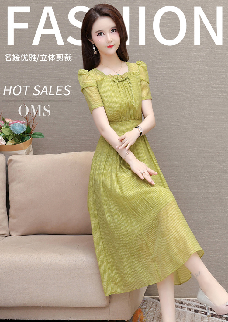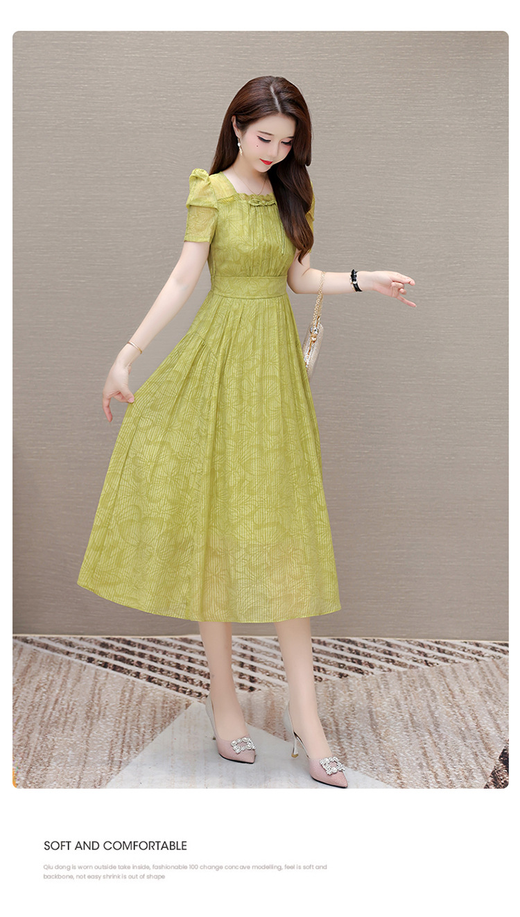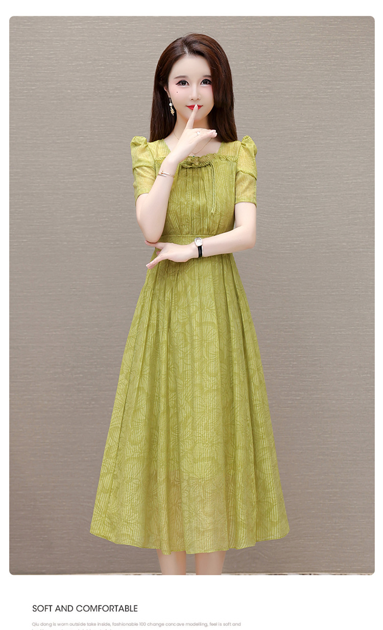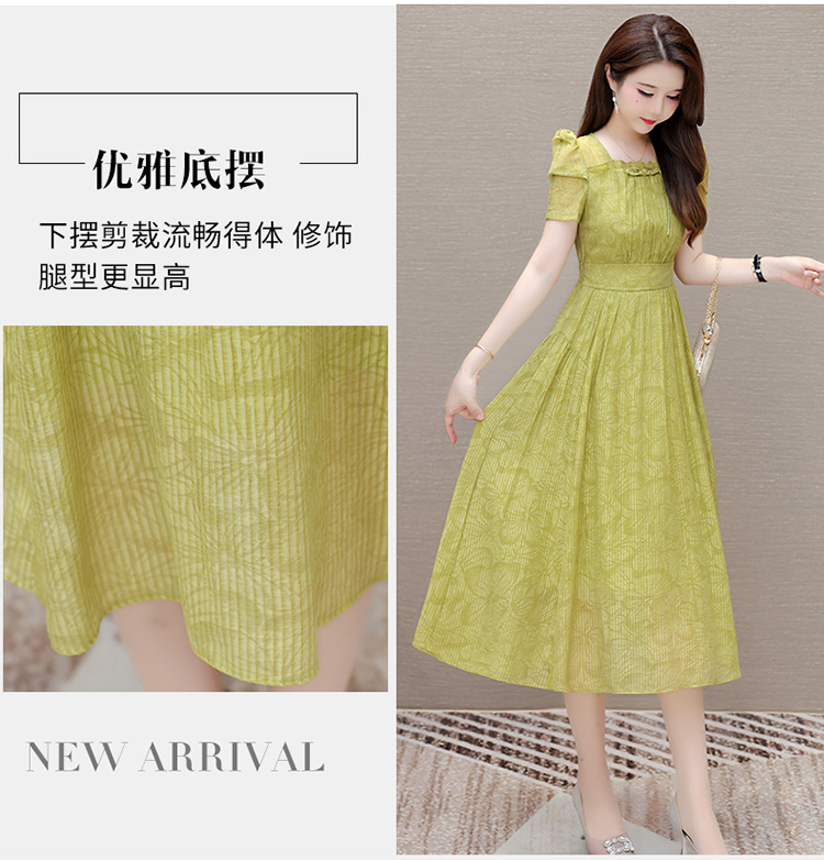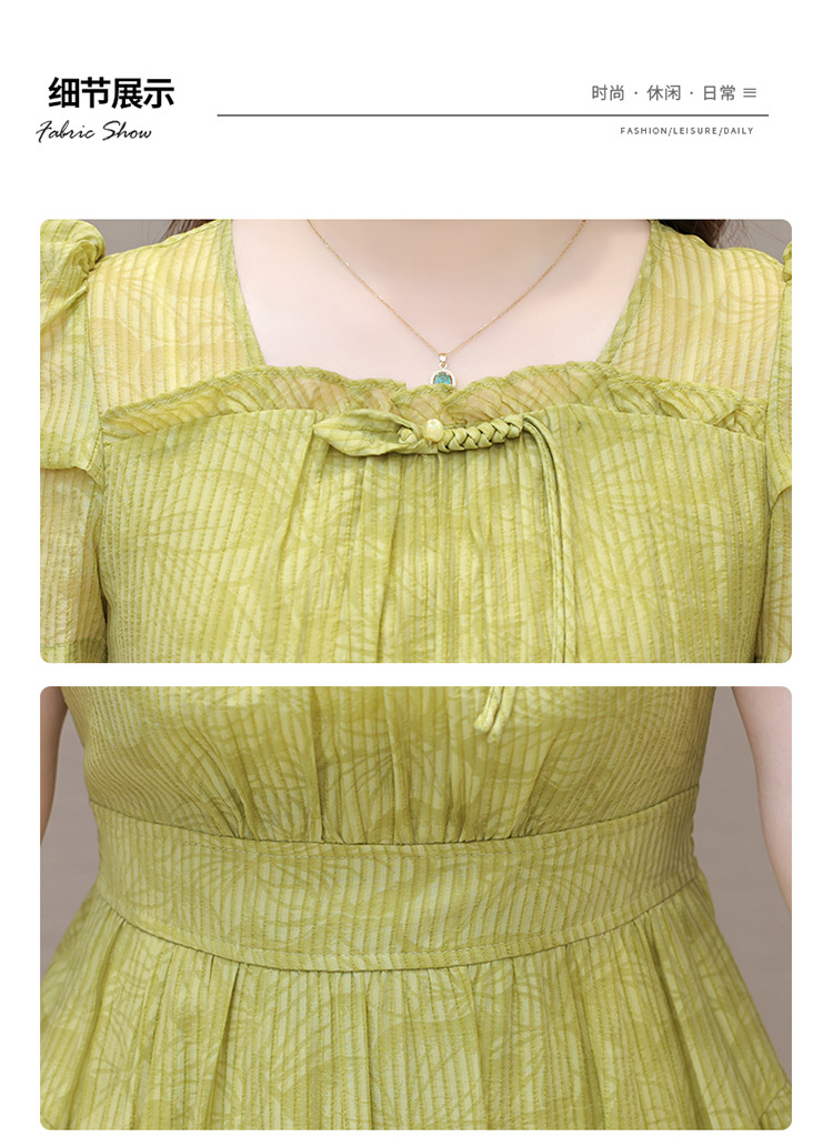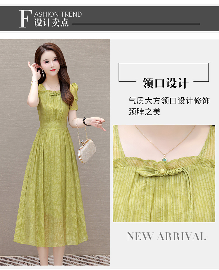 印花时尚皱褶拼接洋气A字裙,方领短袖显瘦修身连衣裙QYM-OMS-ZXA4156-L