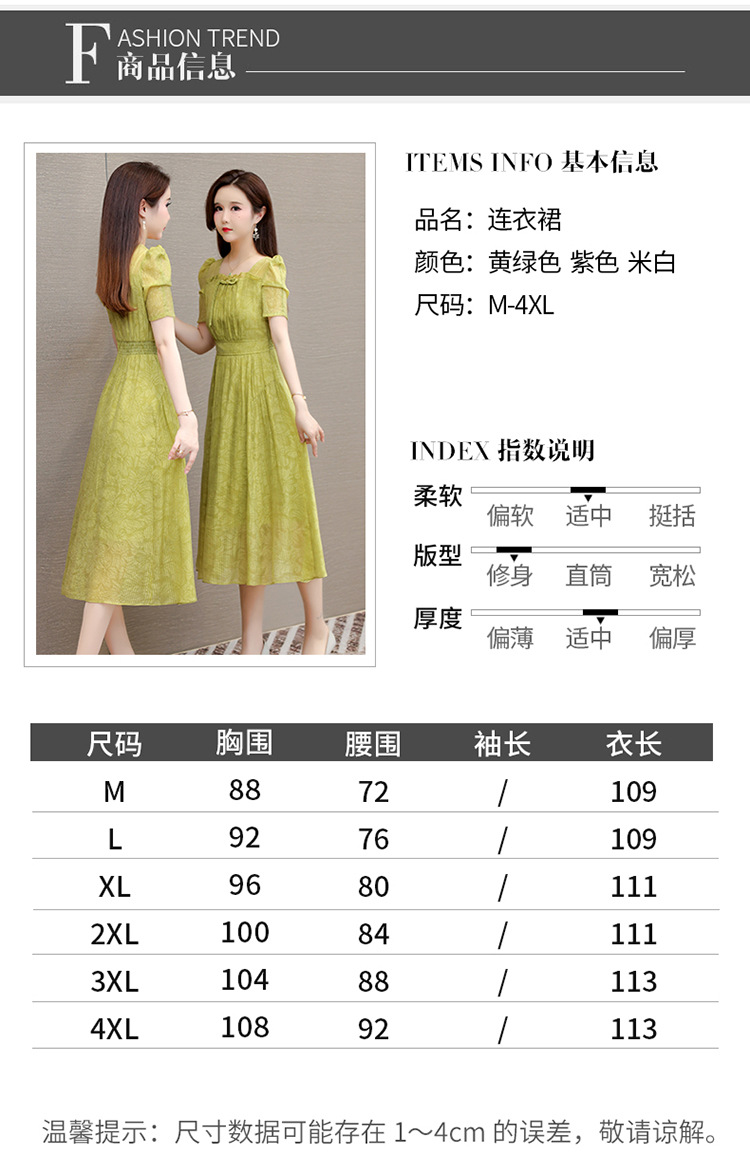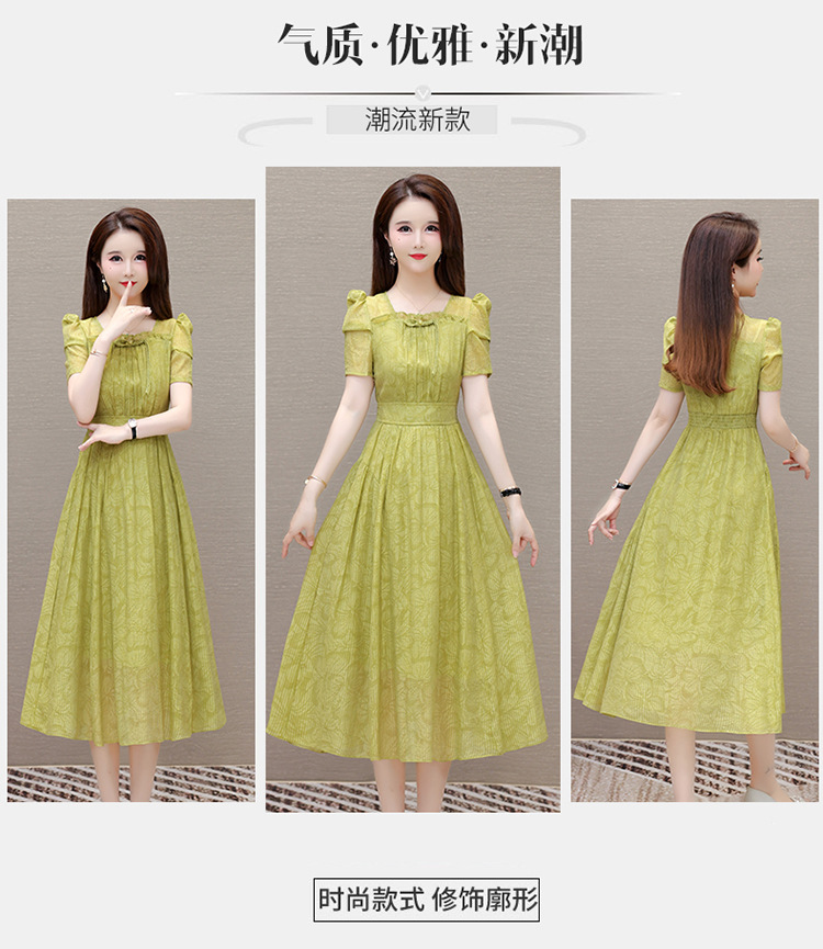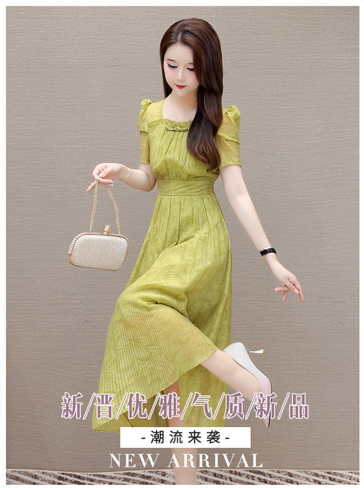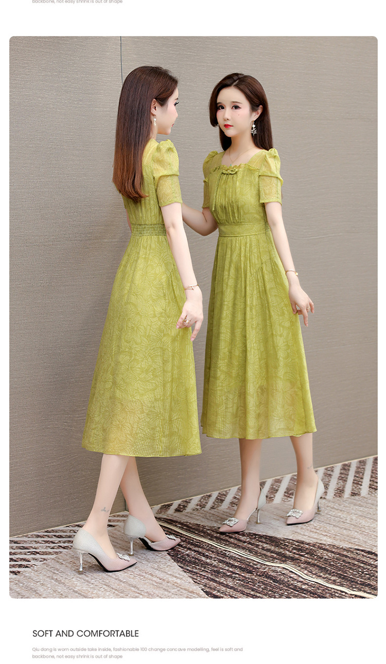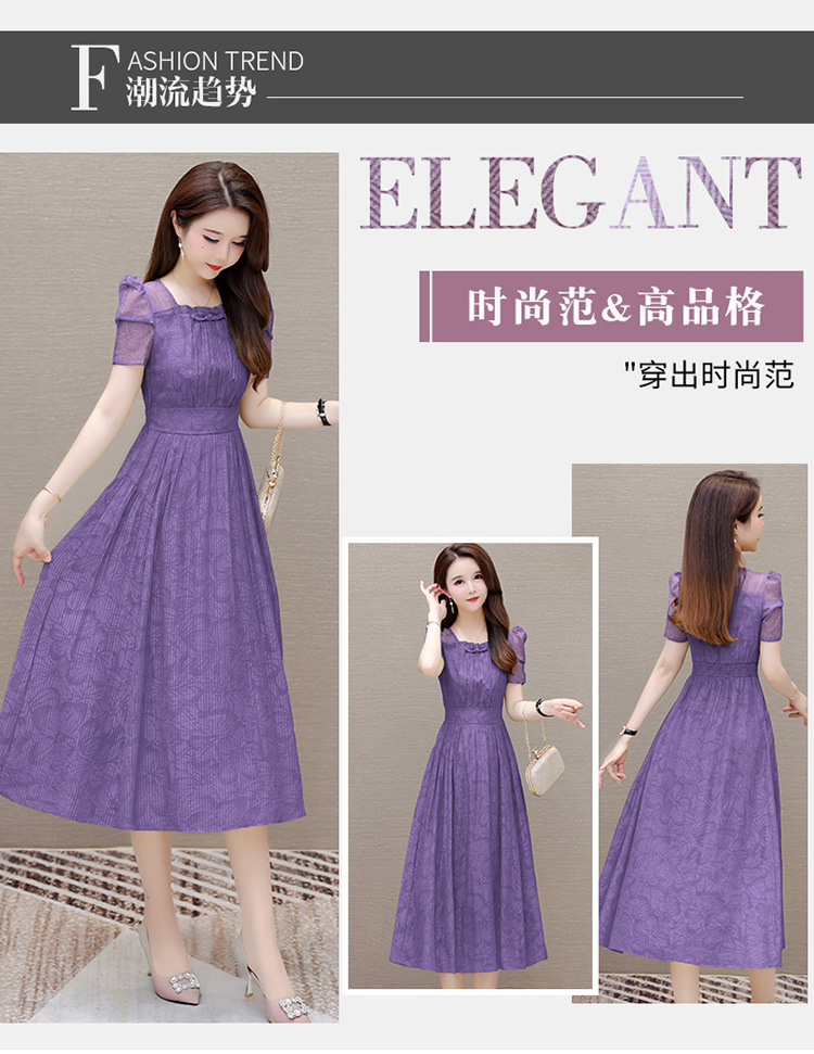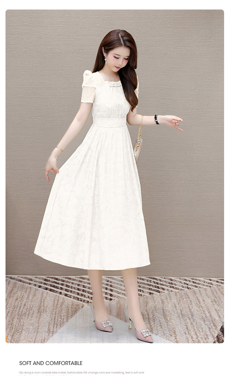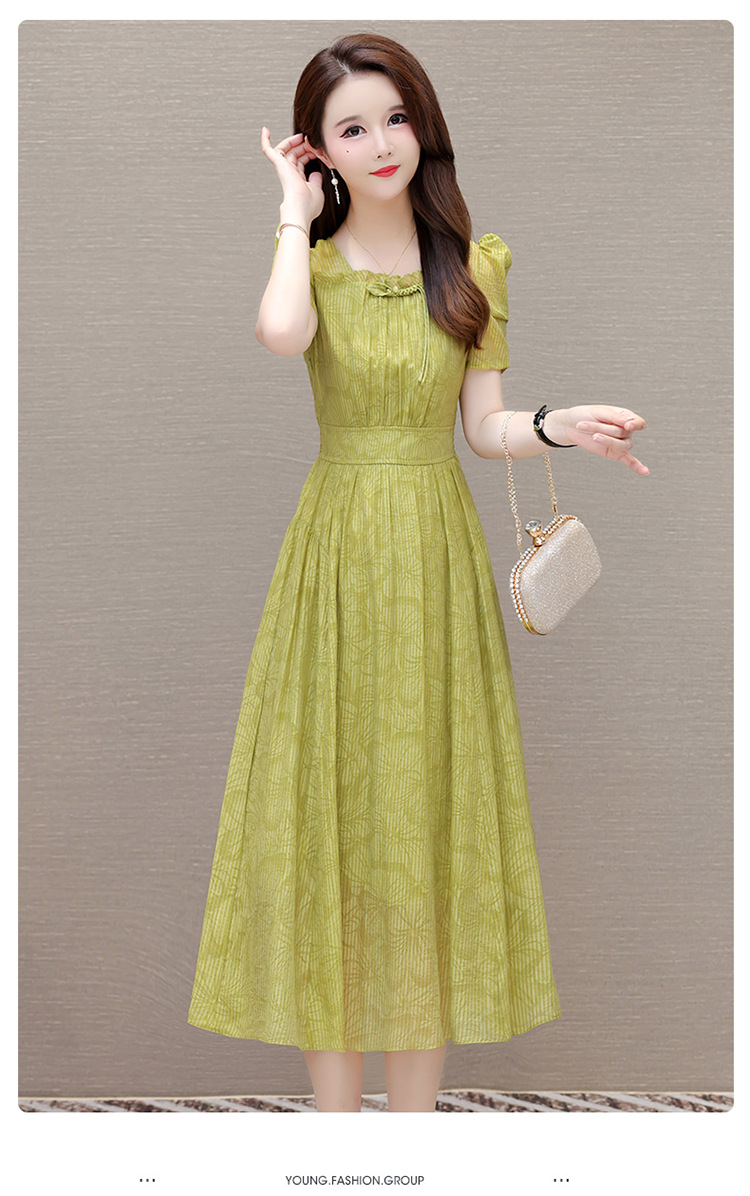 印花时尚皱褶拼接洋气A字裙,方领短袖显瘦修身连衣裙QYM-OMS-ZXA4156-L