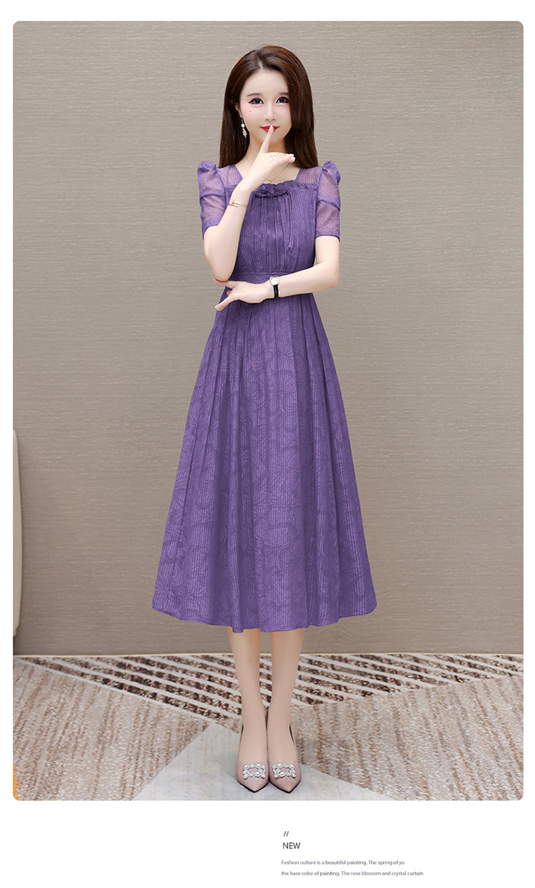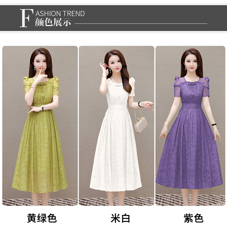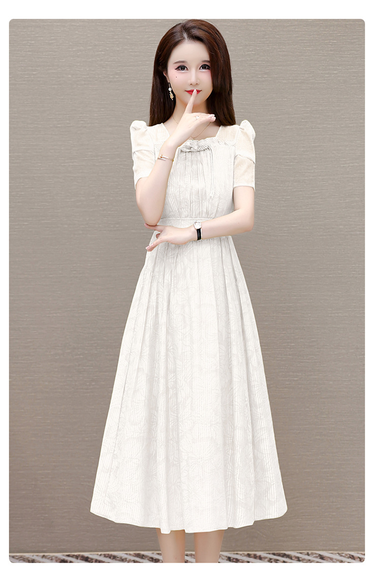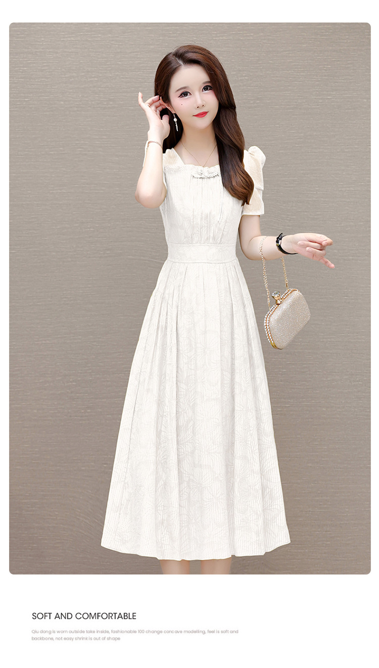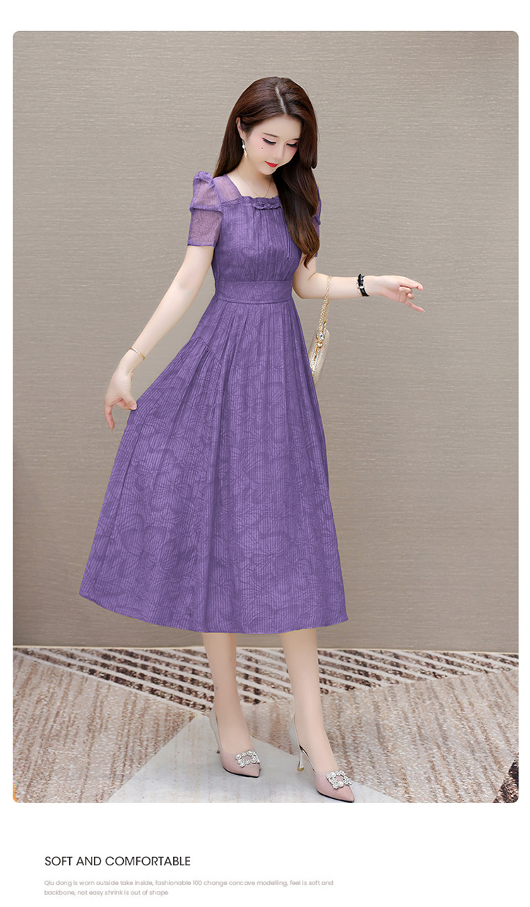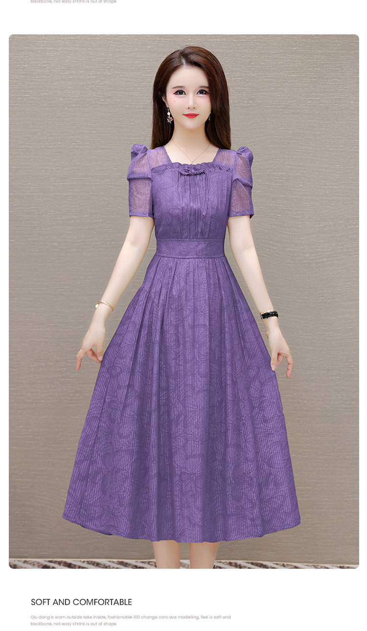 印花时尚皱褶拼接洋气A字裙,方领短袖显瘦修身连衣裙QYM-OMS-ZXA4156-L