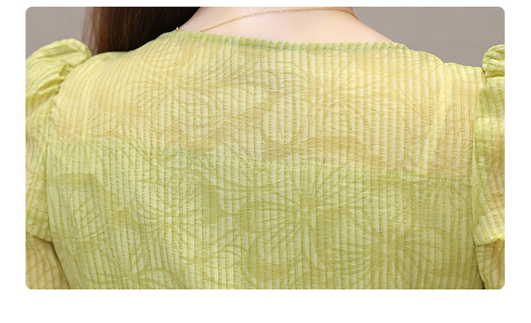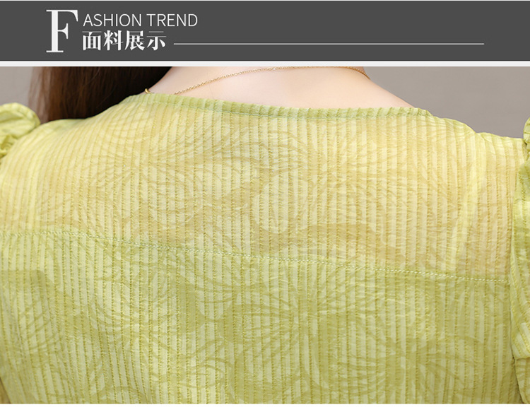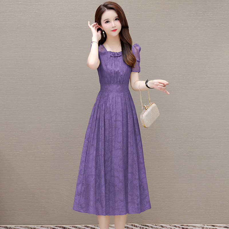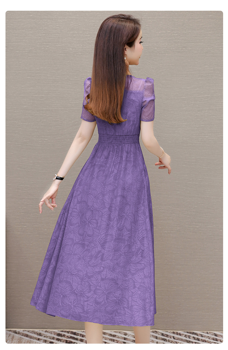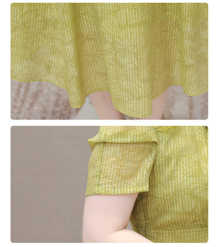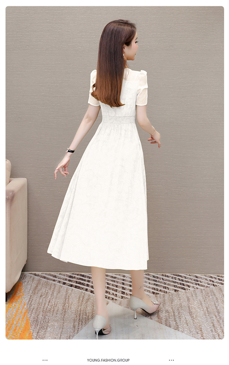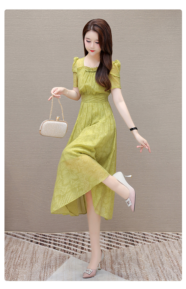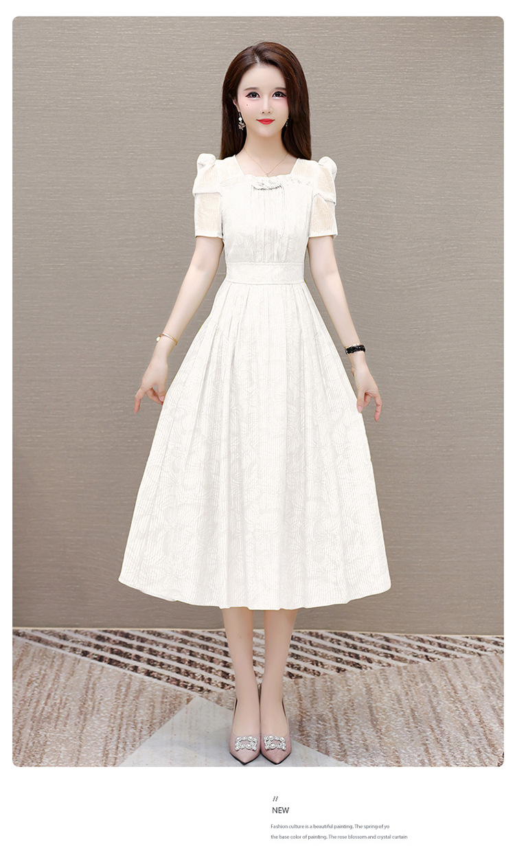 印花时尚皱褶拼接洋气A字裙,方领短袖显瘦修身连衣裙QYM-OMS-ZXA4156-L