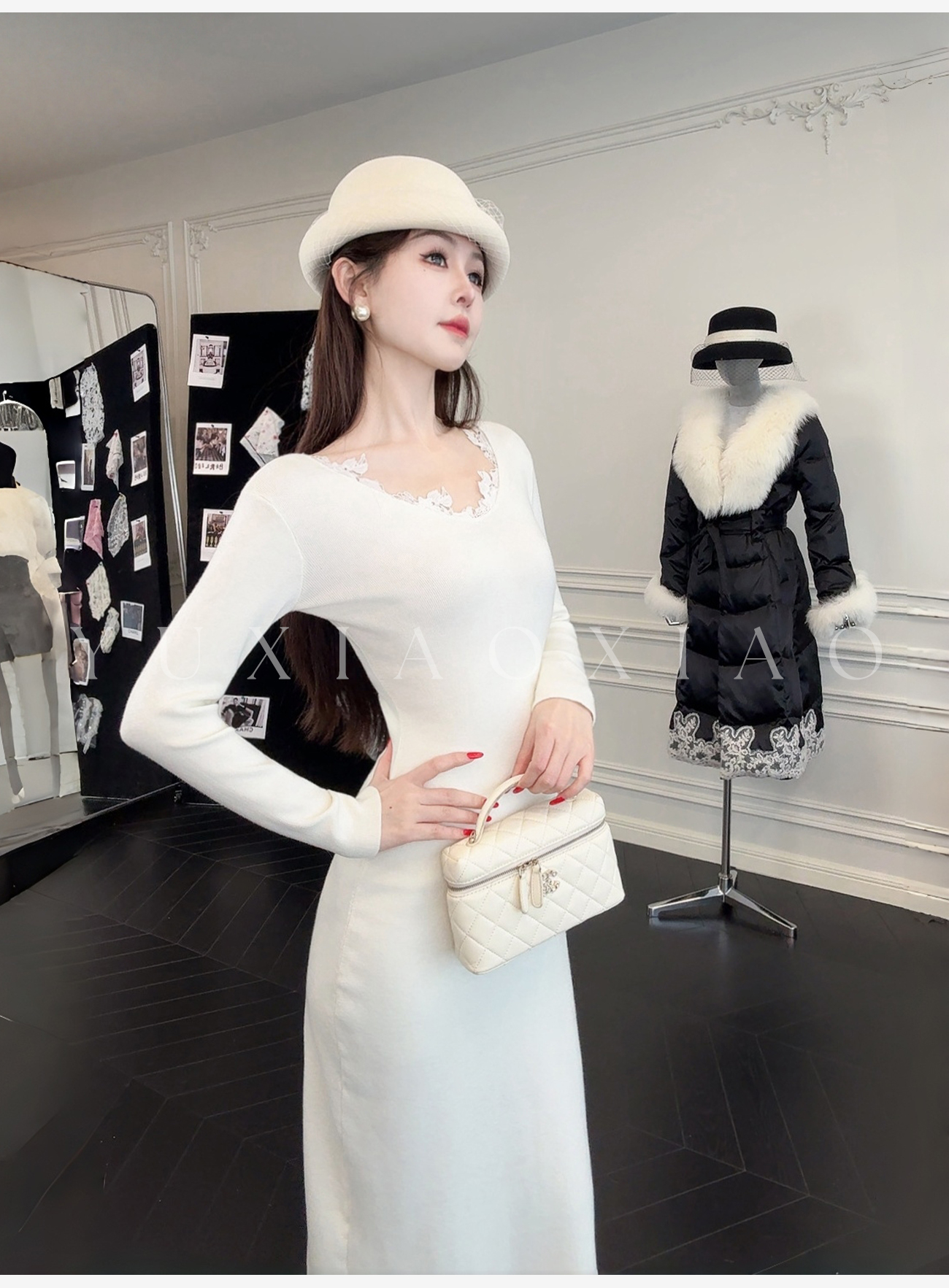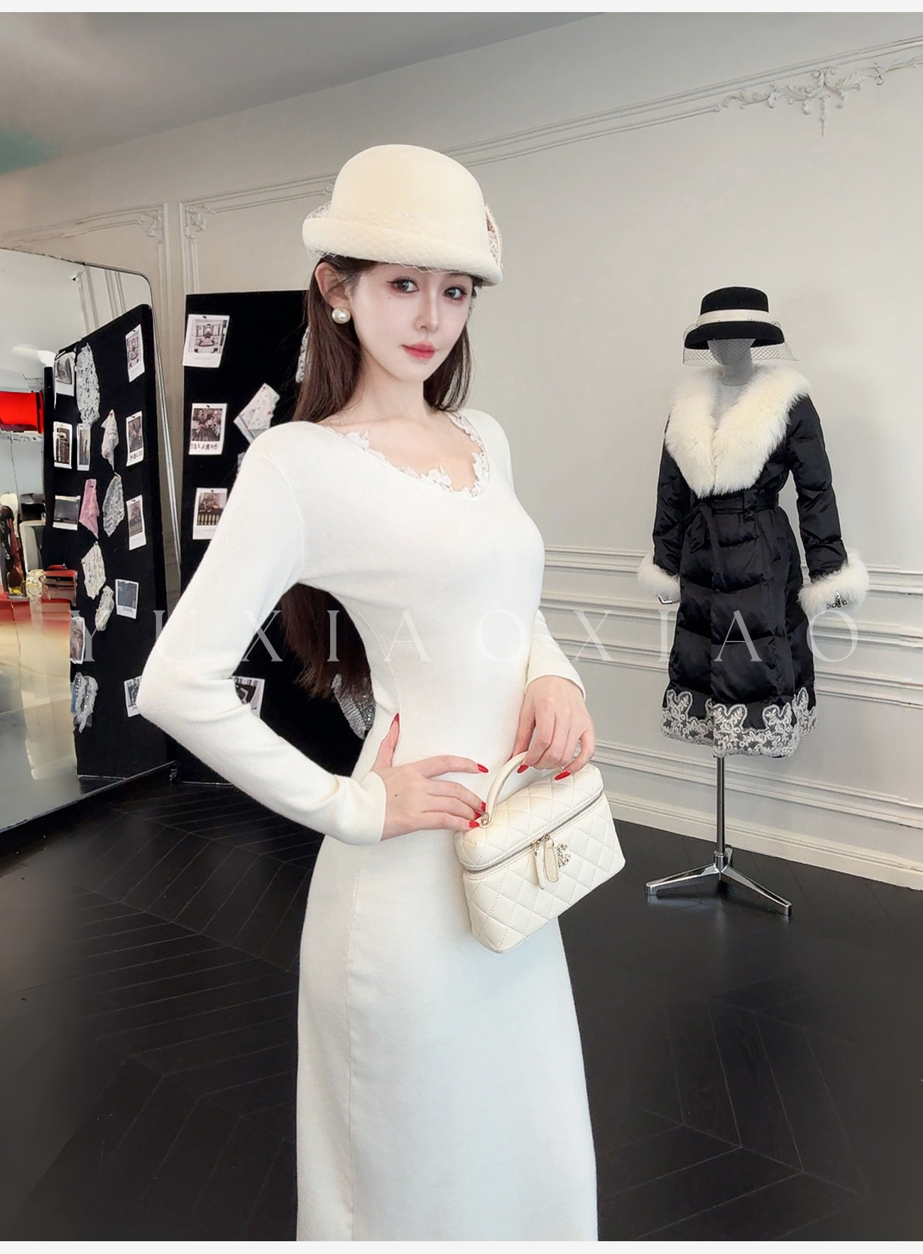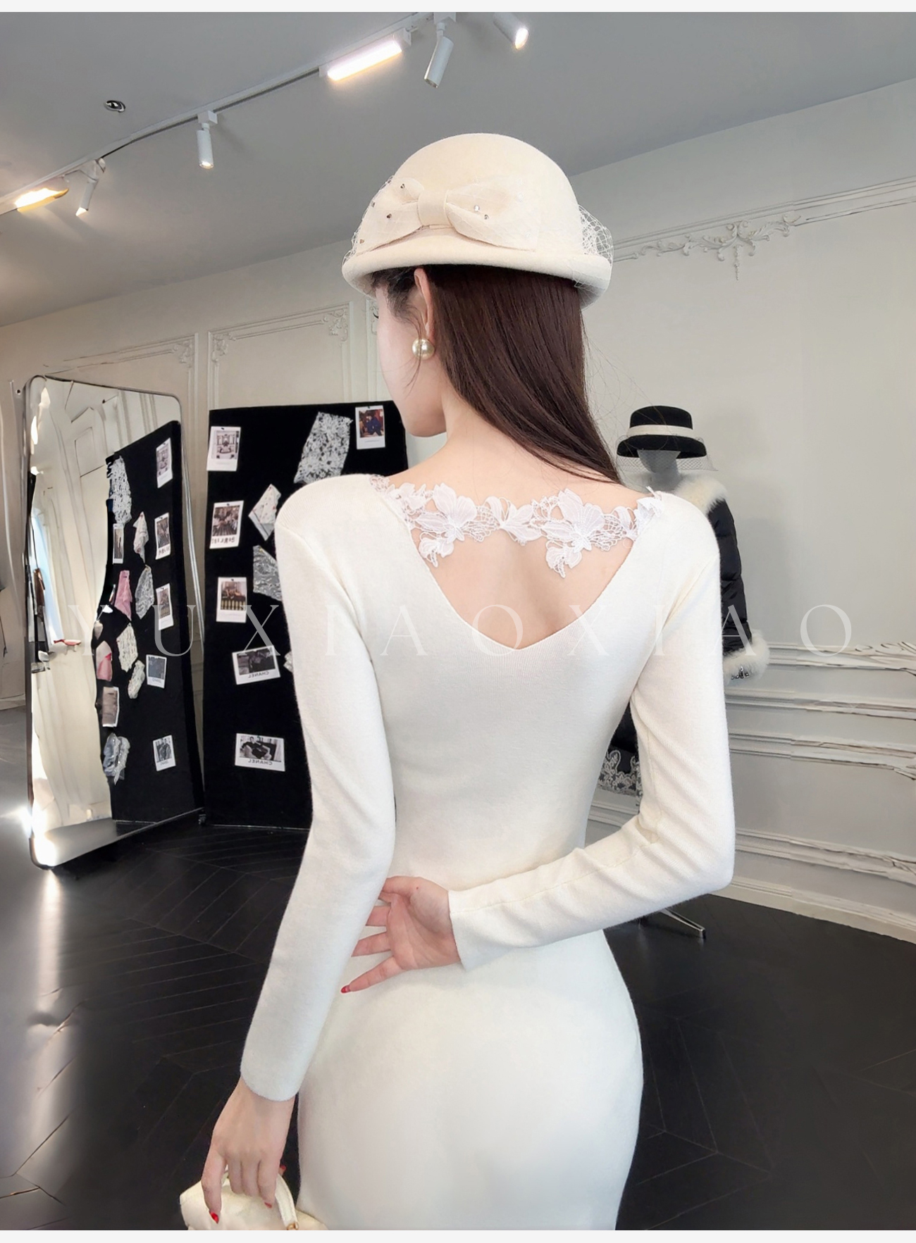 余潇潇【纯欲曲线】绵羊毛混纺前后V领拼接蕾丝设计修身长款连衣裙
