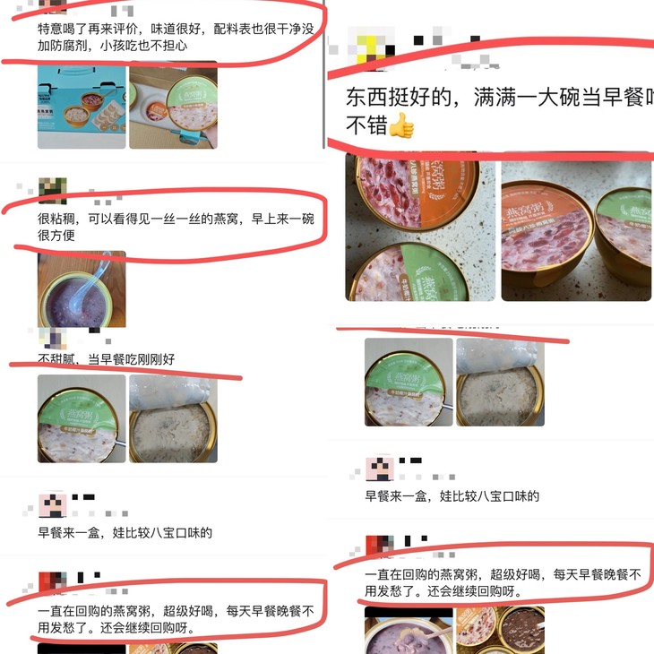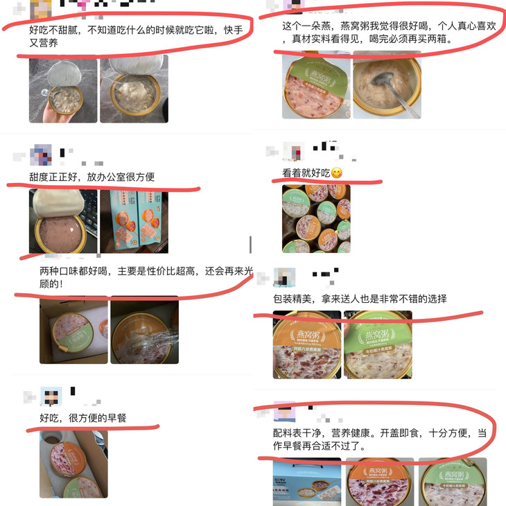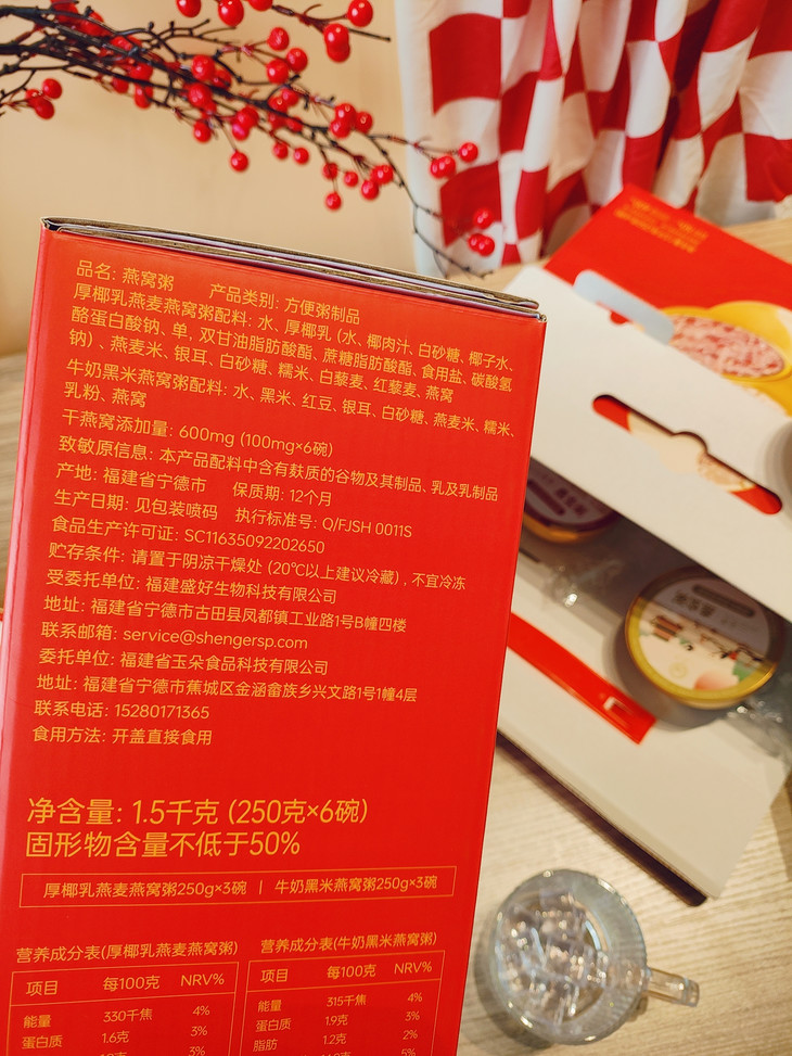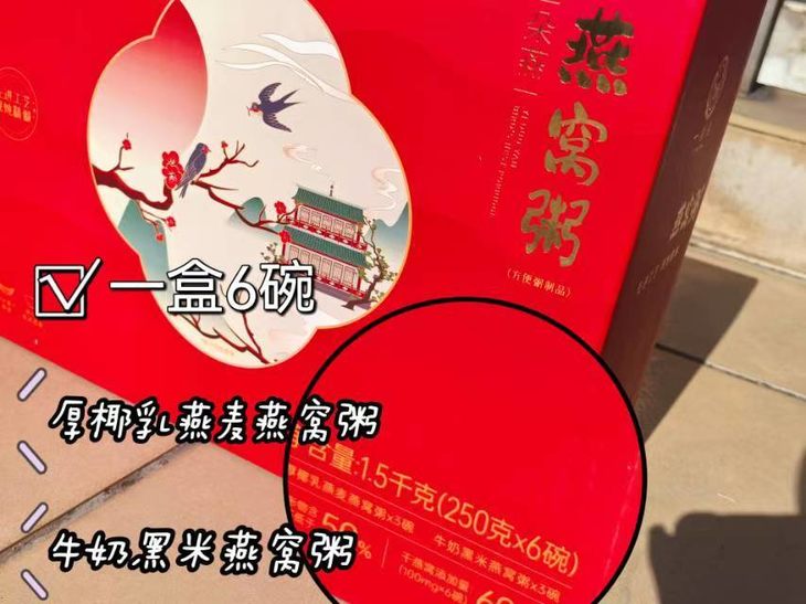 1碗足足250g不是小碗装165g,每天一碗吃出好气色!胜过10张面膜 一箱两种口味👇👇👇 厚椰乳燕麦燕窝粥 配料:水、厚椰乳(水、椰肉汁、白砂糖、椰子水、酪蛋白酸钠、单,双甘油脂肪酸酯、蔗糖脂肪酸酯、食用盐、碳酸氢钠)、燕麦米、银耳、白砂糖、糯米、白藜麦、红藜麦、燕窝 牛奶黑米燕窝粥 配料:水、黑米、红豆、银耳、白砂糖、燕麦米、糯米、乳粉、燕窝