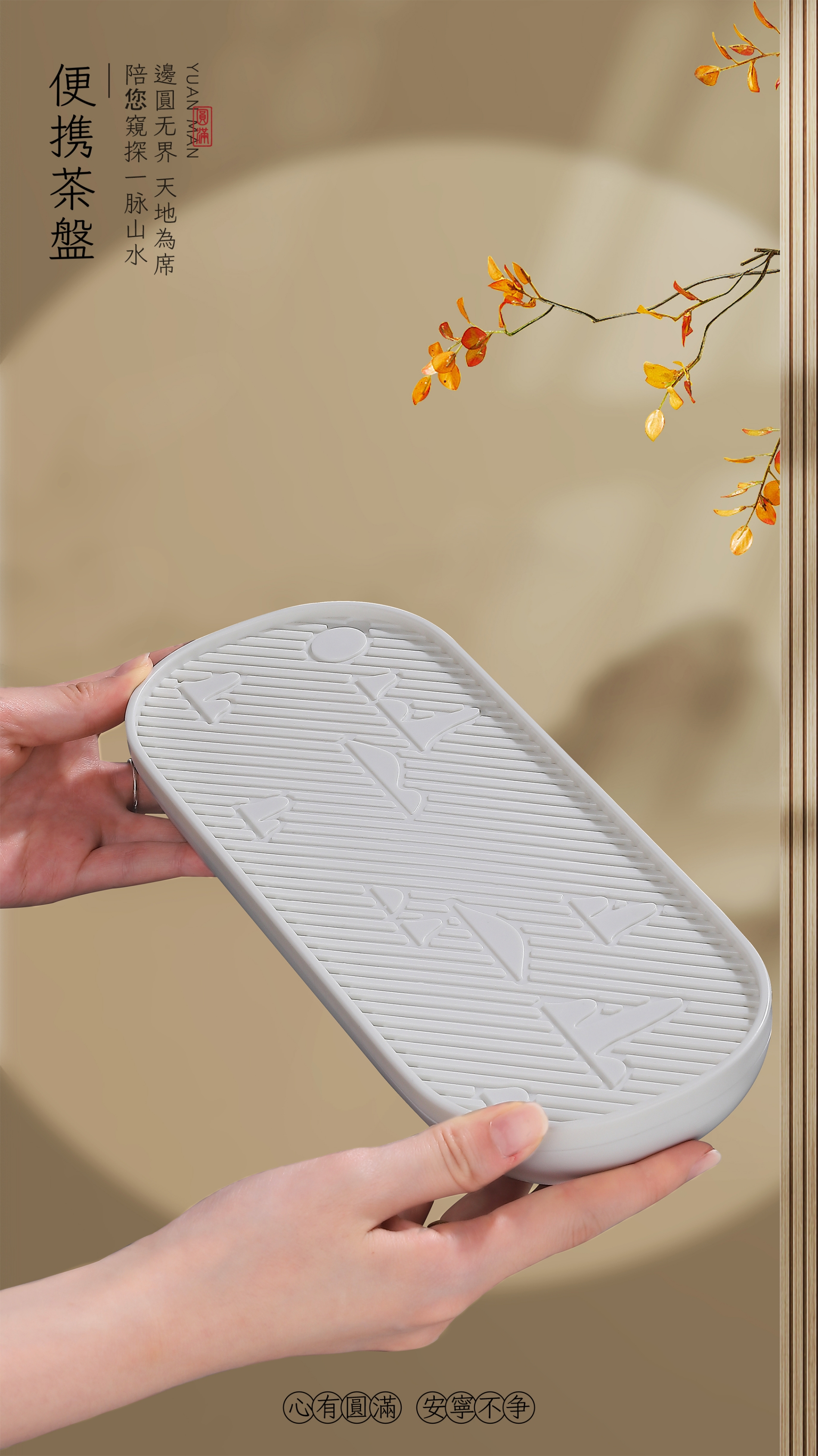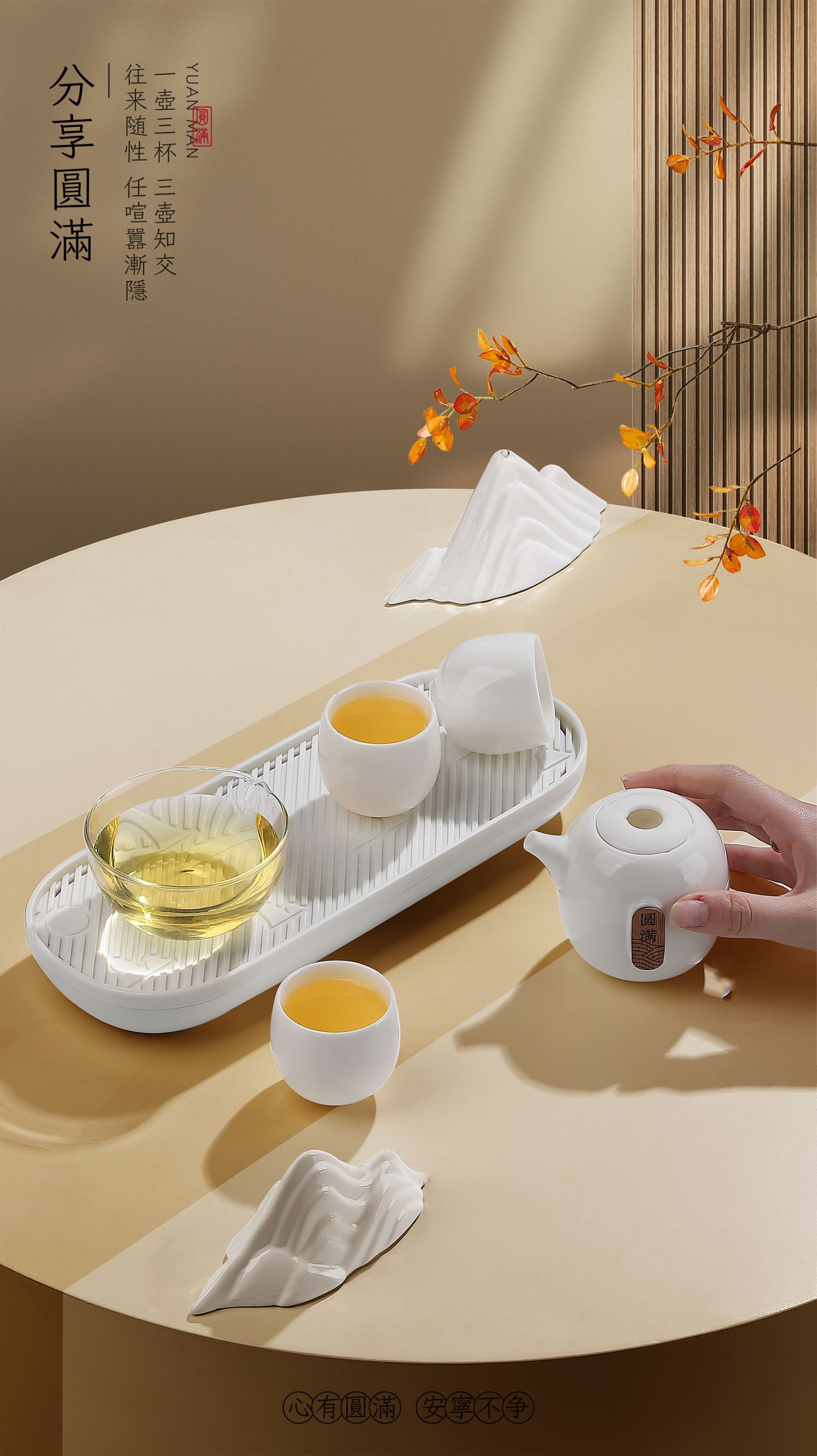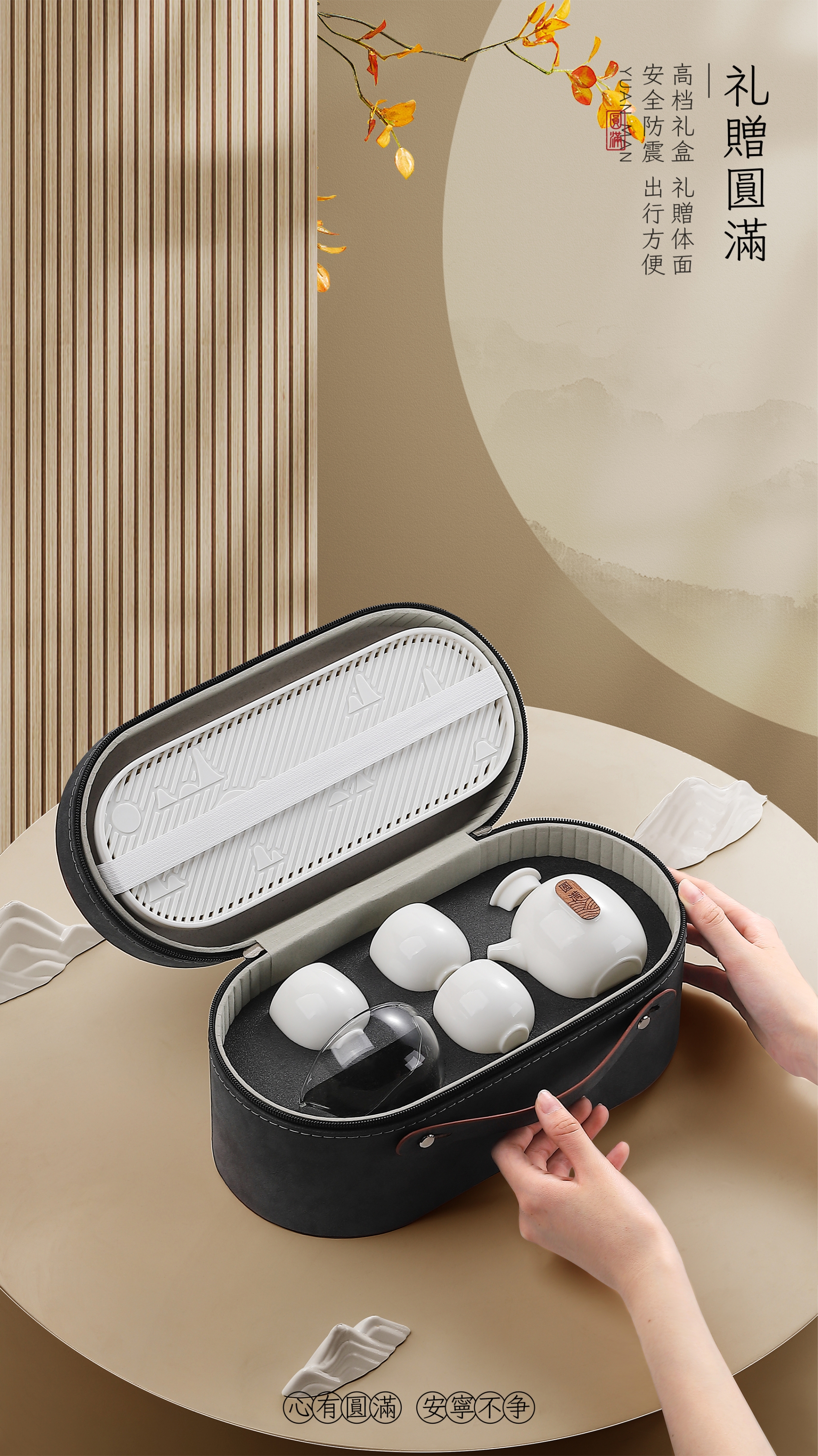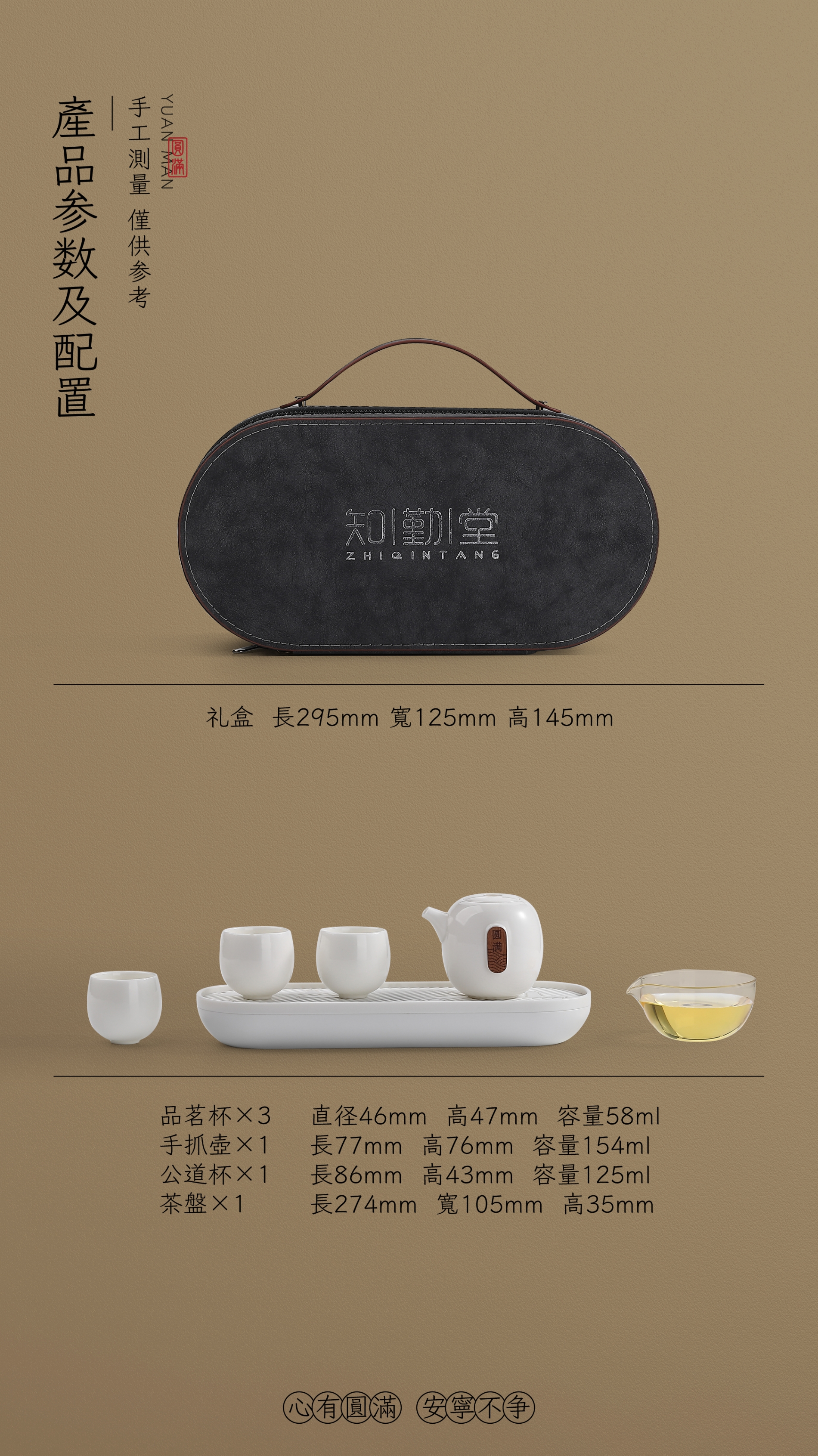 茶器混元内敛,圆融自洽,圆包容天地万象。一壶三杯配置,往来随性,任喧嚣渐隐。旅行皮包茶盘配置,边圆无界,天地为席陪您窥探一脉山水。