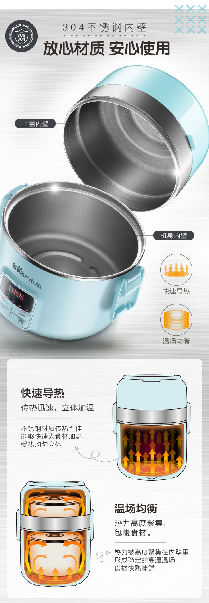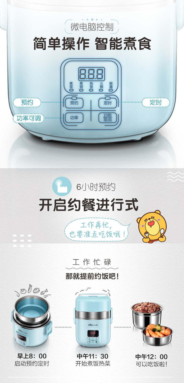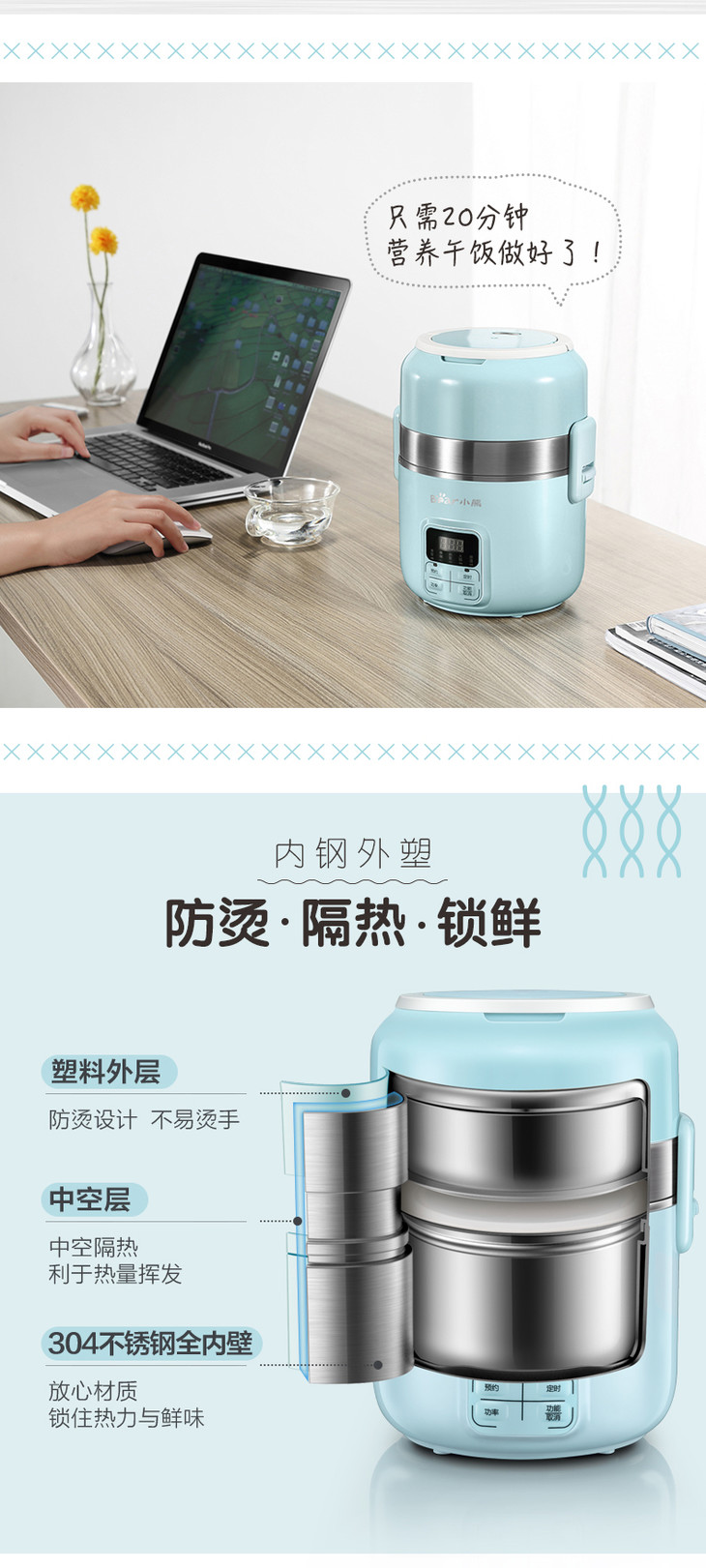 【预售 3.28发货】小熊(Bear) 电热饭盒 保温饭盒可插电加热煮蒸饭器全钢内壁抽真空热饭锅 DFH-B20J1 蓝色 可煮面涮火锅