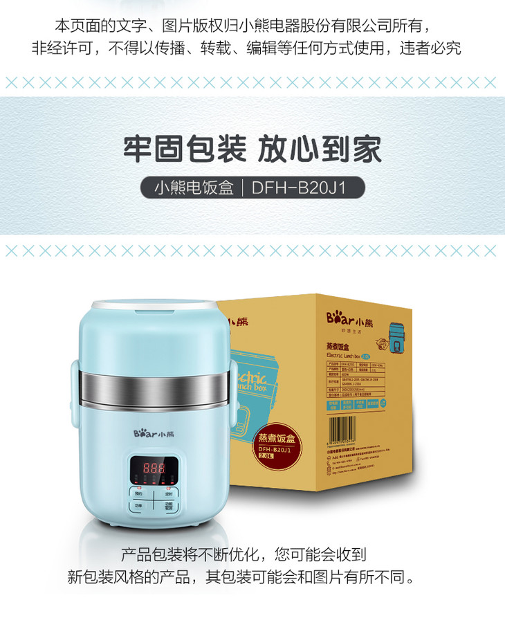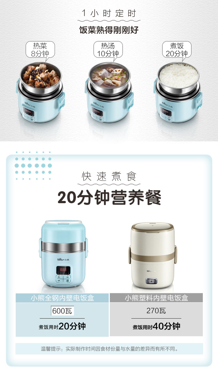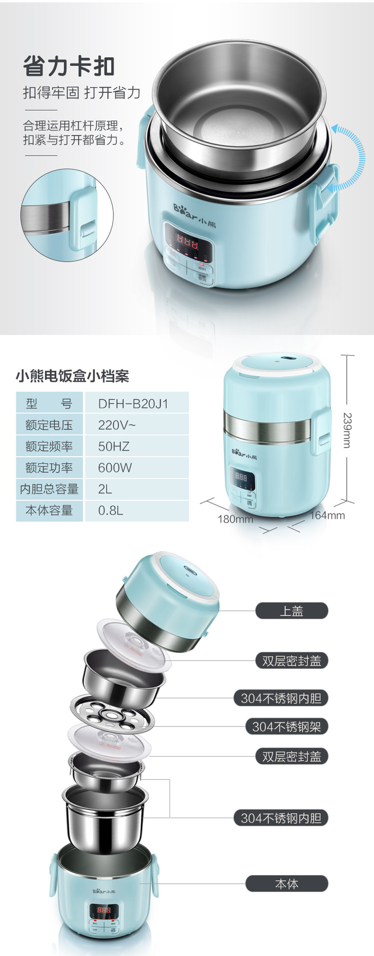 【预售 3.28发货】小熊(Bear) 电热饭盒 保温饭盒可插电加热煮蒸饭器全钢内壁抽真空热饭锅 DFH-B20J1 蓝色 可煮面涮火锅