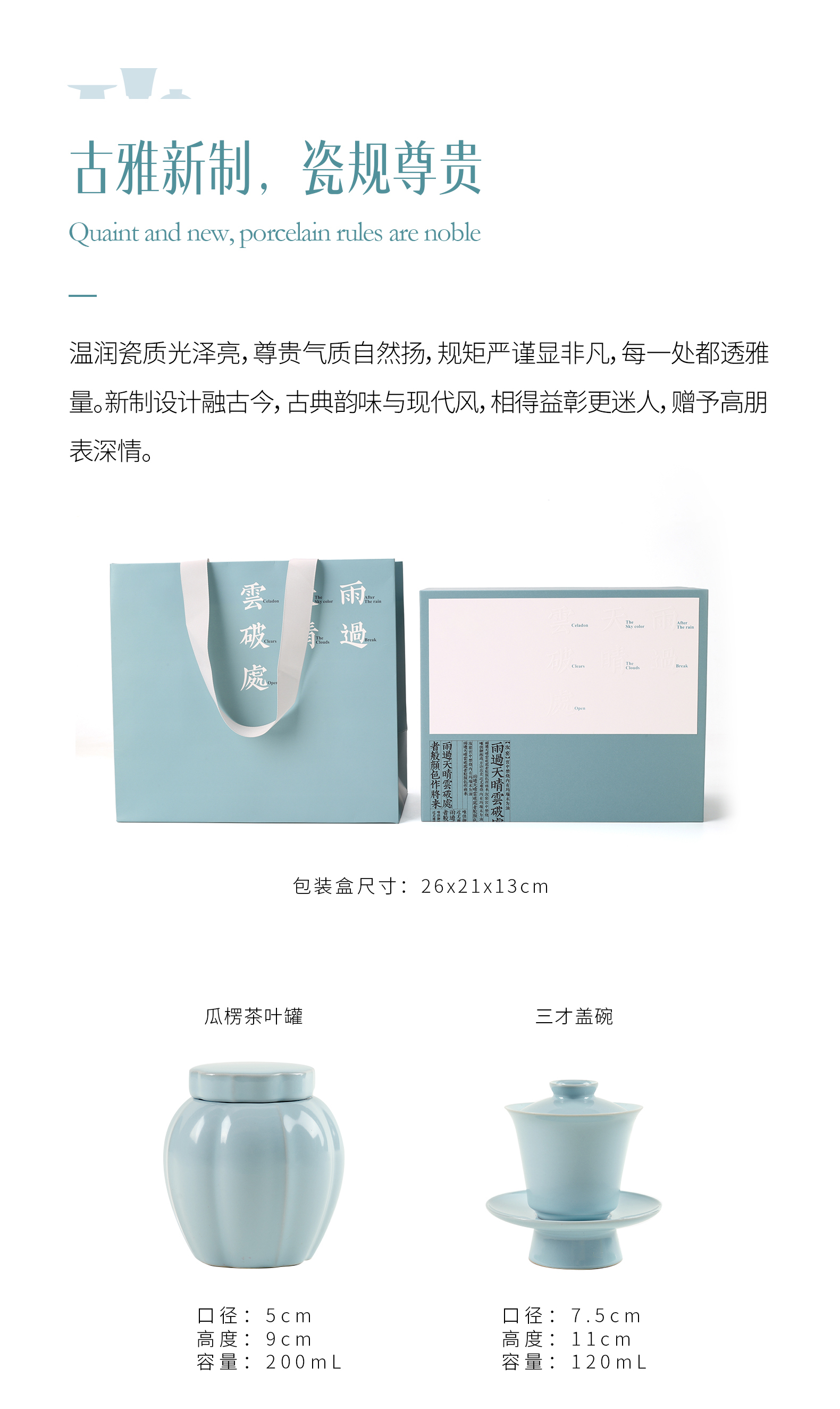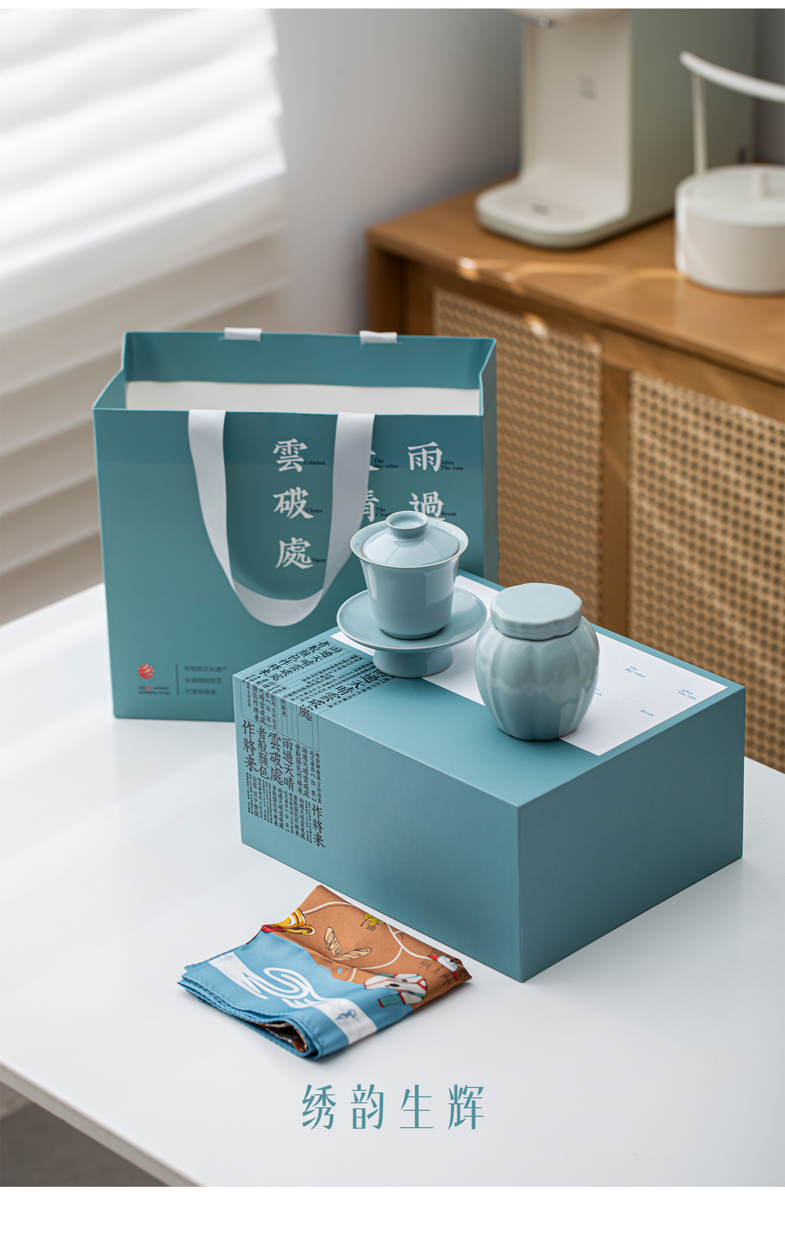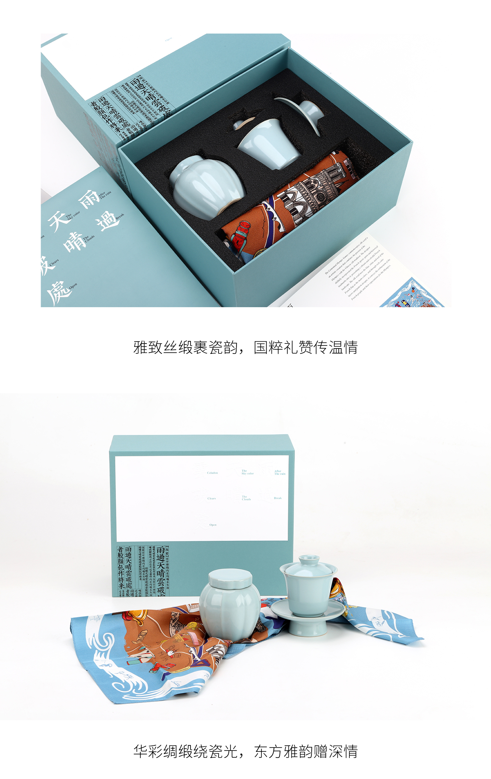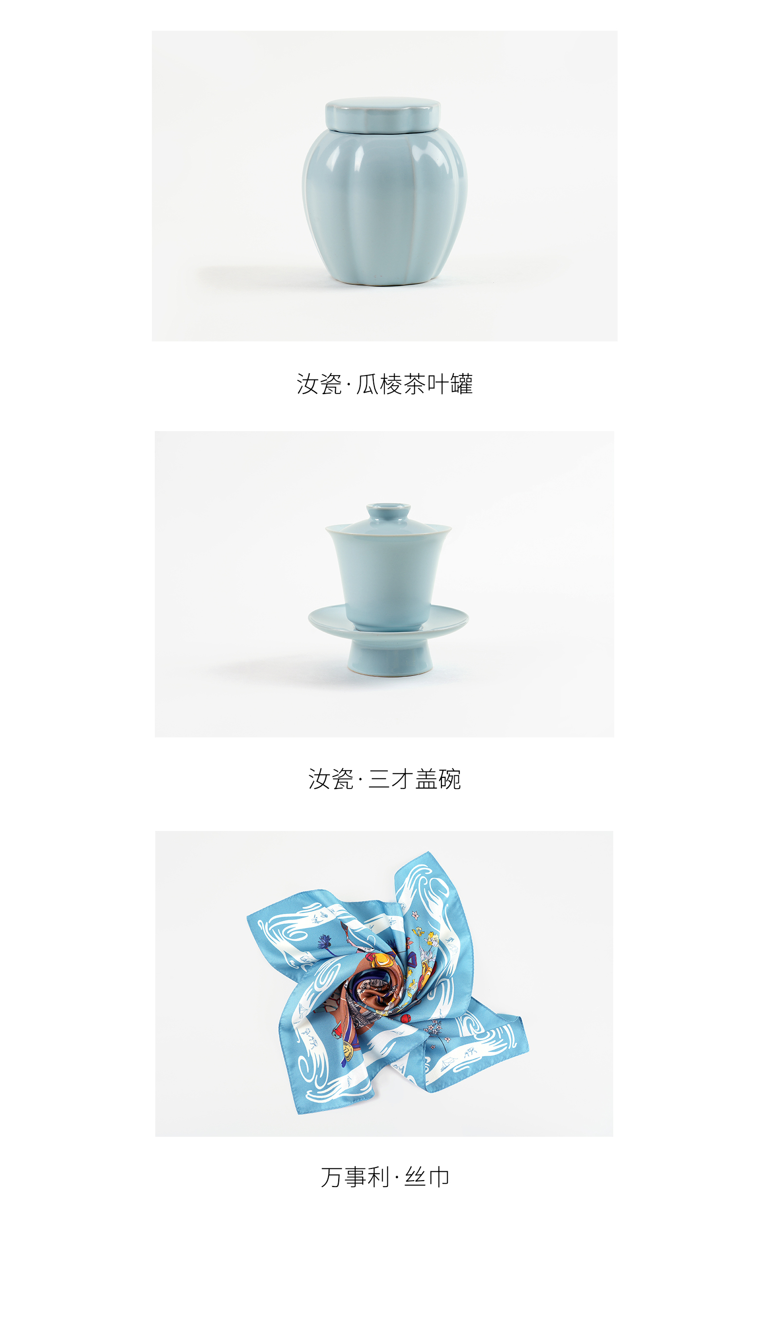 汝山明汝瓷瓜棱茶叶罐三才盖碗茶杯主人杯万事利丝巾丝绸瓷器礼盒