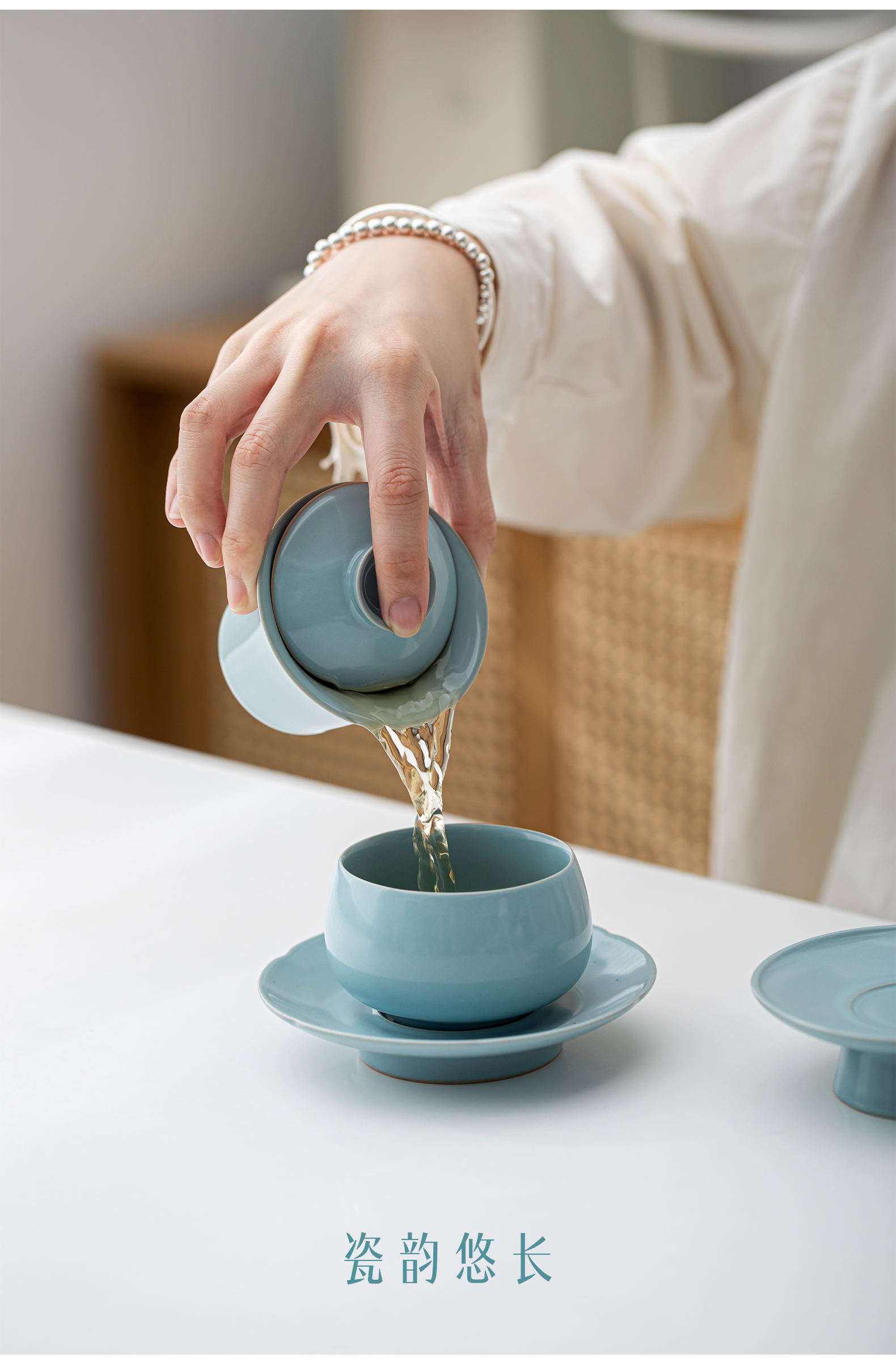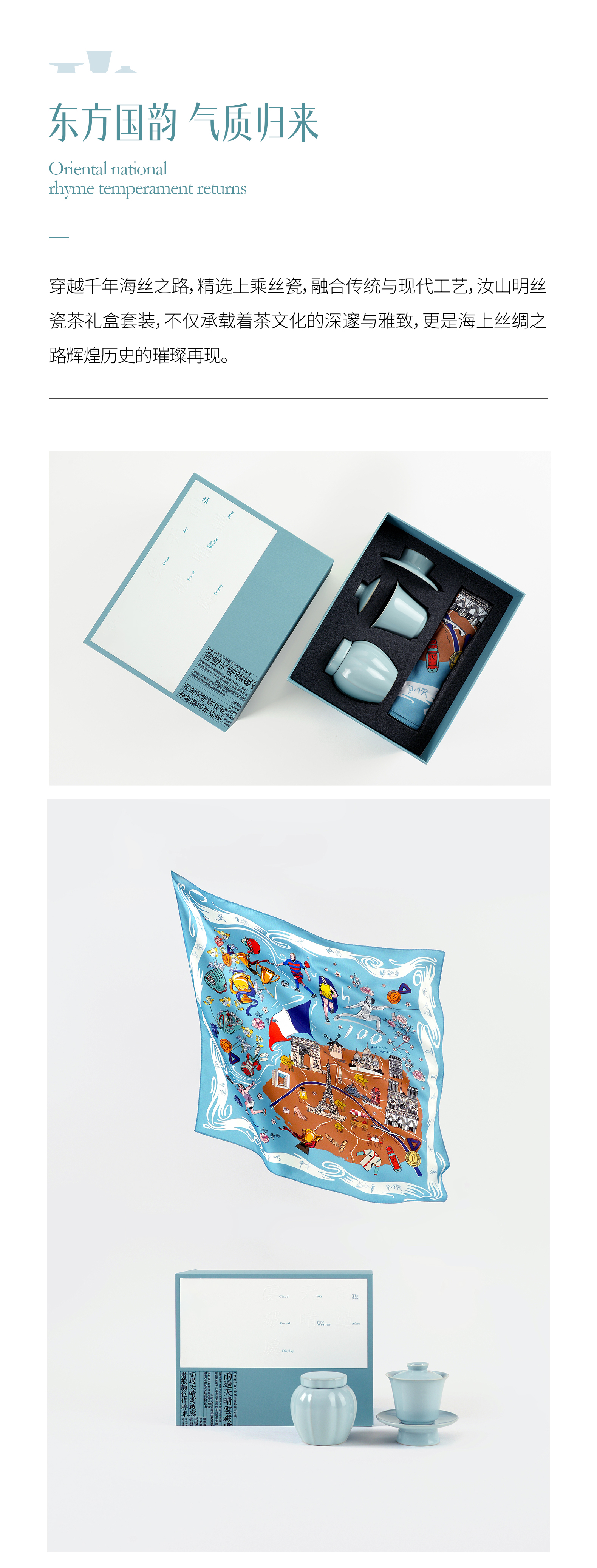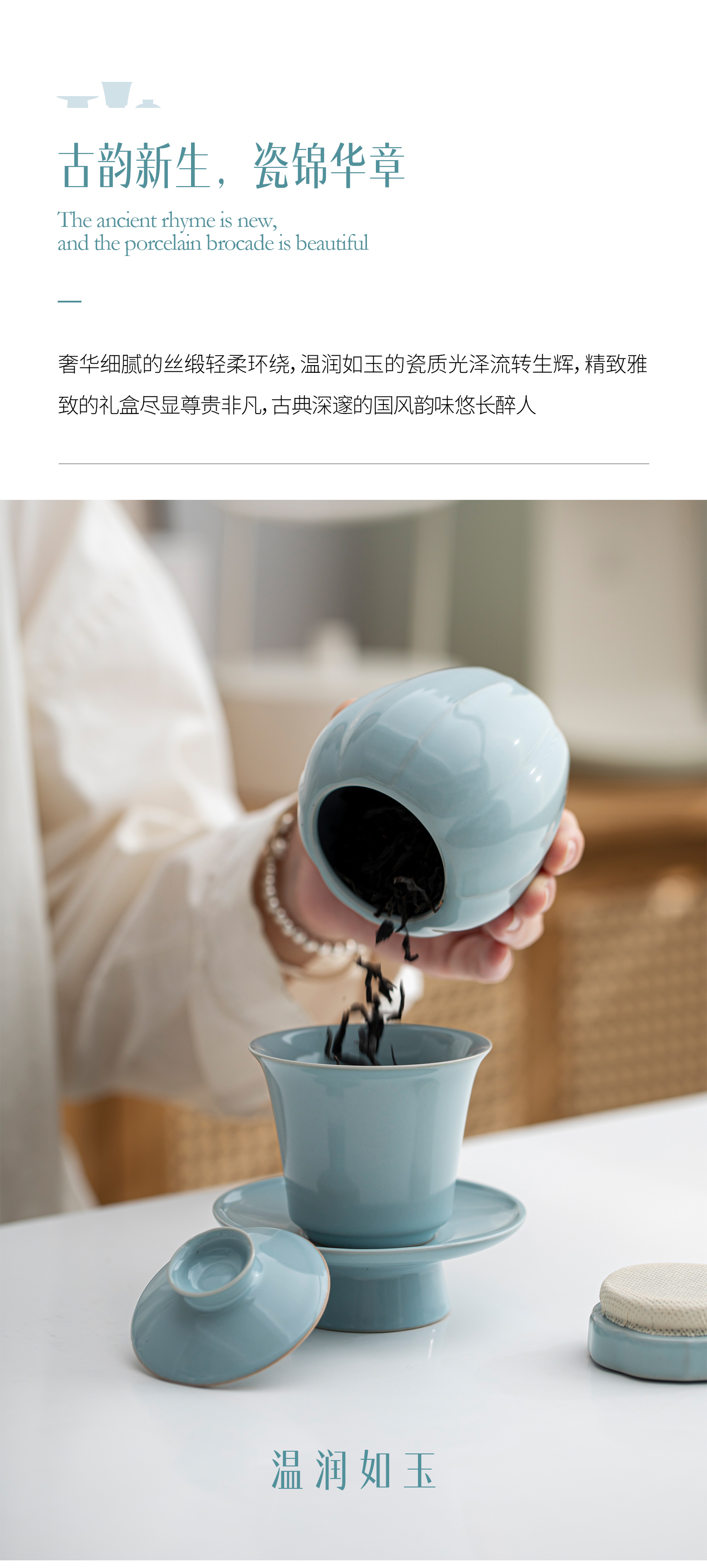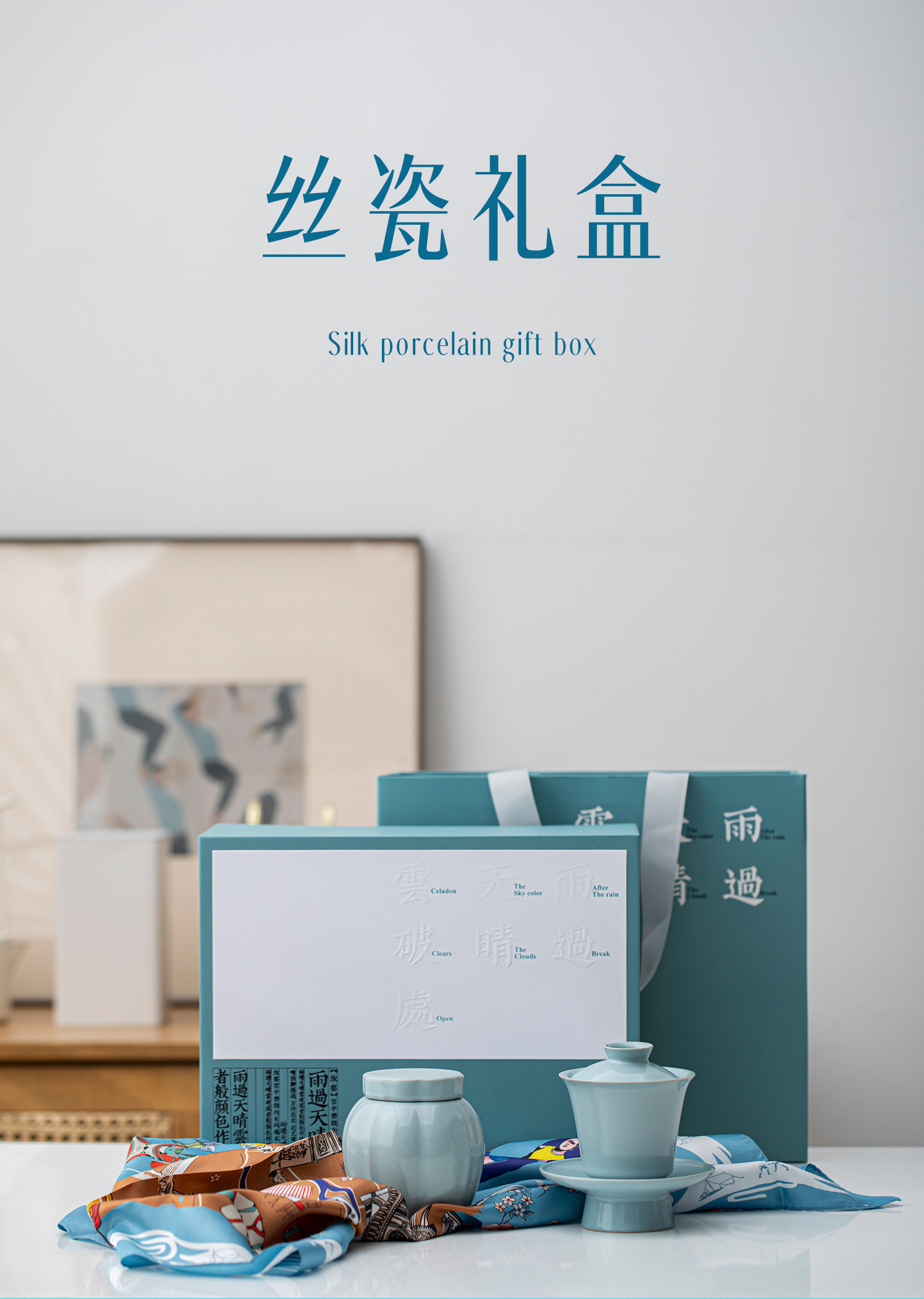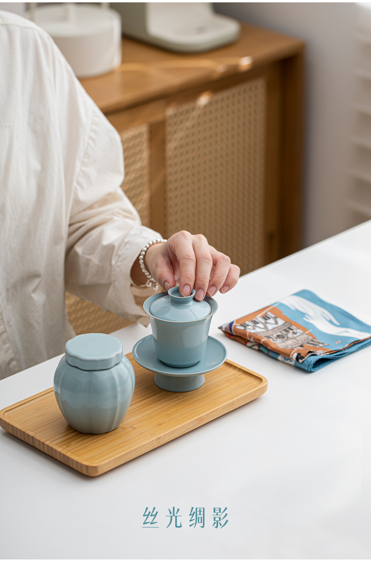 汝山明汝瓷瓜棱茶叶罐三才盖碗茶杯主人杯万事利丝巾丝绸瓷器礼盒