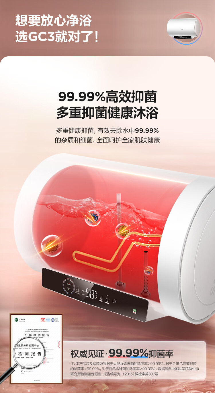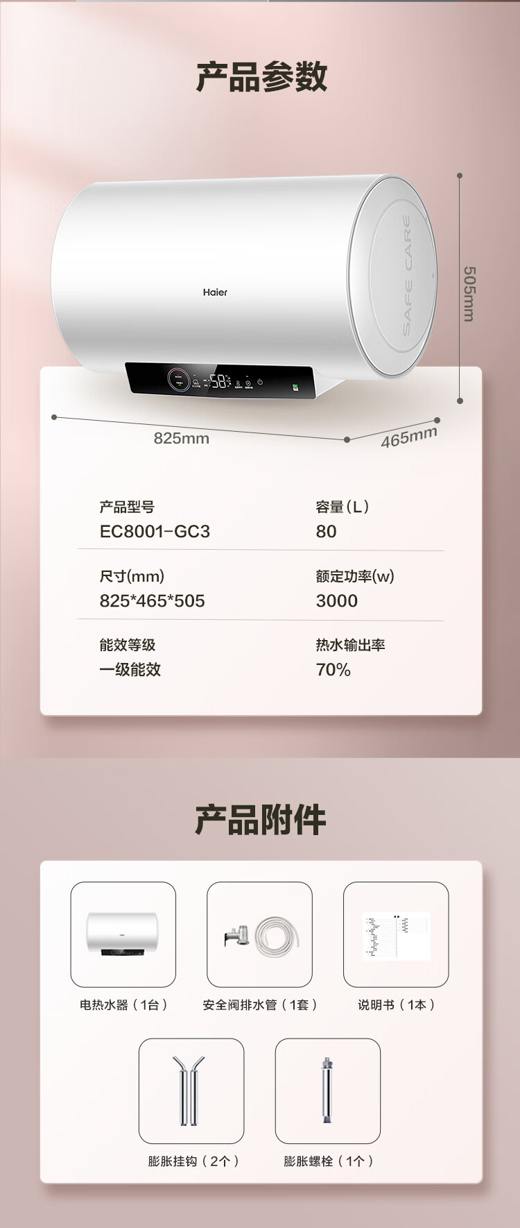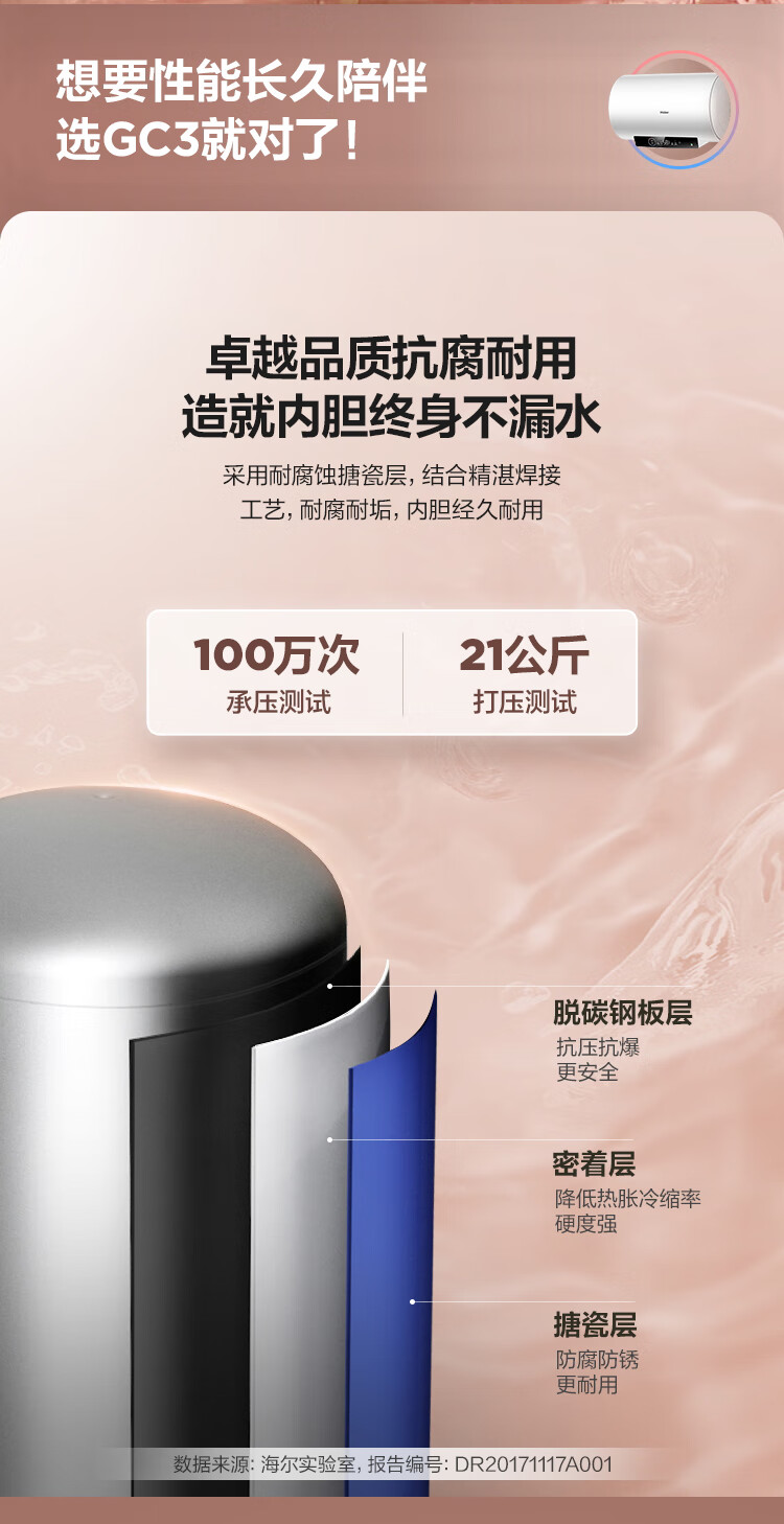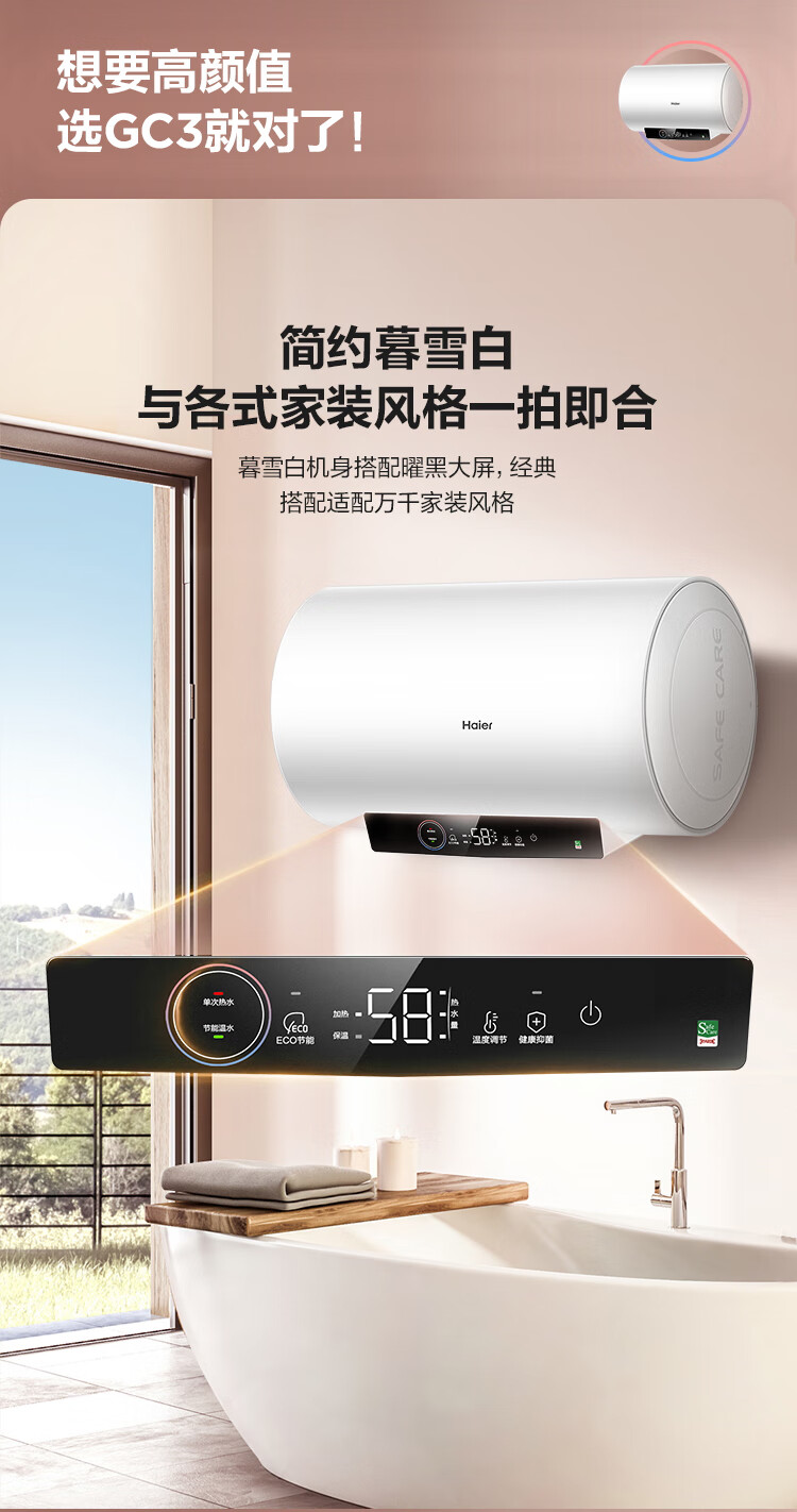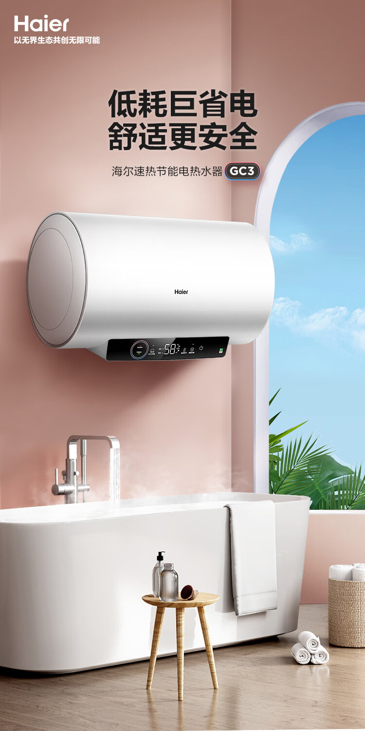 海尔(Haier)80升 电热水器 家用储水式 3000W大功率 高效加热 一级能效 长效保温 EC8001-GC3 *