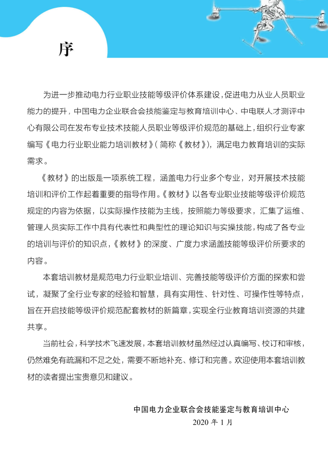 为进一步推动电力行业职业技能等级评价体系建设,促进电力从业人员职业能力的提升,中国电力企业联合会技能鉴定与教育培训中心、中电联人才测评中心有限公司在发布专业技术技能人员职业等级评价规范的基础上,组织行业专家编写电力行业职业能力培训系列教材(简称《教材》),满足电力教育培训的实际需求。