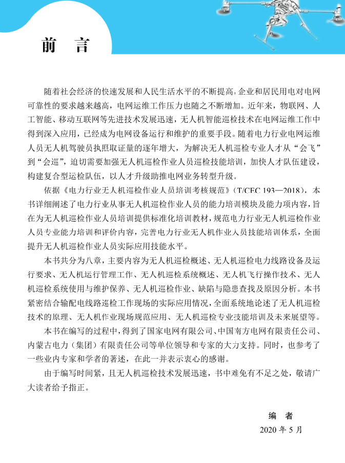 本书为电力行业无人机巡检作业人员能力等级考试必备教材,可作为巡检领域专业人员岗位培训、取证的辅导用书,也作为无人机巡检技能竞赛学习参考用书以及广大无人机爱好者和院校相关专业师生阅读参考书。