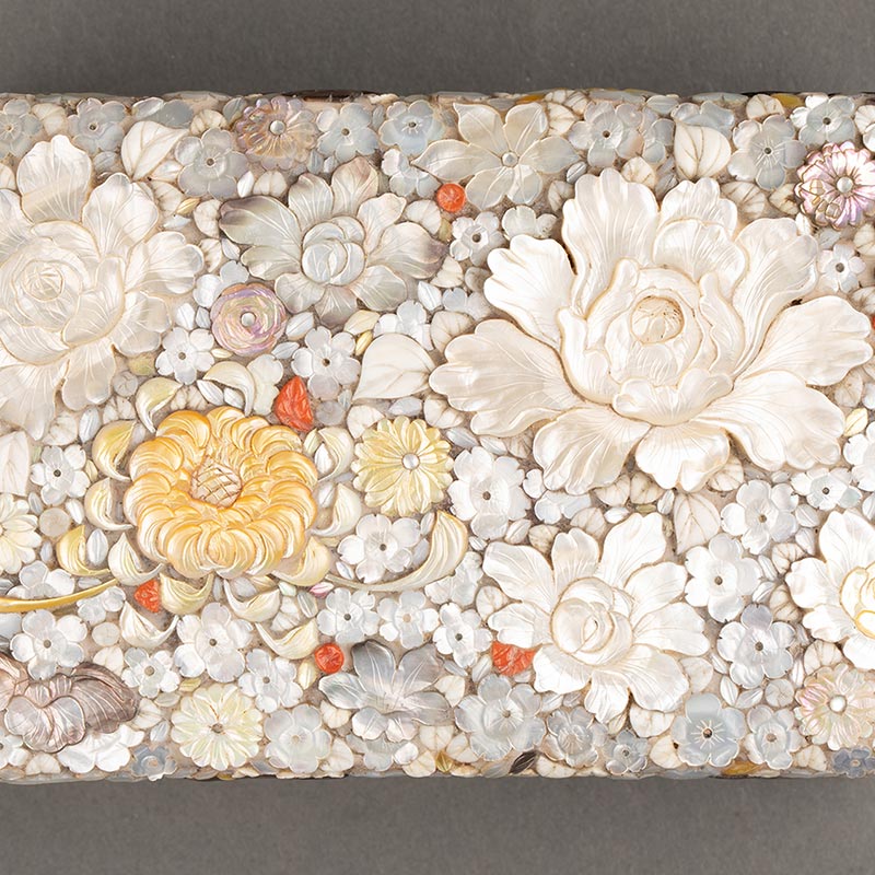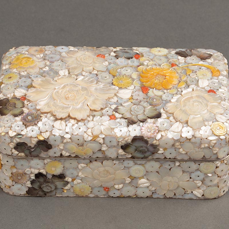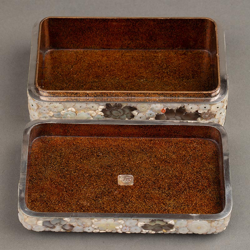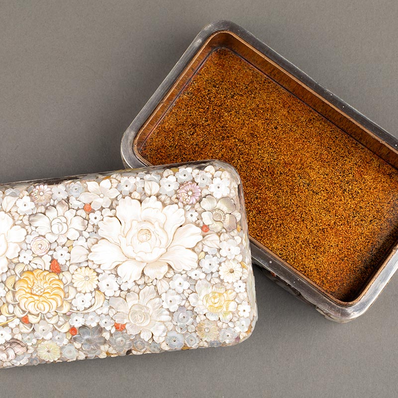 1868-1912年代日本明治时期出品梨地莳绘装饰千花纹样款芝山镶嵌珍宝盒