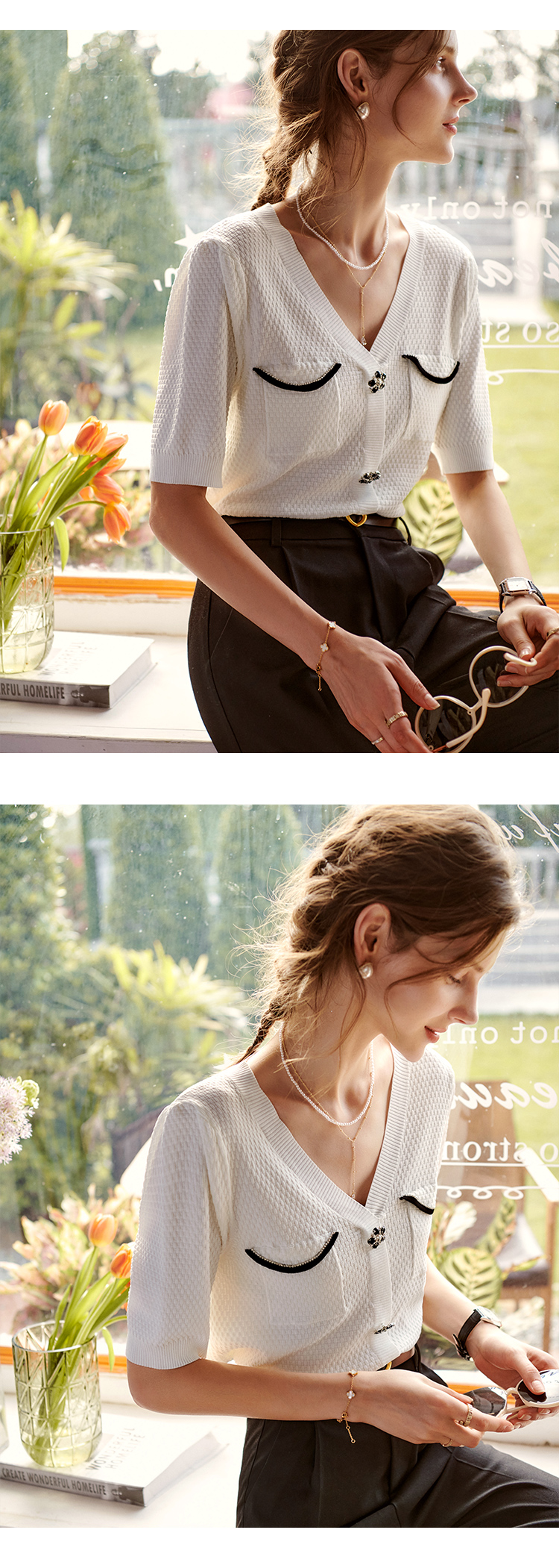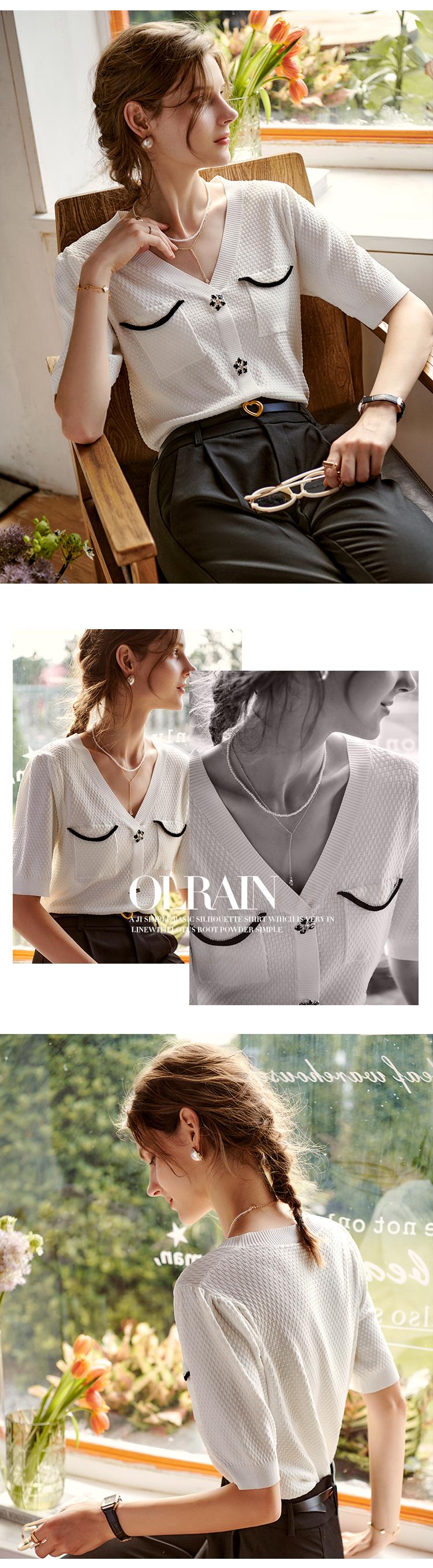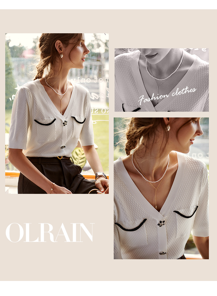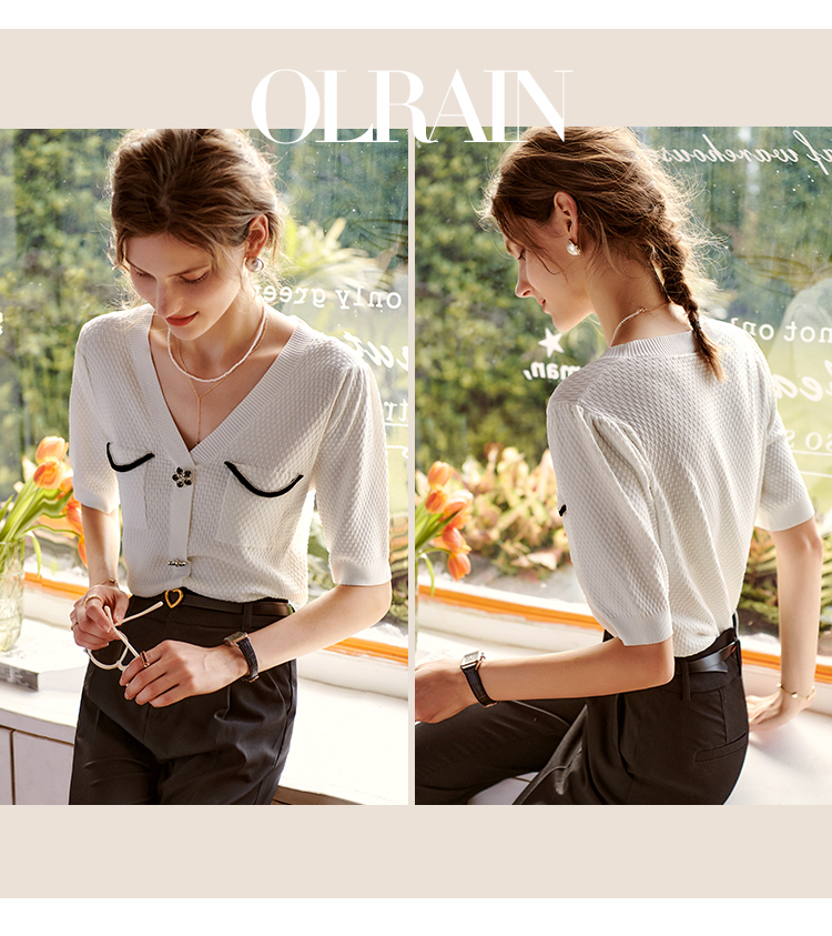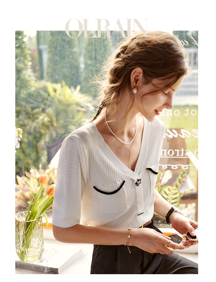 欧芮儿短袖针织衫女2021新款宽松气质小香风休闲撞色小衫上衣