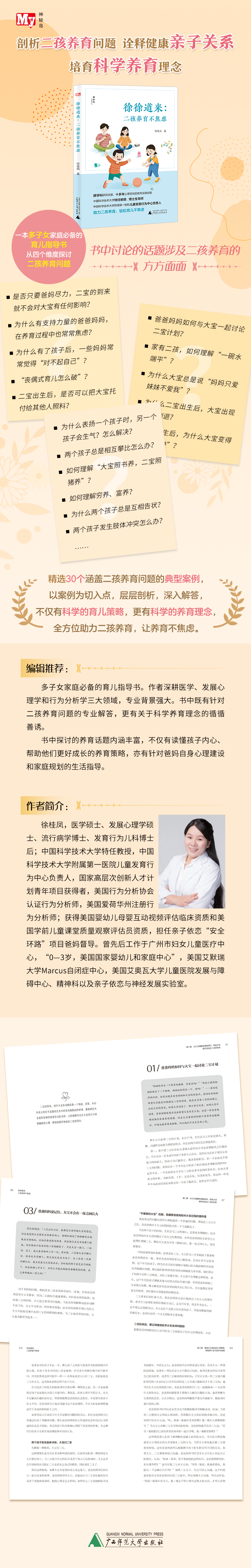 这是一本写给二孩爸妈的育儿书。作者以自己十多年心理咨询及教育实践所经手的案例入手,分析这些案例背后蕴含的二孩养育问题,并以医学、发展心理学、行为分析学知识作答,给出爸妈积极的建议。书中所呈现的问题涵盖了二孩养育的方方面面,如爸妈在二孩养育中如何做好工作和生活规划,更好地适应多子女的生活,如何理解孩子们在相处过程中所表现出来的各种行为,读懂他们的内心需求,帮助他们更好地相处与成长……作者的教育与实践背景横跨医学、发展心理学、行为分析学三大领域,其将自己多年所学与实践经验在书中完美融合,倾情道来,为二孩爸妈呈现了一本的育儿指导书。