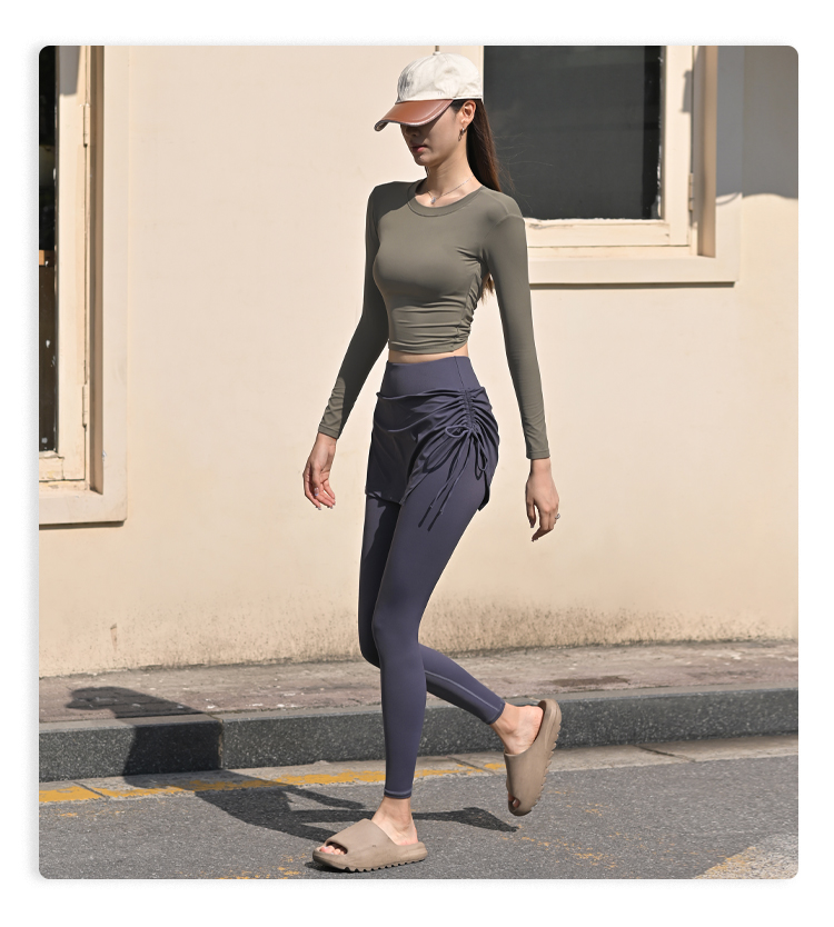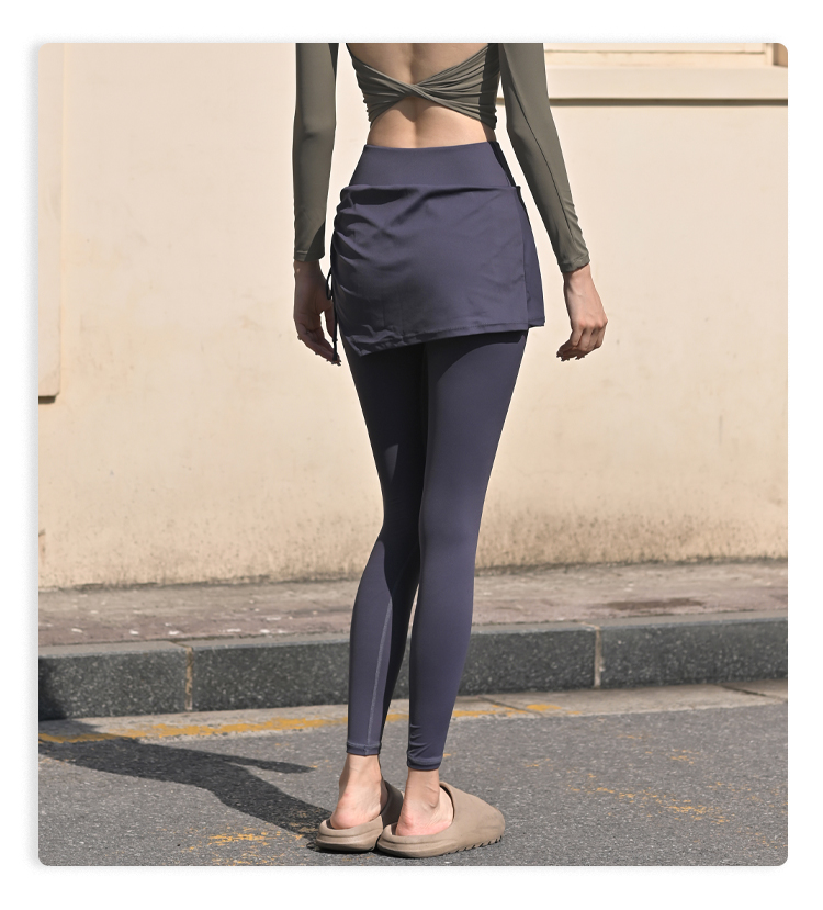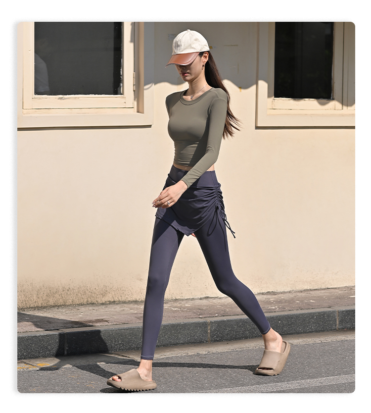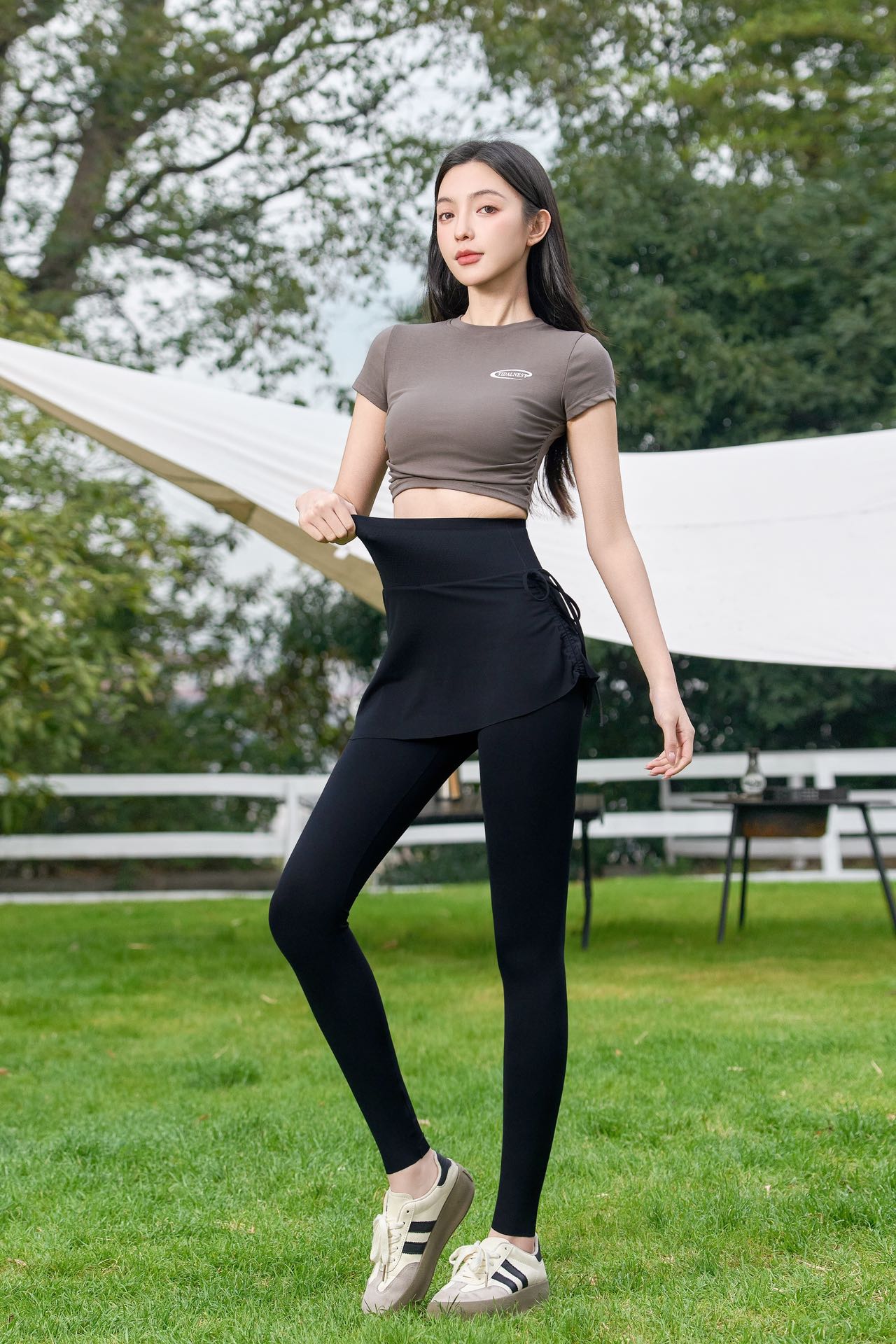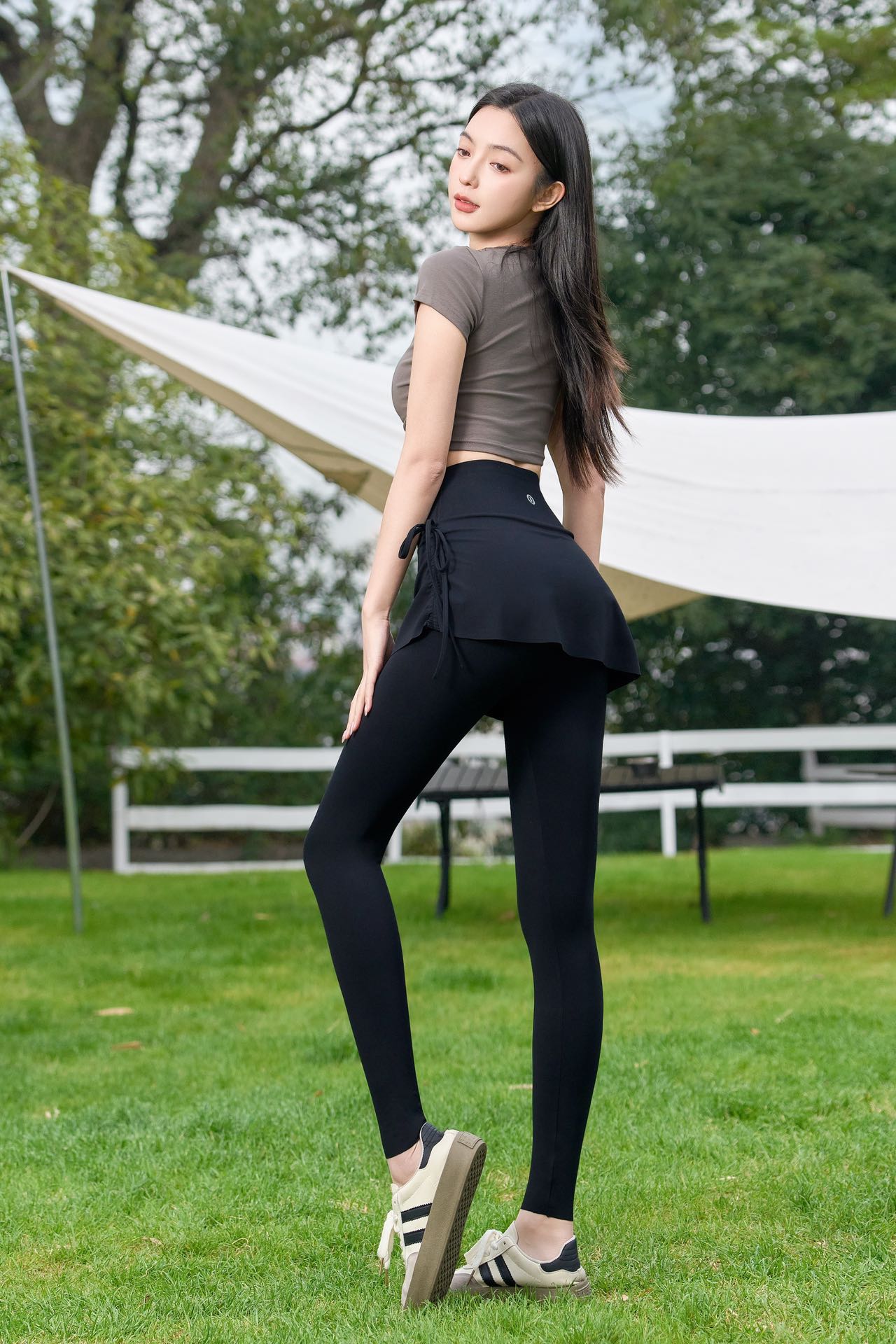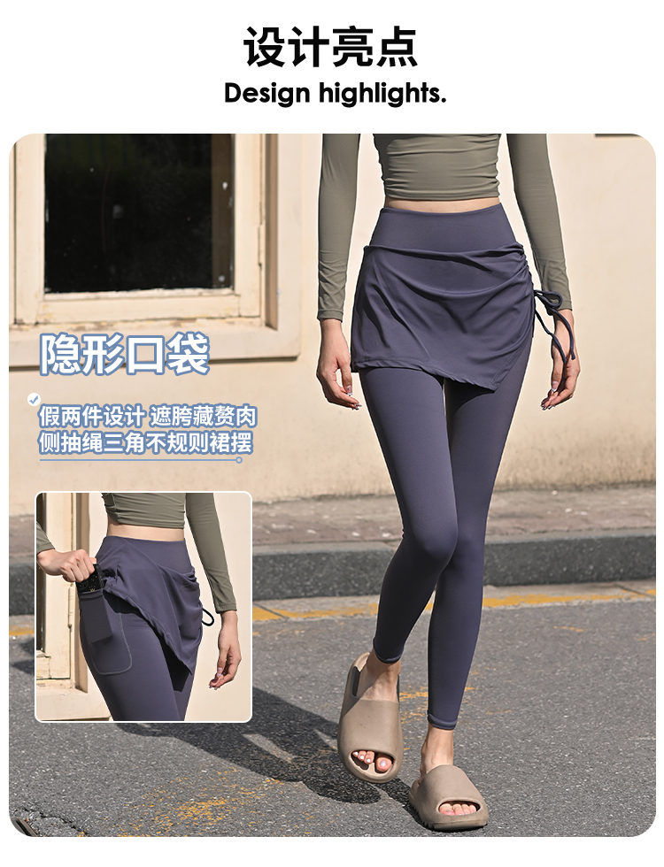 瑜伽裤这次是假两件的设计,通过拼接和剪裁营造“裙+裤”的叠穿效果