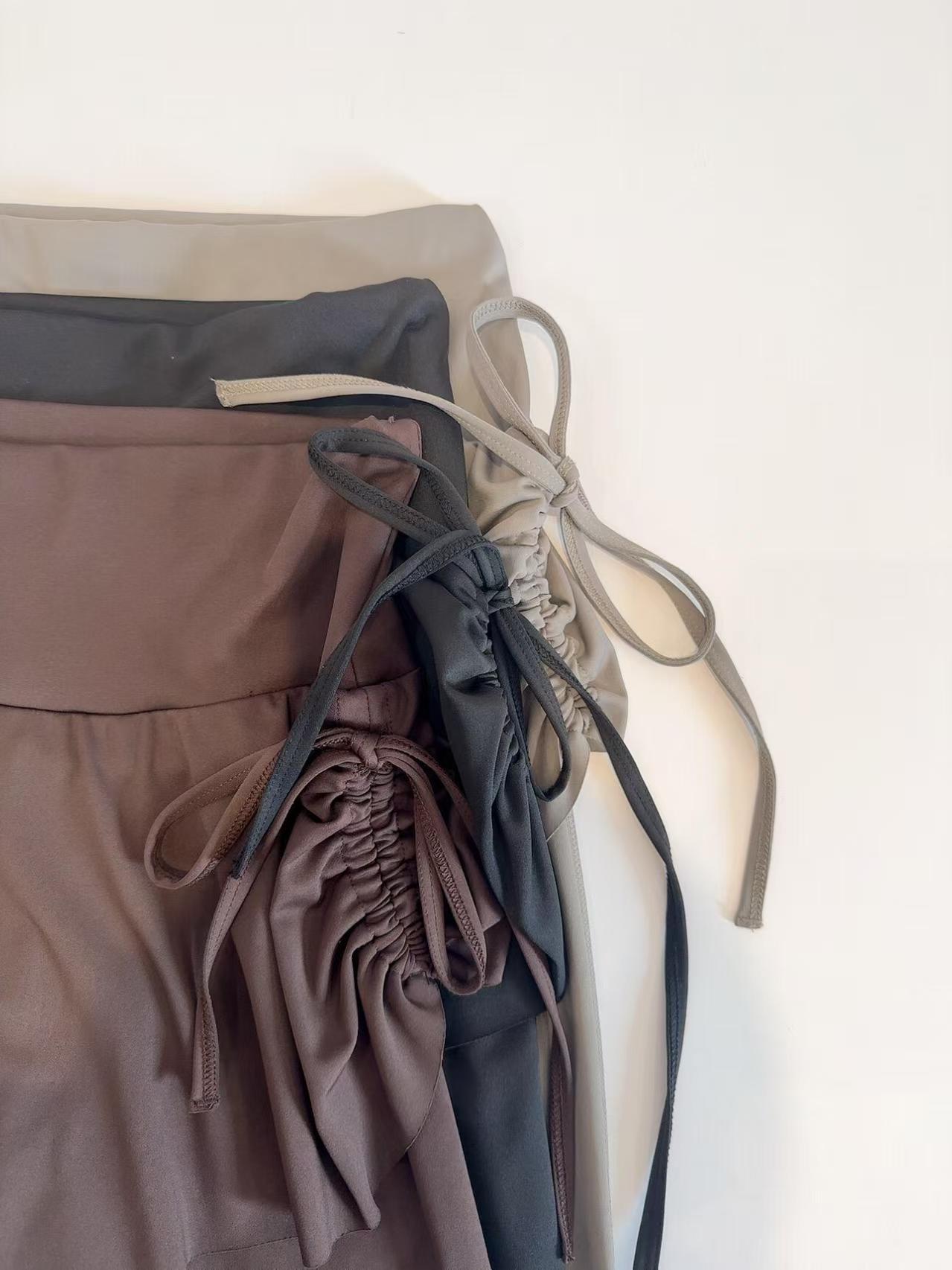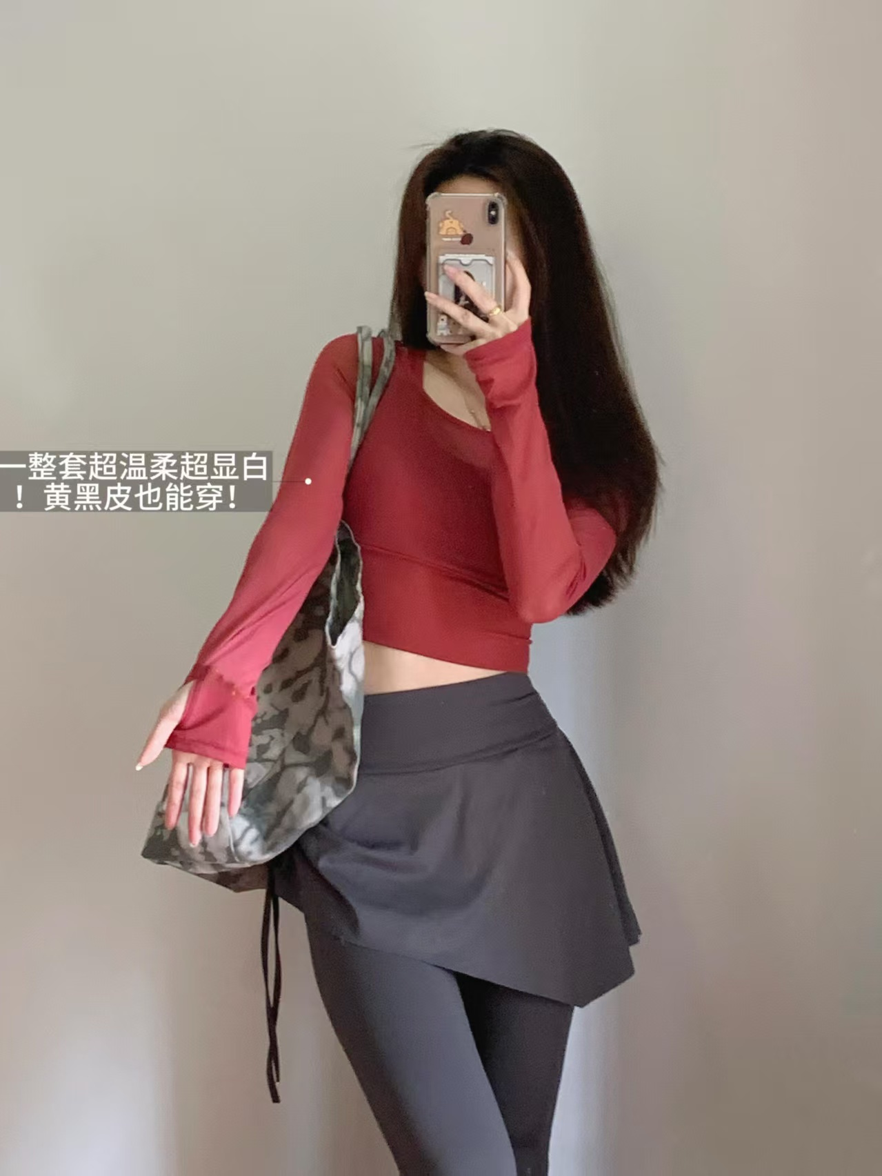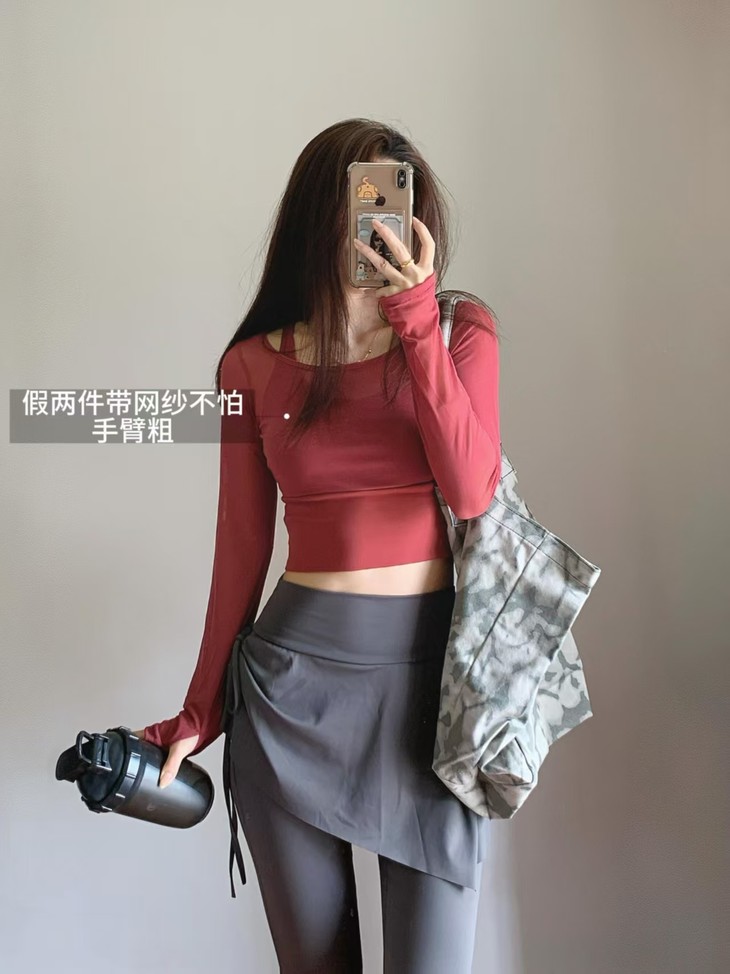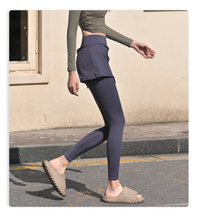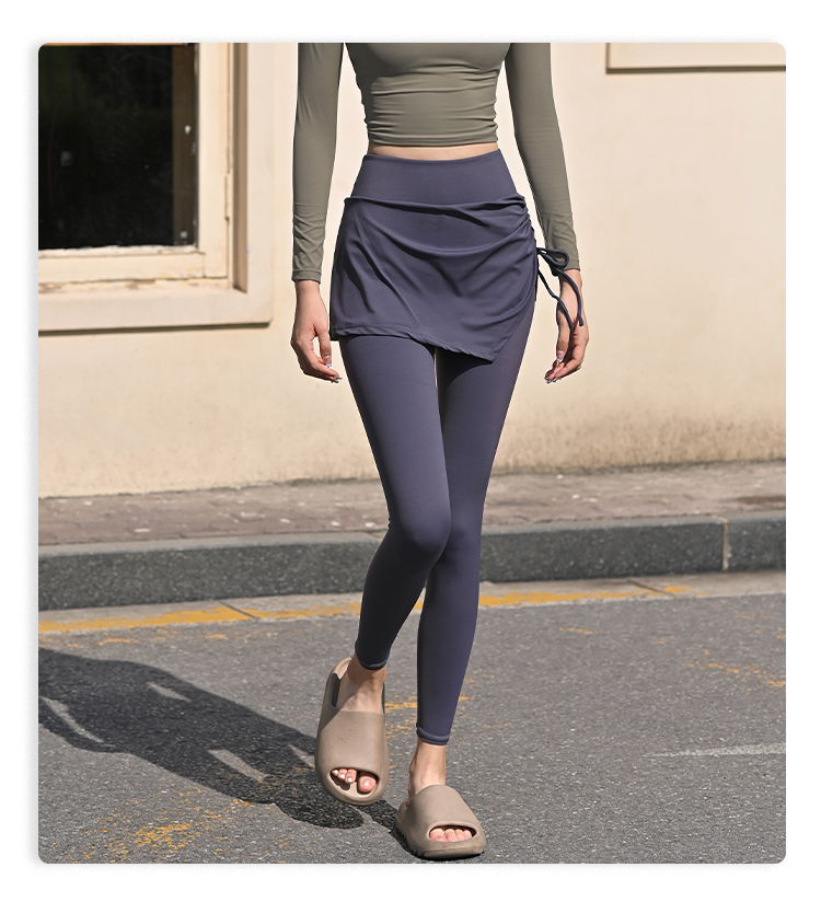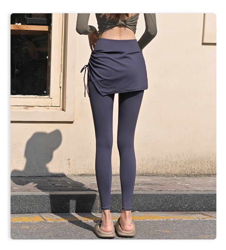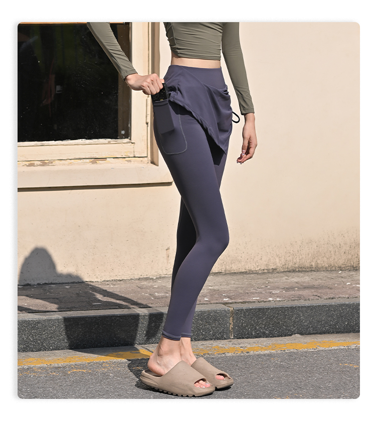 瑜伽裤这次是假两件的设计,通过拼接和剪裁营造“裙+裤”的叠穿效果