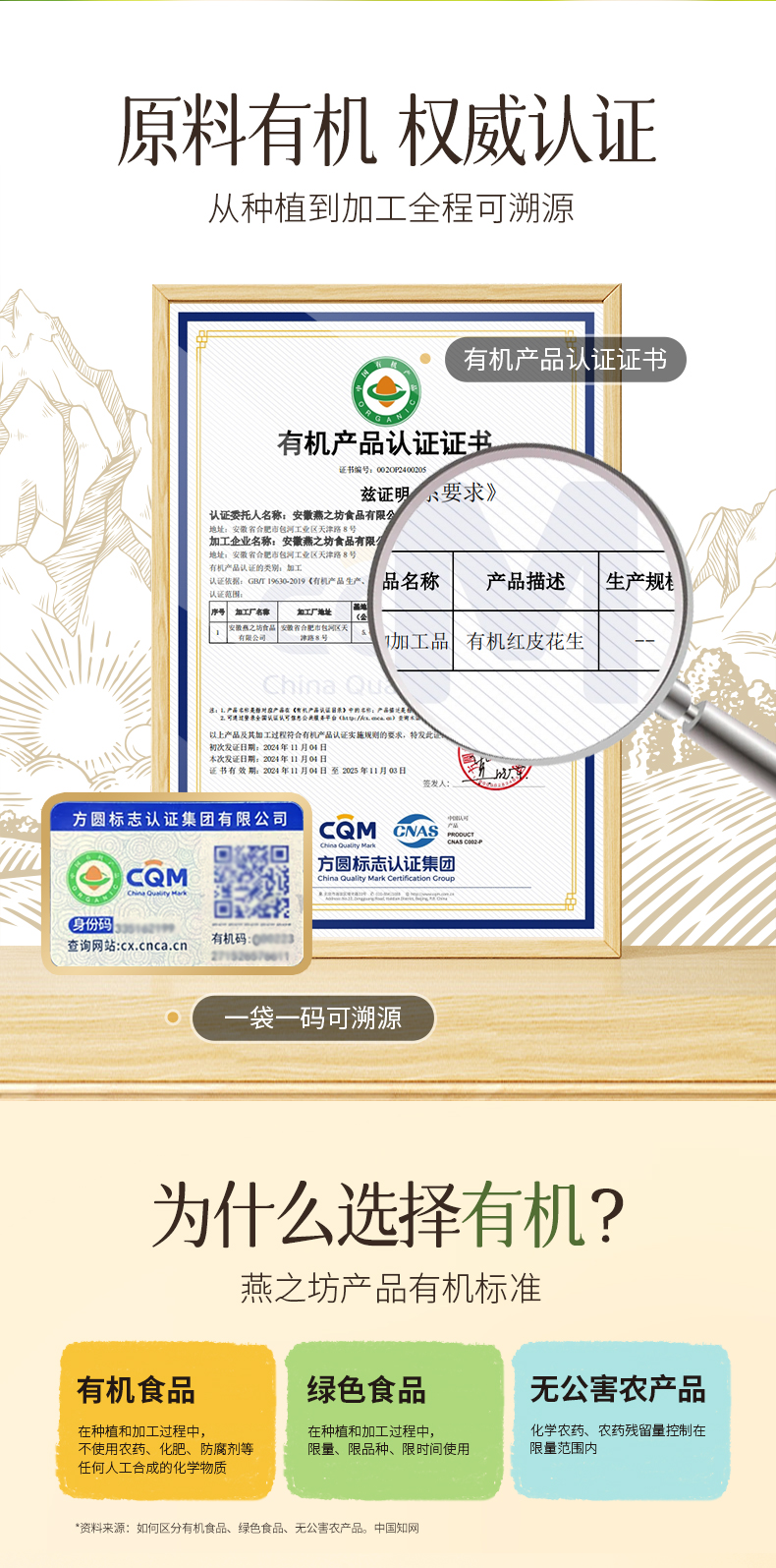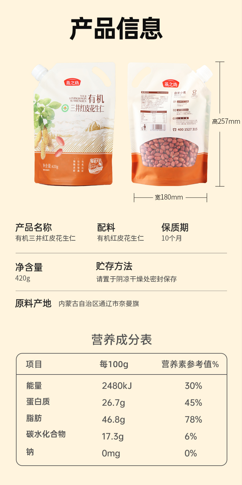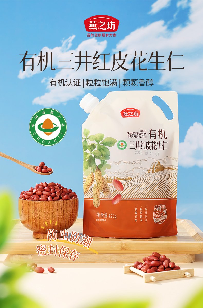 燕之坊 有机三井花生仁(立袋420g)原味去壳 红花生米 干货袋装 48小时发货